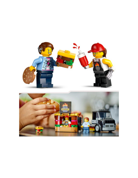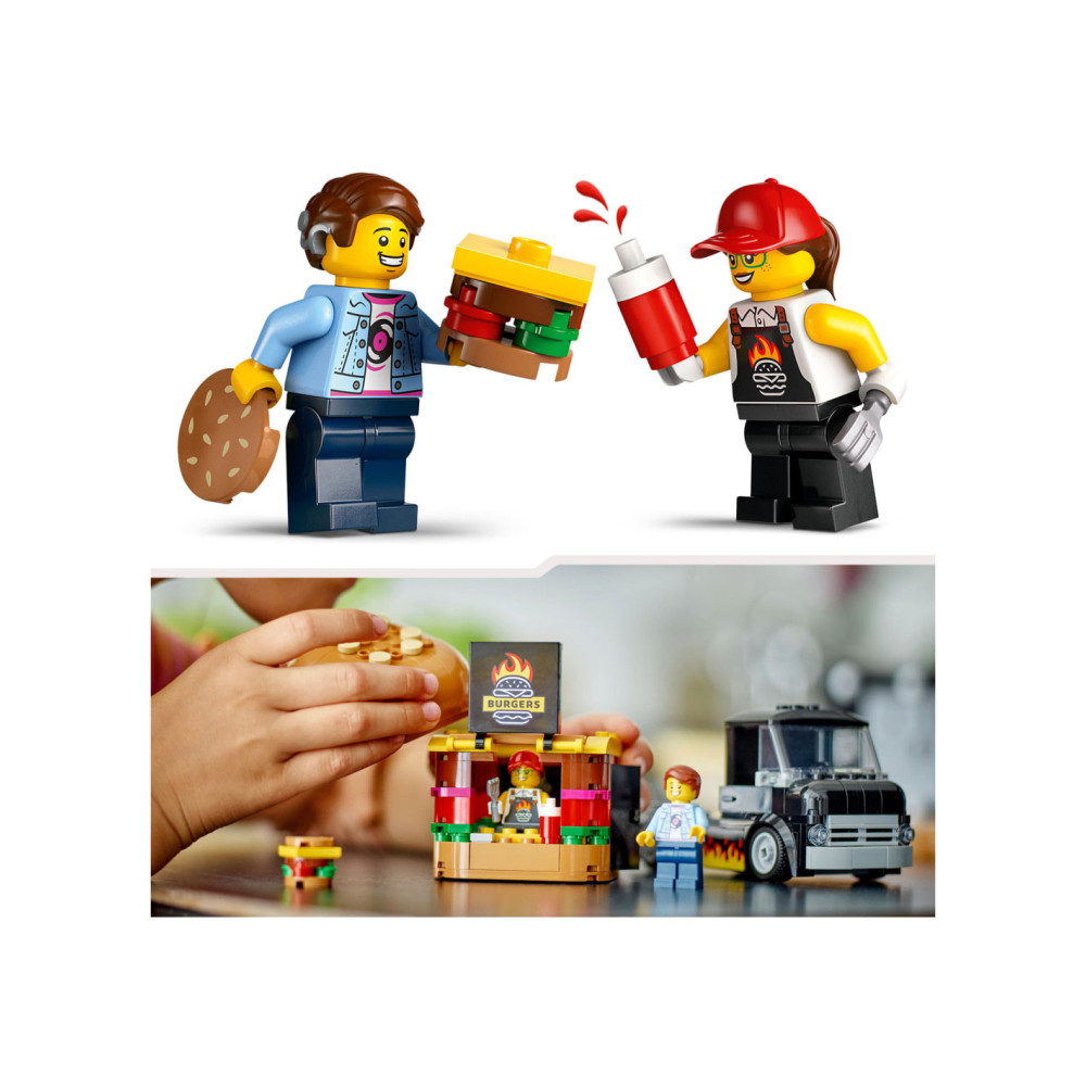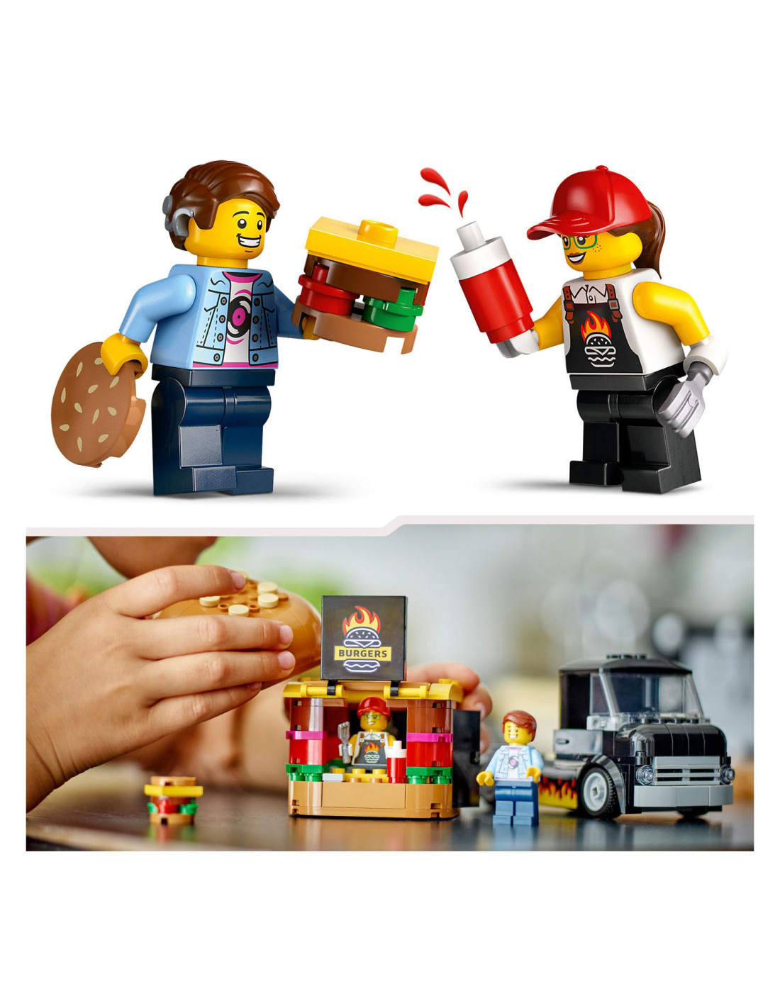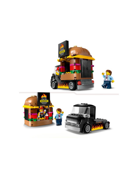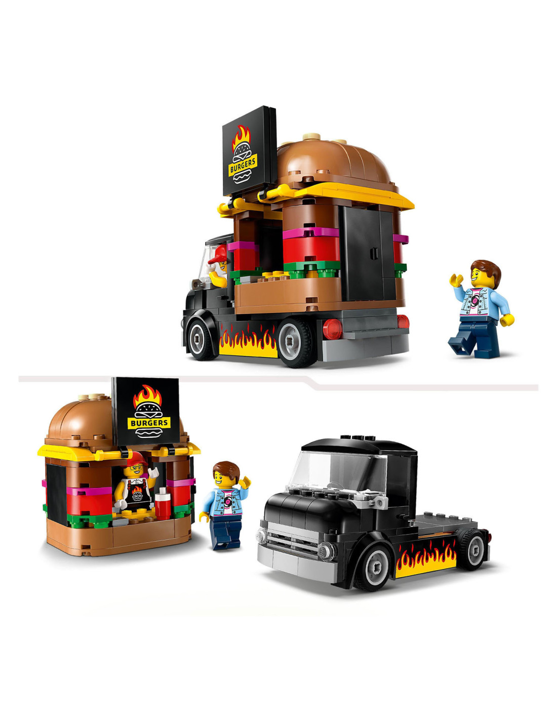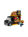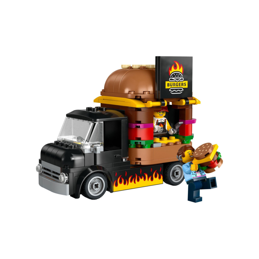 Deze LEGO City Hamburgertruck (60404) voor kinderen vanaf 5 jaar is een traktatie voor de jonge fantasie. Het mobiele fastfoodrestaurant ziet eruit als een gigantische burger en kan van de speelgoed vrachtwagen worden losgemaakt. Inclusief een keukengedeelte, sausflessen en een serviceluik dat open kan om een uithangbord te laten verschijnen. Deze keukenset bevat ook minifiguren van een verkoper en een klant met een gehoorapparaat, plus accessoires, zoals speelgoed eten.In de doos van dit LEGO truck speelgoed vind je bouwinstructies. Of gebruik de LEGO Builder app waar kinderen sets kunnen ontdekken en opslaan, hun bouwvoortgang kunnen bijhouden en kunnen zoomen en draaien om modellen vanuit alle hoeken te bekijken terwijl ze bouwen.Met LEGO City sets beleven kinderen volop actie met realistische modellen en leuke personages die fantasierijk speelplezier stimuleren. De sets zijn leuk om cadeau te geven en kunnen worden gecombineerd (andere sets zijn apart verkrijgbaar) voor een open wereld vol speelmogelijkheden. Een leuk cadeau voor jongens en meisjes vanaf 5 jaar die van LEGO voertuigen houden.Afmetingen: met het uithangbord omhoog is deze hamburgertruck ca. 10 cm hoog, 12 cm lang en 7 cm breed.Bevat 194 onderdelen.