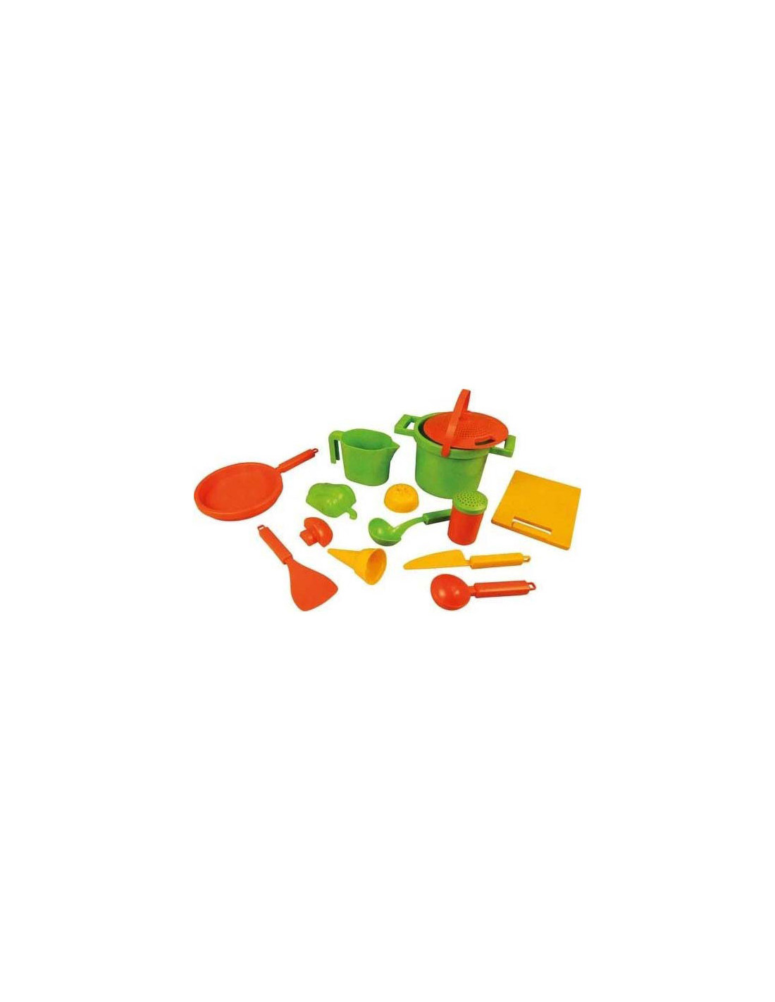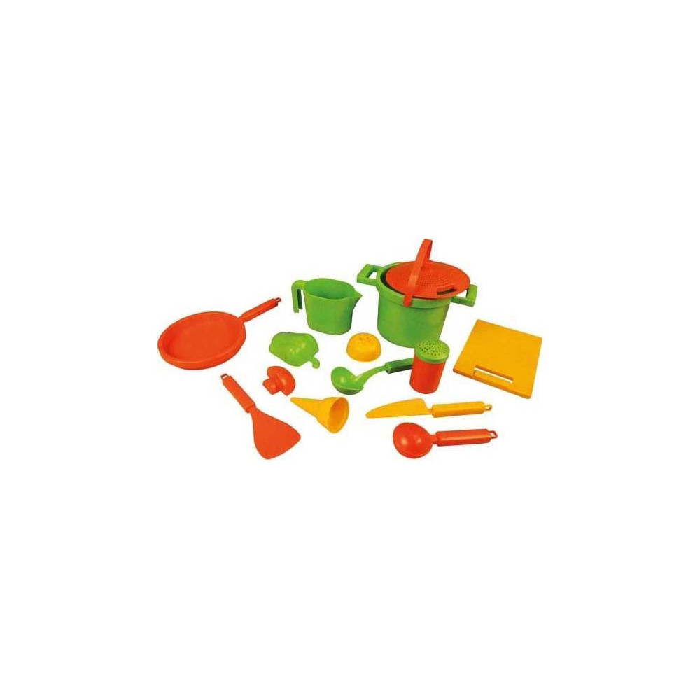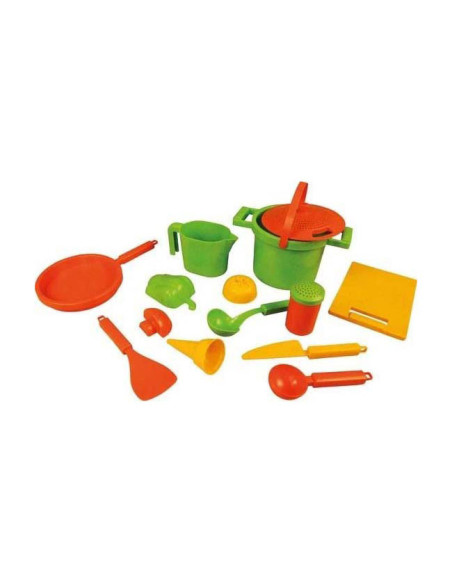Lena Zandbak Kookset, 14dlg. Met o.a. pannen, groentenvormen en diverse keukenaccessoires voor in de zandbak. Gemaakt van duurzaam materiaal.