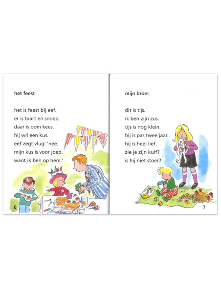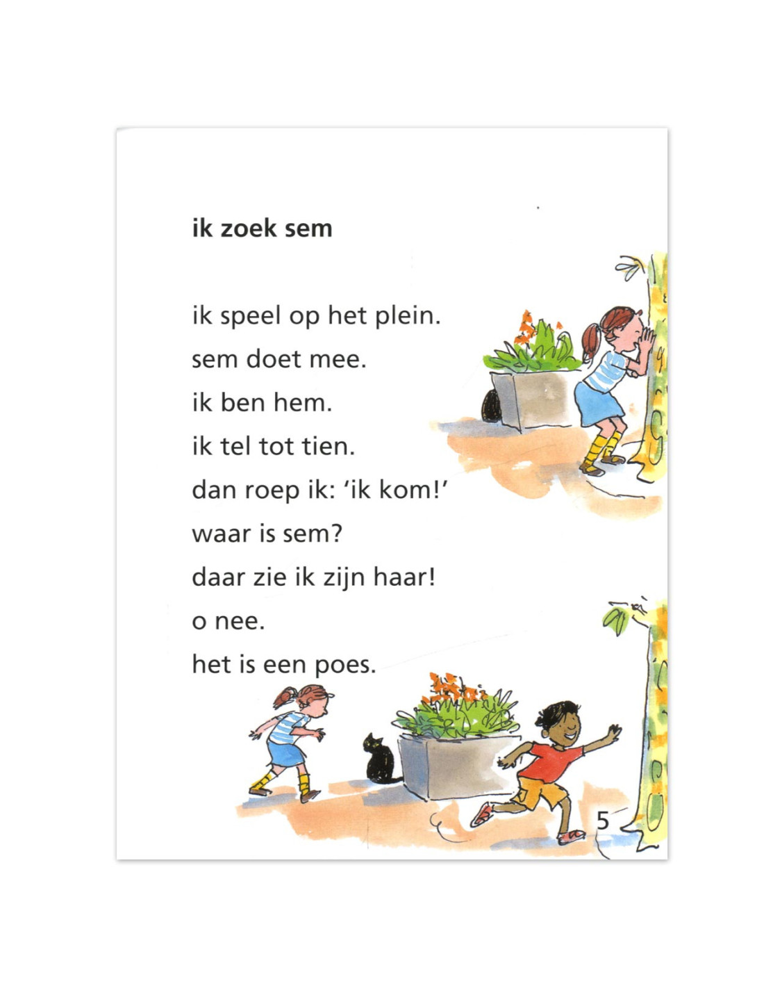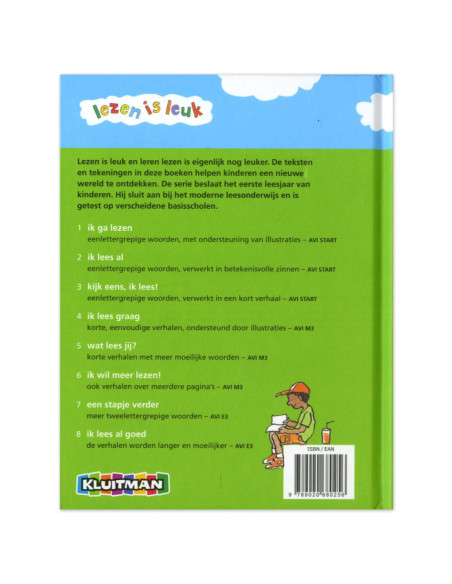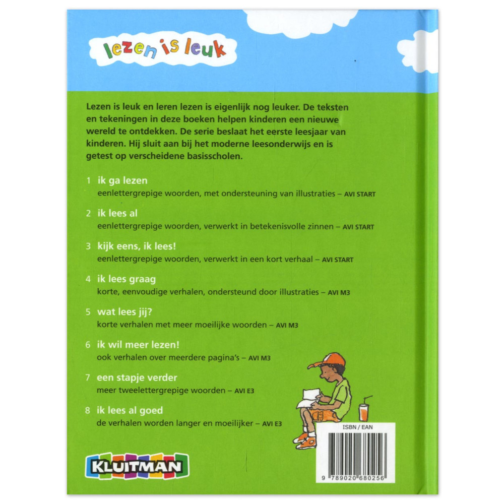 Lezen is leuk en leren lezen is eigenlijk nog leuker. De teksten en tekeningen in deze boeken helpen kinderen een nieuwe wereld te ontdekken. De serie beslaat het eerste leesjaar van kinderen. Hij sluit aan bij het moderne leesonderwijs en is getest op verschillende basisscholen. 1. ik ga lezen eenlettergrepige woorden met ondersteuning van illustraties - AVI-start 2. ik lees al eenlettergrepige woorden verwerkt in betekenisvolle zinnen - AVI start 3. kijk eens, ik lees! eenlettergrepige woorden verwerkt in een kort verhaal - AVI start 4. ik lees graag korte, eenvoudige verhalen, ondersteund door illustraties - AVI M3 5. wat lees jij? korte verhalen met meer moeilijke woorden - AVI M3 6. ik wil meer lezen! ook verhalen met meerdere pagina's - AVI M3 7. een stapje verder meer tweelettergrepige woorden - AVI E3 8. ik lees al goed de verhalen worden langer en moeilijker- AVI E3