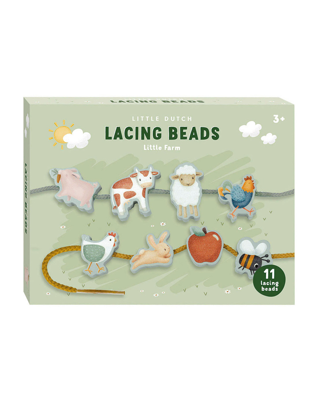 Little Dutch rijgkralen van de serie ‘Little Farm’. De set bestaat uit 2 rijgveters en 11 houten kralen in vormen van boerderijdieren en -vormen. Geschikt voor kinderen vanaf 3 jaar oud.