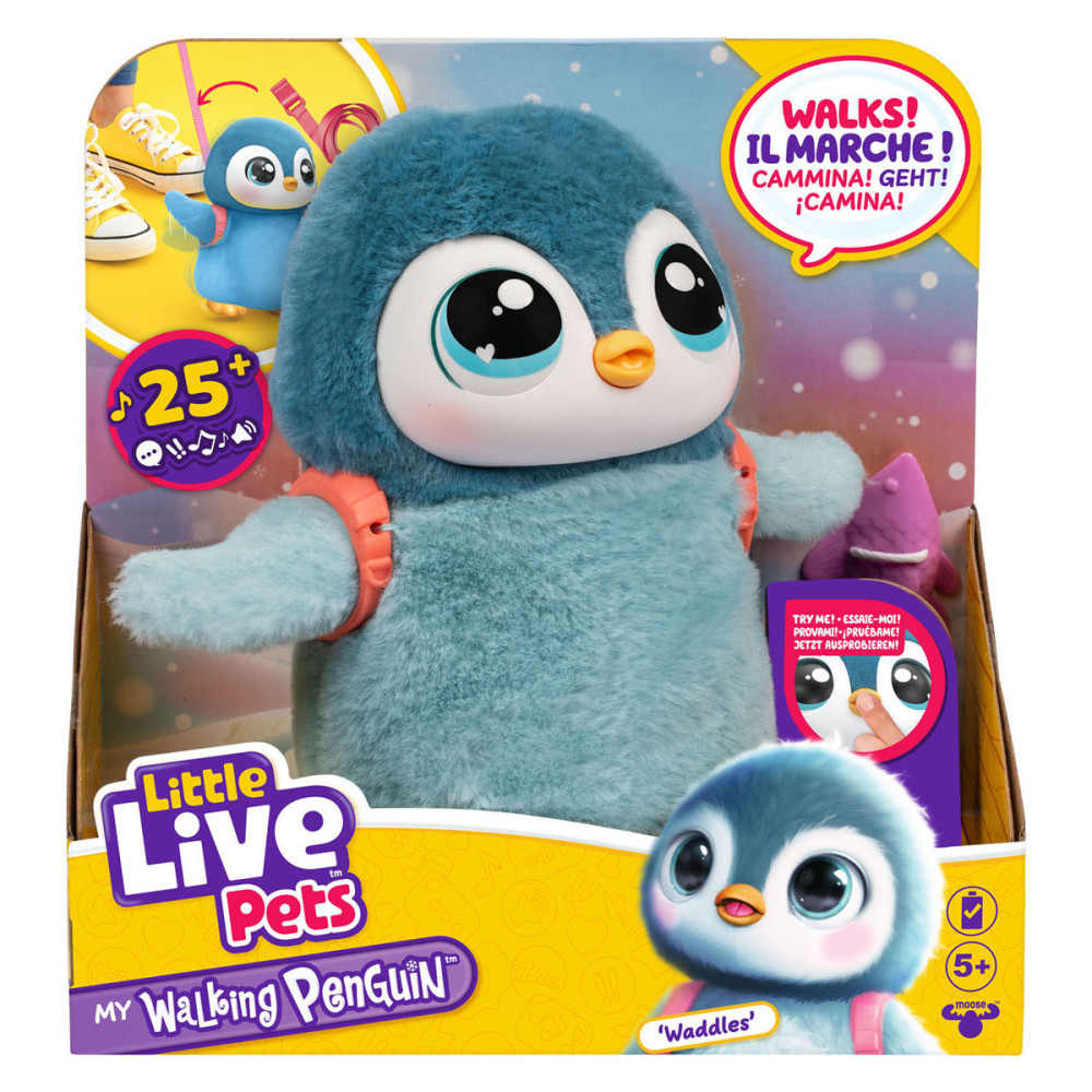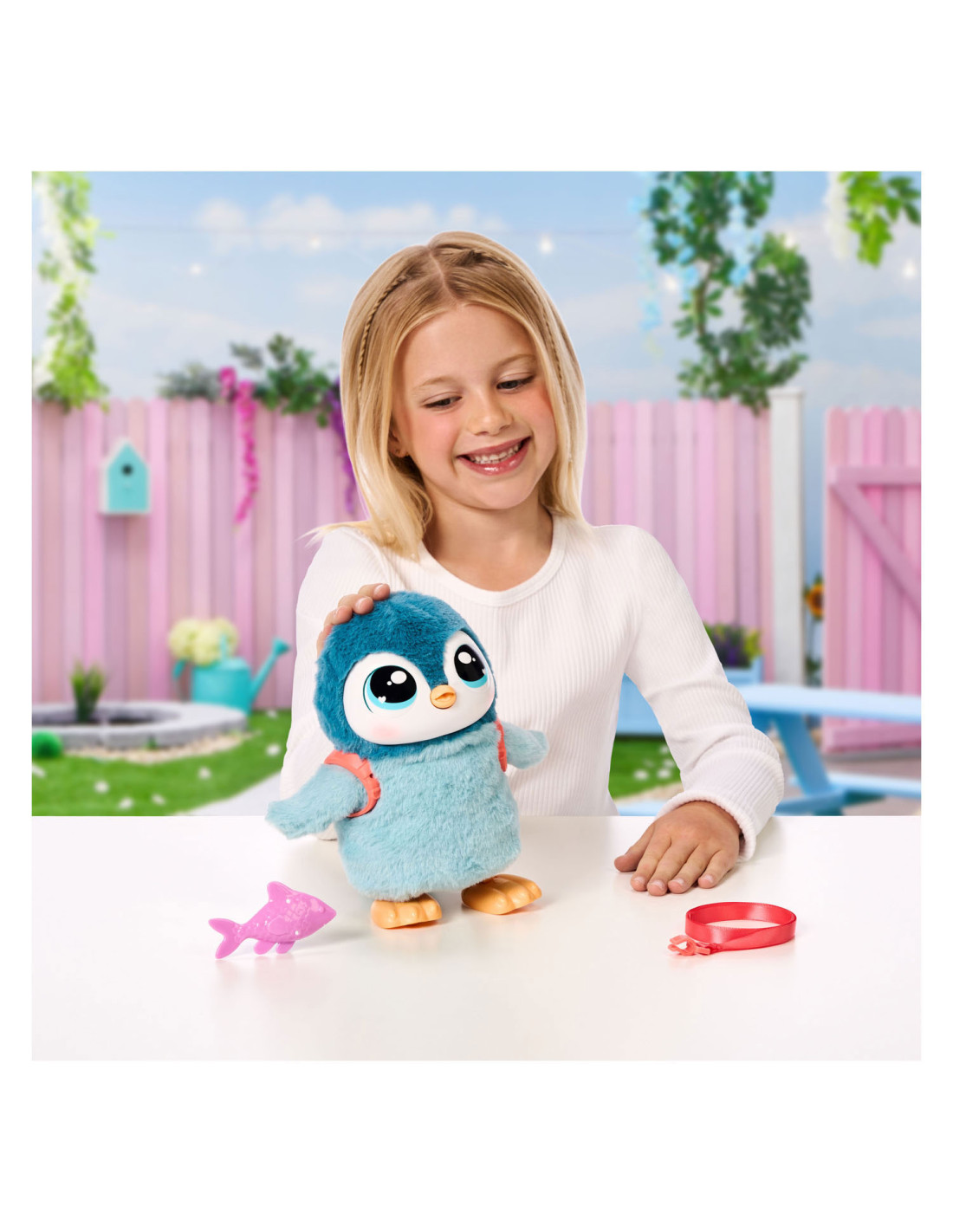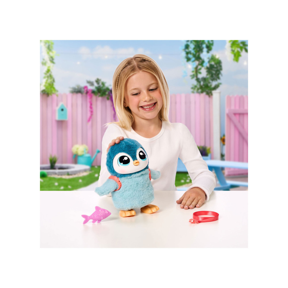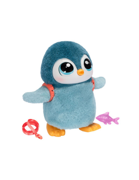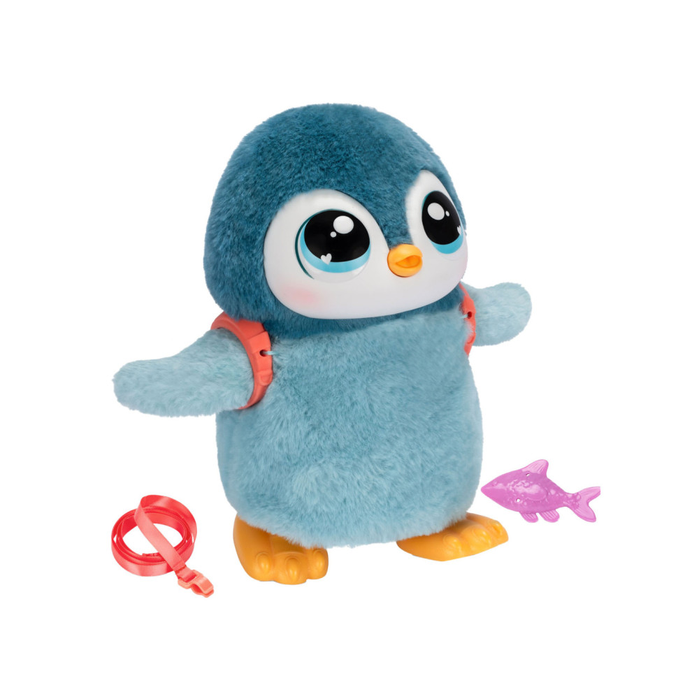 My Walking Penguin Waddles is niet alleen heel erg zacht, maar hij waggelt ook graag met jou mee! Waggles is een interactieve, wandelende pinguïn, die klinkt en beweegt net als een echte pinguïn. Voer hem met zijn vis en geef hem een knuffel terwijl hij reageert op jouw aanraking. Kijk hoe zijn vleugels flapperen en zijn hoofd beweegt terwijl hij loopt! Waggles maakt zoveel grappige en lieve geluiden: hij kan eten, giechelen, niesen en laat misschien zelfs een schattig scheetje! Met meer dan 25 geluiden en reacties is Waddles super interactief en schattig! Waggles heeft een zachte, pluizige vacht en vleugels die flapperen als hij loopt. Bevestig de riem om met hem te gaan wandelen of kijk hoe hij beweegt en danst op zijn eigen muziek. Waddles wordt geleverd met een afneembare riem, een zuigfles, een instructieboekje en ook de batterijen zijn inbegrepen, zodat hij klaar is om mee te spelen! Leeftijdsindicatie: 5 jaar+.Batterij informatie: 3 x AA batterijen (meegeleverd).