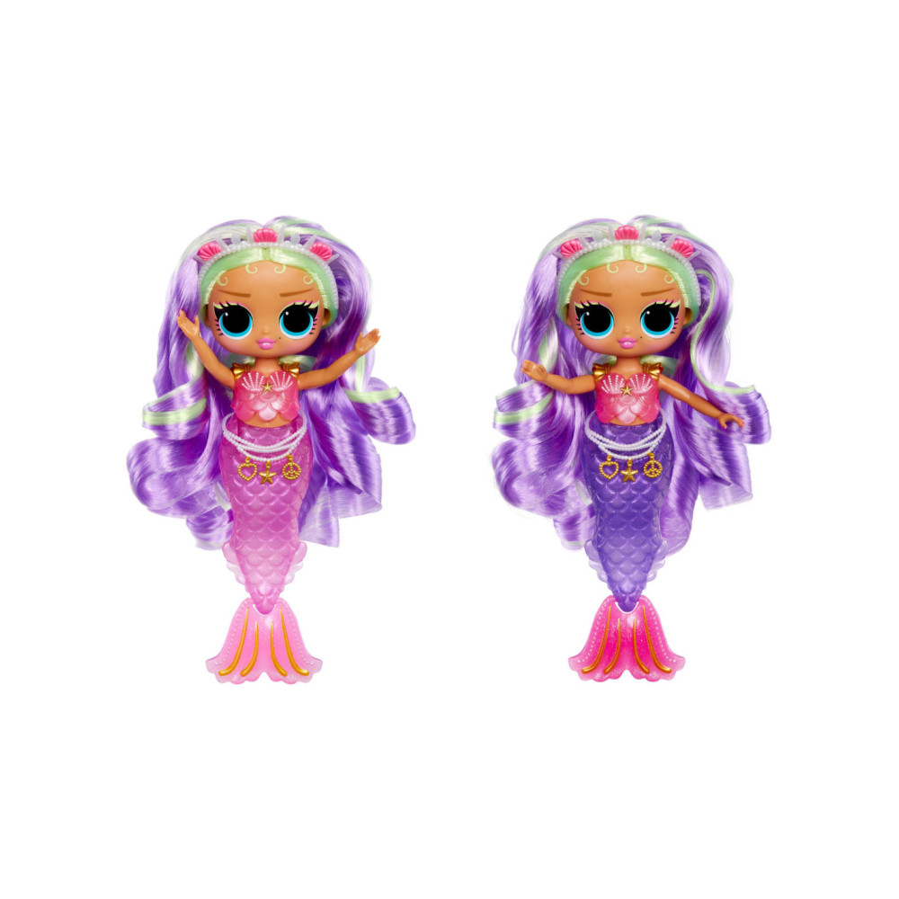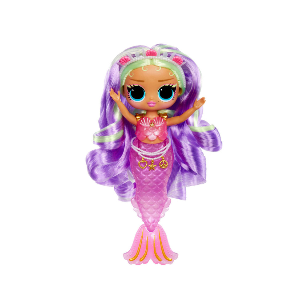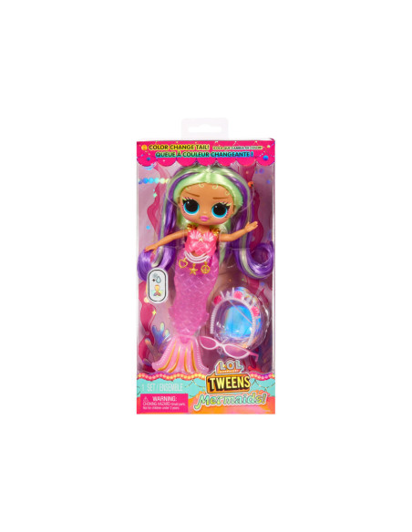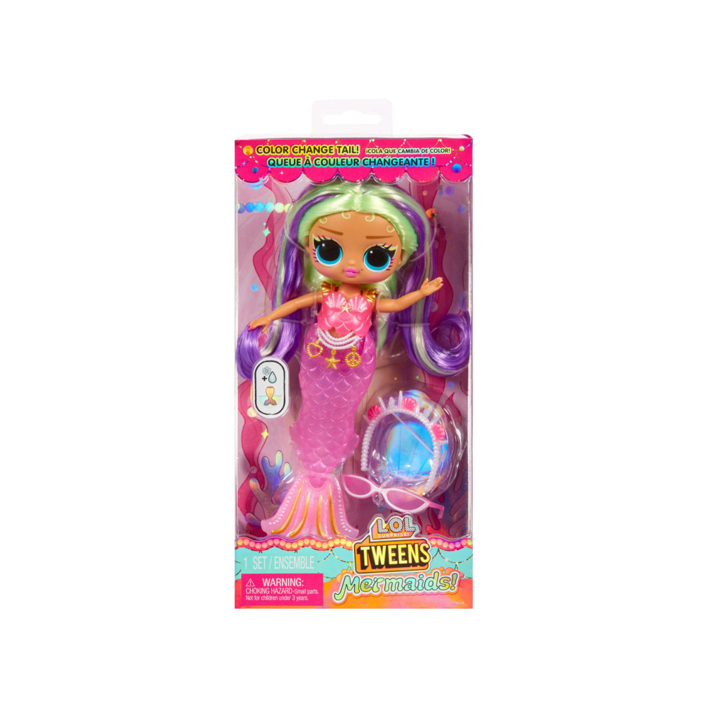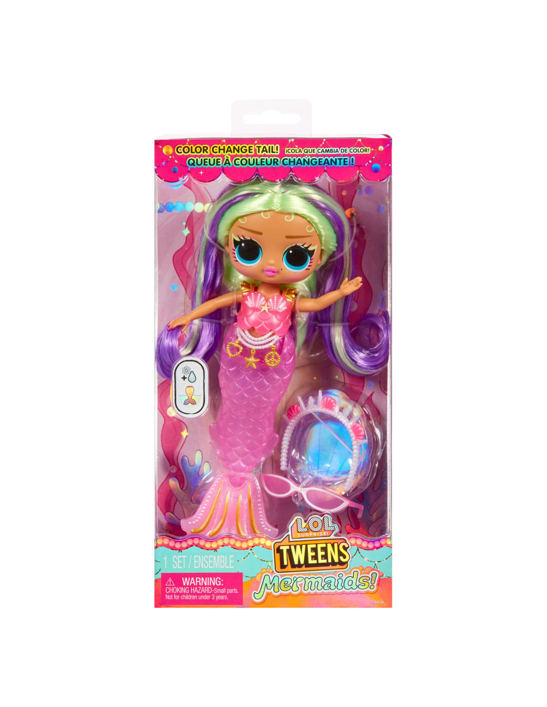 Duik in een betoverende wereld vol kleurenmagie en verrassingen met de gloednieuwe L.O.L. Surprise Tweens Mermaid Cleo Cove™-modepop met adembenemende accessoires om uit te pakken! Perfect voor in bad en om fantasierijk mee te spelen: het plezier spat ervanaf met Cleo Cove™ met haar schitterende staart met kleurverandering en betoverende vin die echt kan bewegen! Doop je Tweens Mermaid-pop in koud water en kijk hoe de kleur van haar staart verandert van magenta in dieppaars voor een magische onderwaterervaring! Kun jij raden in welke kleur haar lichtroze vin verandert? Vergeet niet om je pop te stylen met haar betoverende accessoires zoals haar zeebril, schelpentiara en schattige parelriem! Ze heeft een heel mooi gezichtje, prachtig haar, haar eigen modieuze zeemeerminnenlook en beweegbare ledematen voor heel veel houdingen. Ze kan bijvoorbeeld ook zitten! Ook kan ze stabiel op haar vin staan, waardoor je haar makkelijker kunt stylen! Ontdek wat er in elke doos zit, zoals een schitterende L.O.L. Surprise Tweens Mermaid-pop, bril, haarband en een riem die bij de staart van de pop past! Verzamel alle 4 de glamoureuze L.O.L. Surprise Tweens Mermaid-modepoppen: Cleo Cove™, Lola Waves™, Lana Marine™ en Serena Finn™ voor een complete set eindeloos veel zeemeerminplezier!