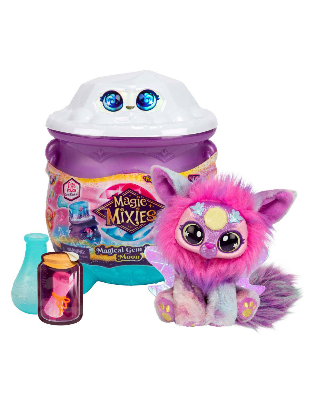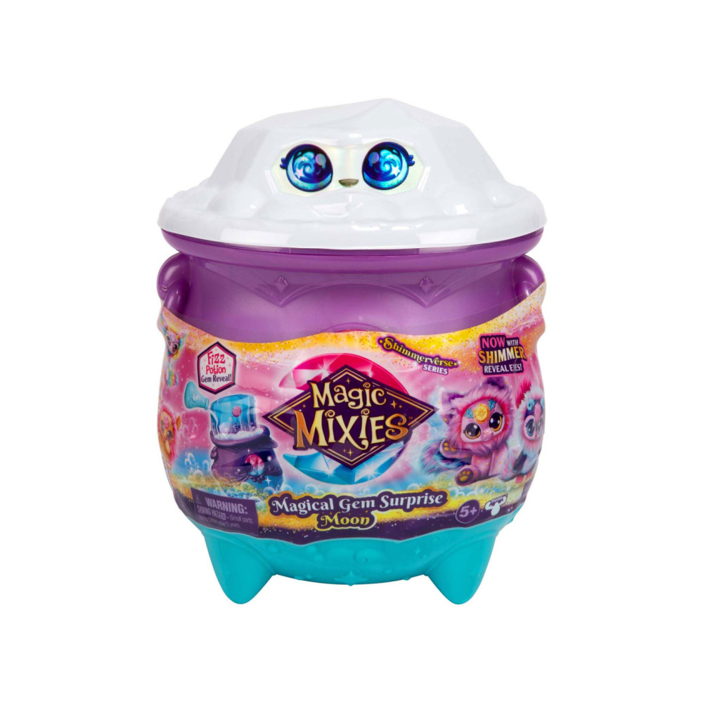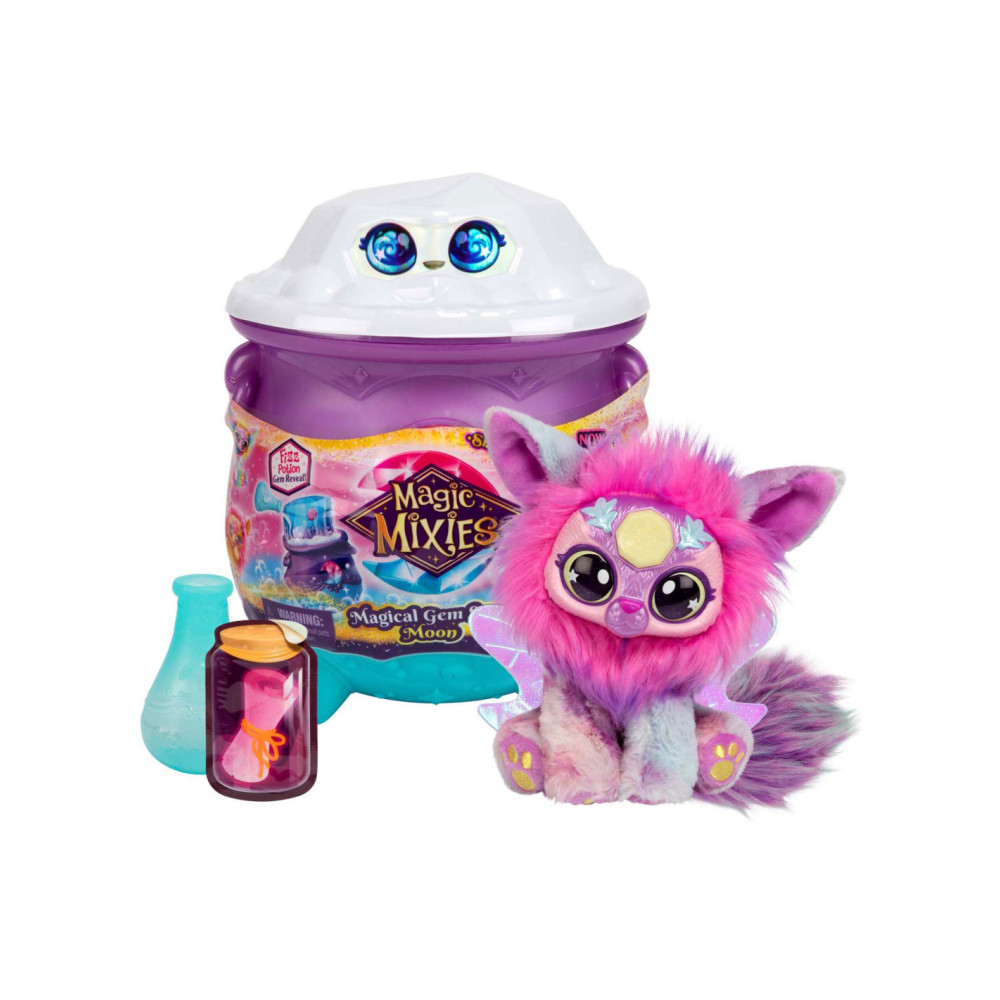 Begin de magie door Bubbel- en Bruisstof in de ketel te strooien. Schrijf de naam van je Mixie Plushie op de naamrol en laat deze erin vallen. Vul vervolgens het schenkflesje met water en voeg dit toe.... de Ketel borrelt en bruist voordat er een magische Edelsteen doos uit de bovenkant van de Ketel springt - WOW! Wanneer je de Edelsteen doos opent, ontdek je 1 van de 2 maanmagische Mixie Plushies met een bijpassende Ring! Ontdek de magie van het maanelement. Druk op de kristallen edelsteen op het voorhoofd van je Magic Mixies Plushie en kantel deze naar voren en naar achteren om het glanseffect in de ogen te zien! Gebruik de Edelsteen doos om je Mixie Plushie of andere persoonlijke bezittingen in op te bergen. Er zijn twee maanmagische Mixie Plushies te verzamelen. Leeftijdsindicatie: 5 jaar+.