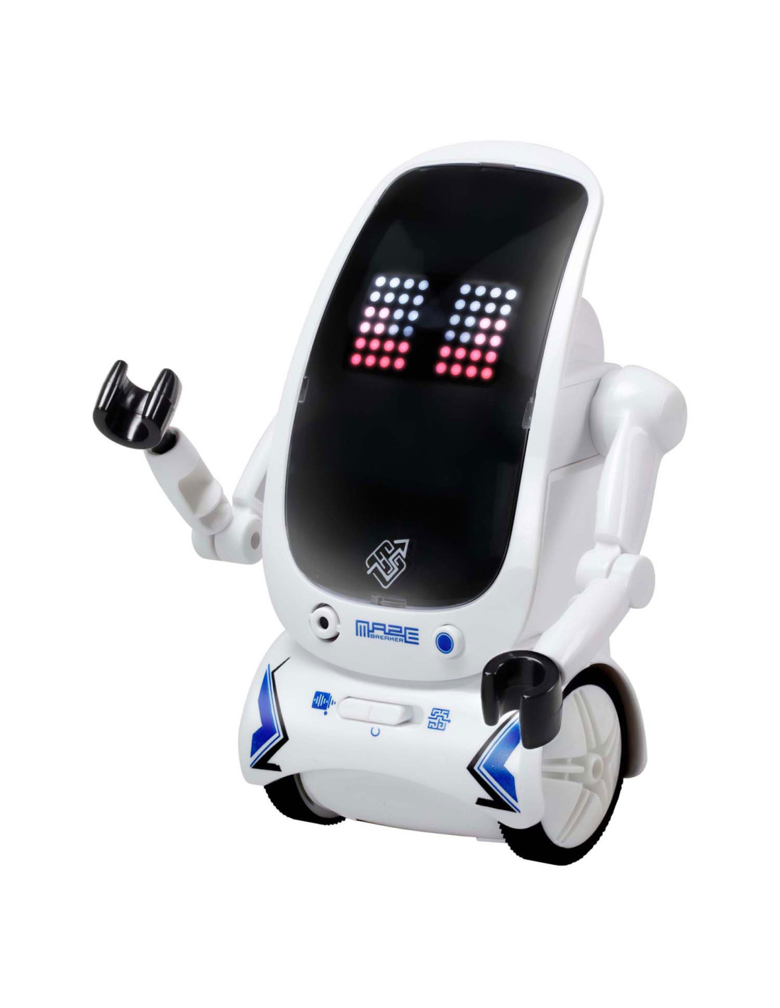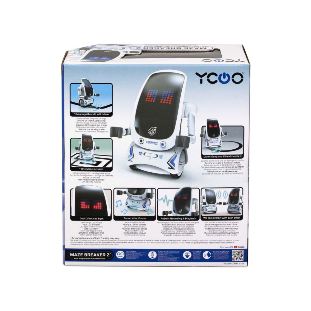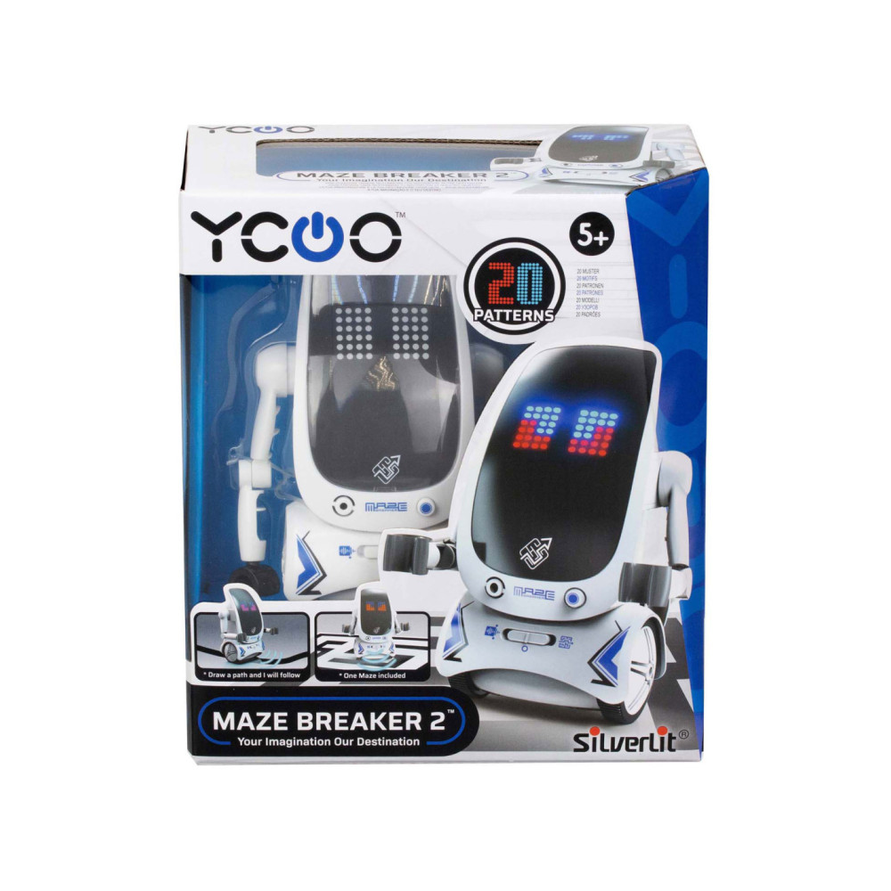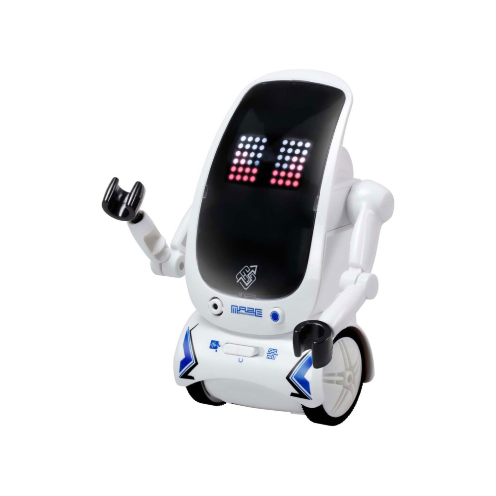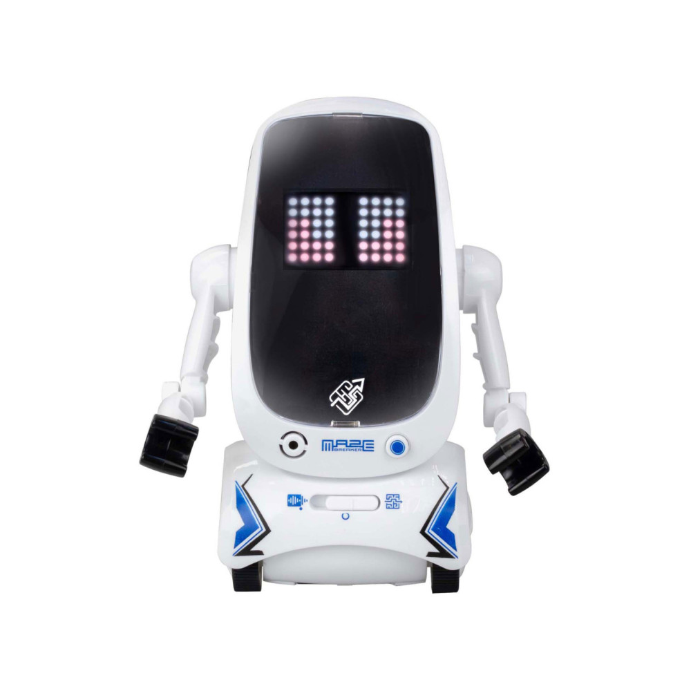 De nieuwe Maze Breaker 2 heeft een totaal nieuw uiterlijk met een groot LED gezicht! Maze Breaker 2 beweegt zich alle kanten op en zijn gezicht geeft licht in verschillende kleuren, in wel 20 verschillende patronen! Hij heeft een opname functie, waarmee je telkens tot max. 3 teksten kunt opnemen. De opnames zal hij met robotstem herhalen. Tevens is hij voorzien van verschillende sound effects en muziekjes. Wat Maze breaker uniek maakt is het feit dat hij een pad kan volgen én zich door een doolhof kan voortbewegen! Een doolhof is meegeleverd in de verpakking. Zet je Maze Breakers bij elkaar en ze zullen met elkaar communiceren en dansen.