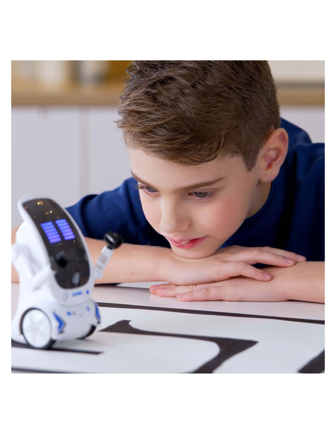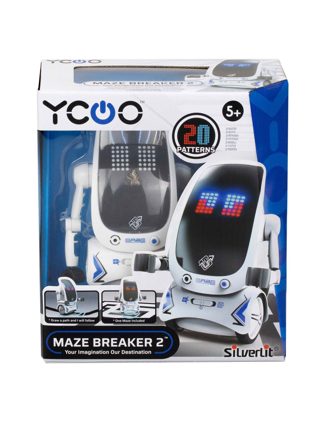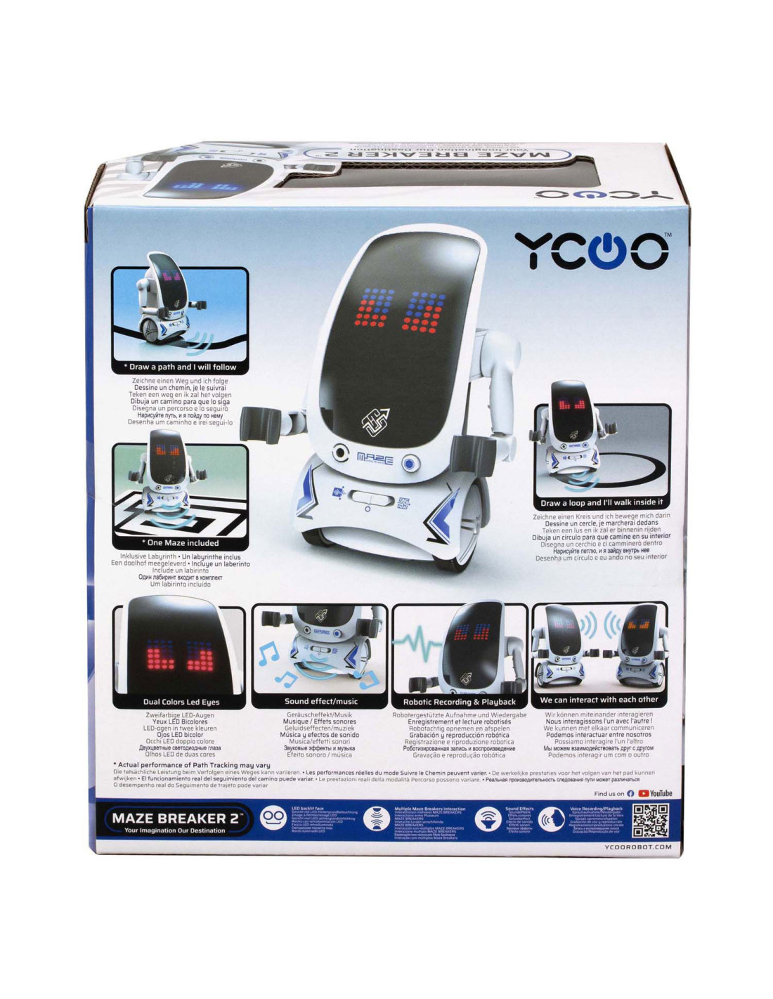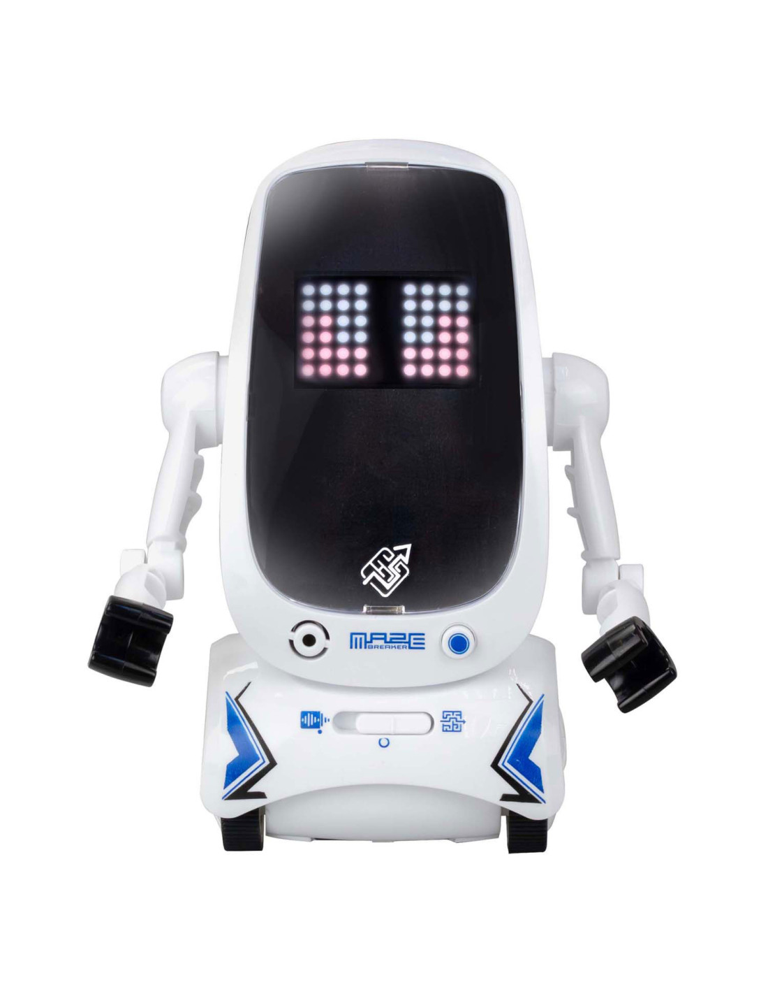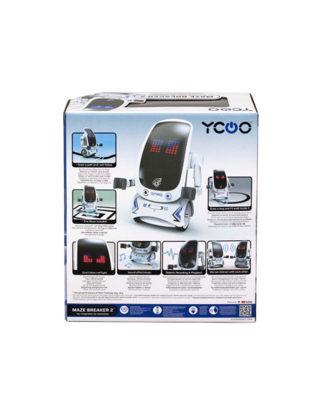 De nieuwe Maze Breaker 2 heeft een totaal nieuw uiterlijk met een groot LED gezicht! Maze Breaker 2 beweegt zich alle kanten op en zijn gezicht geeft licht in verschillende kleuren, in wel 20 verschillende patronen! Hij heeft een opname functie, waarmee je telkens tot max. 3 teksten kunt opnemen. De opnames zal hij met robotstem herhalen. Tevens is hij voorzien van verschillende sound effects en muziekjes. Wat Maze breaker uniek maakt is het feit dat hij een pad kan volgen én zich door een doolhof kan voortbewegen! Een doolhof is meegeleverd in de verpakking. Zet je Maze Breakers bij elkaar en ze zullen met elkaar communiceren en dansen.