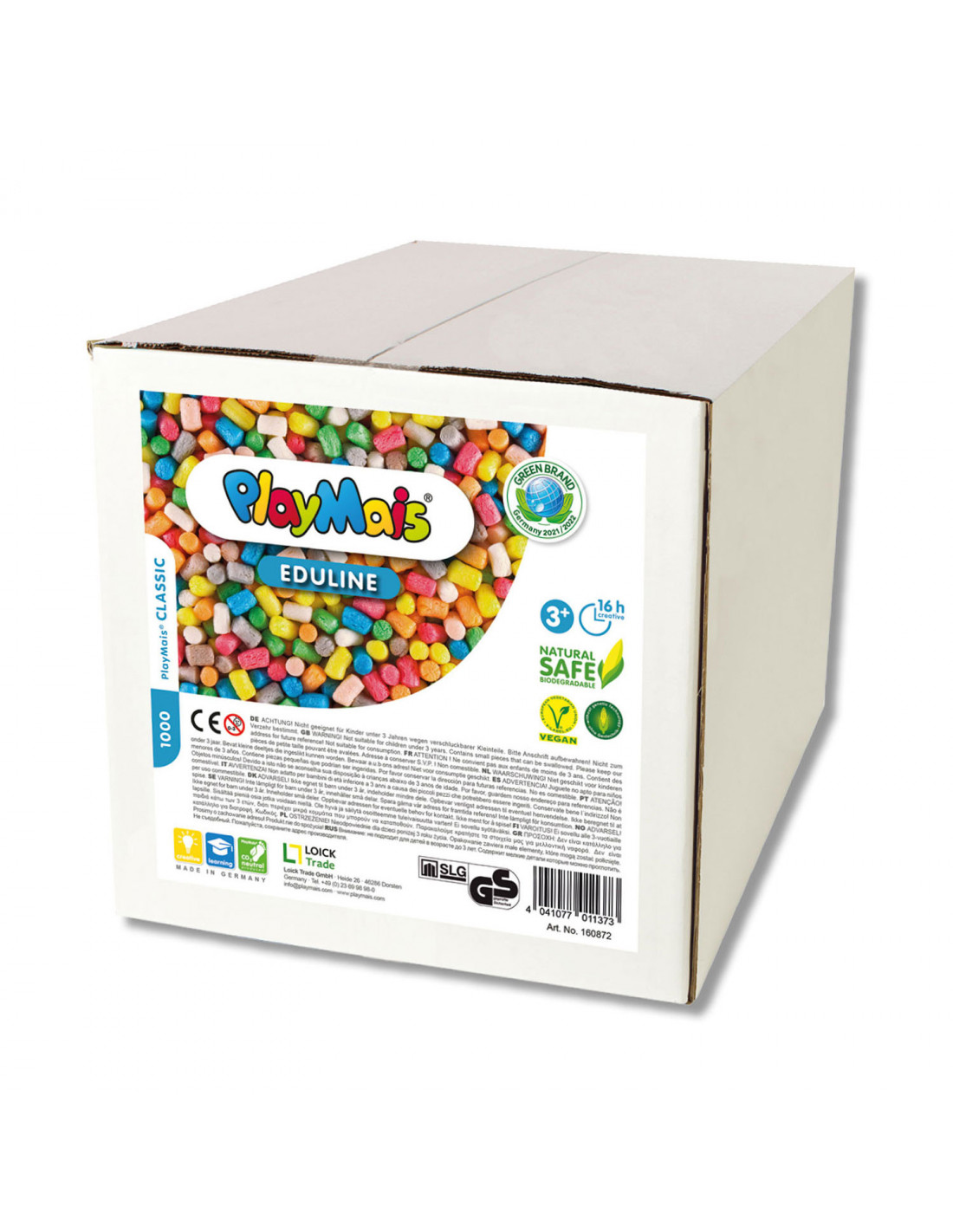 Deze PlayMais Eduline Classic biedt urenlang speelplezier! De Playmais bouwstenen hoeven slechts met een nat doekje vochtig gemaakt te worden en plakken dan aan elkaar. En dat allemaal zonder lijm! PlayMais is natuurlijk, veilig en 100% biologisch afbreekbaar. Inhoud: 1000 Playmais stenen, 4 kunststof mesjes en 4 doekjes om stukjes mee nat te maken.