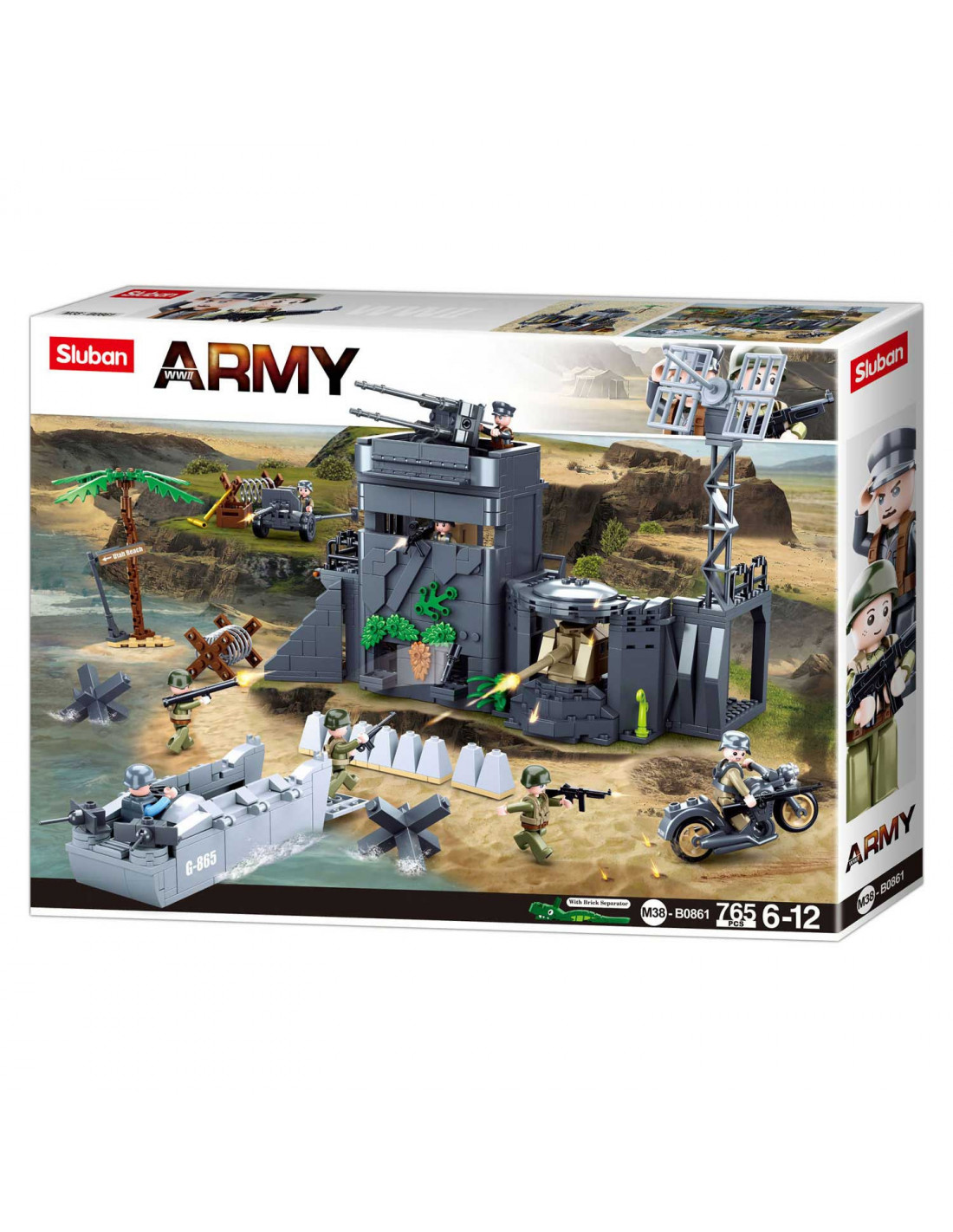 Sluban Army - Bunker in de Duinen. De set bestaat uit 765 blokjes. Inclusief 8 minifiguren. Geschikt voor kinderen van 6-12 jaar. Moeilijkheidsgraad: gemiddeld.