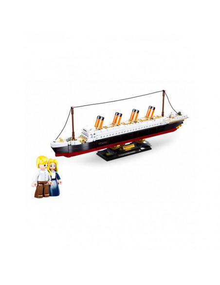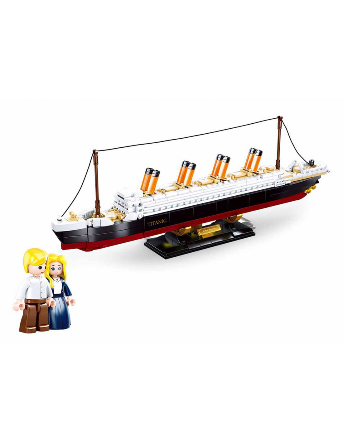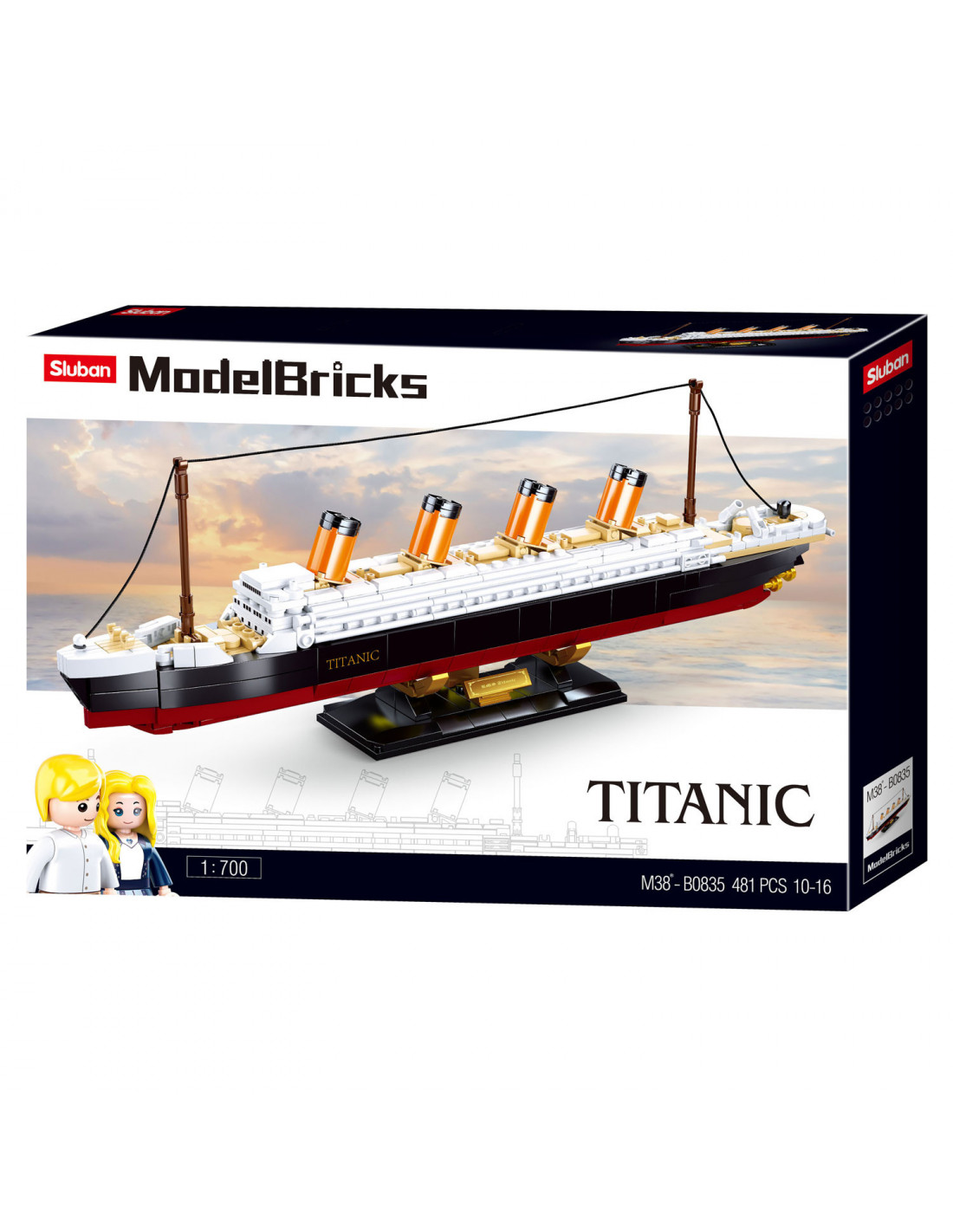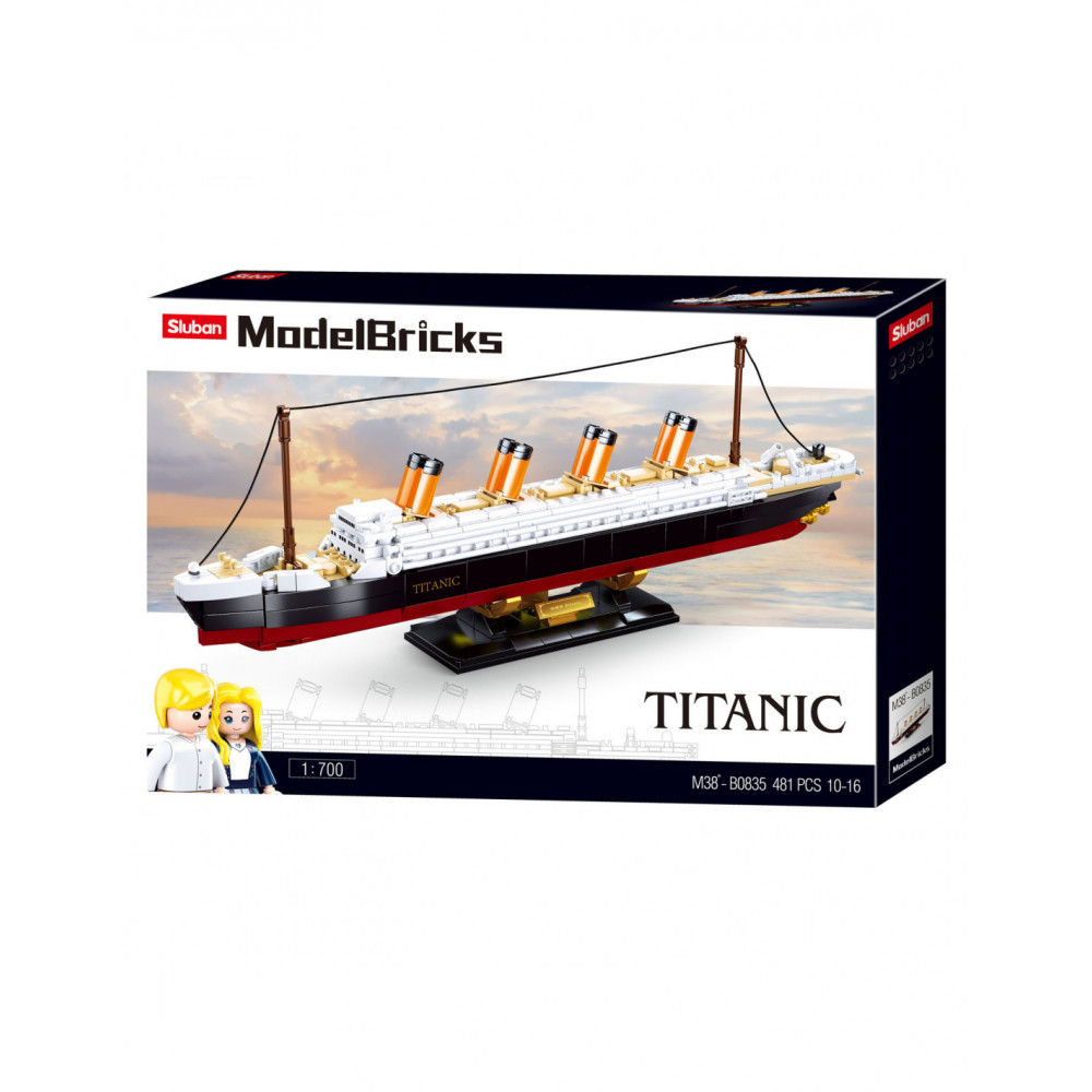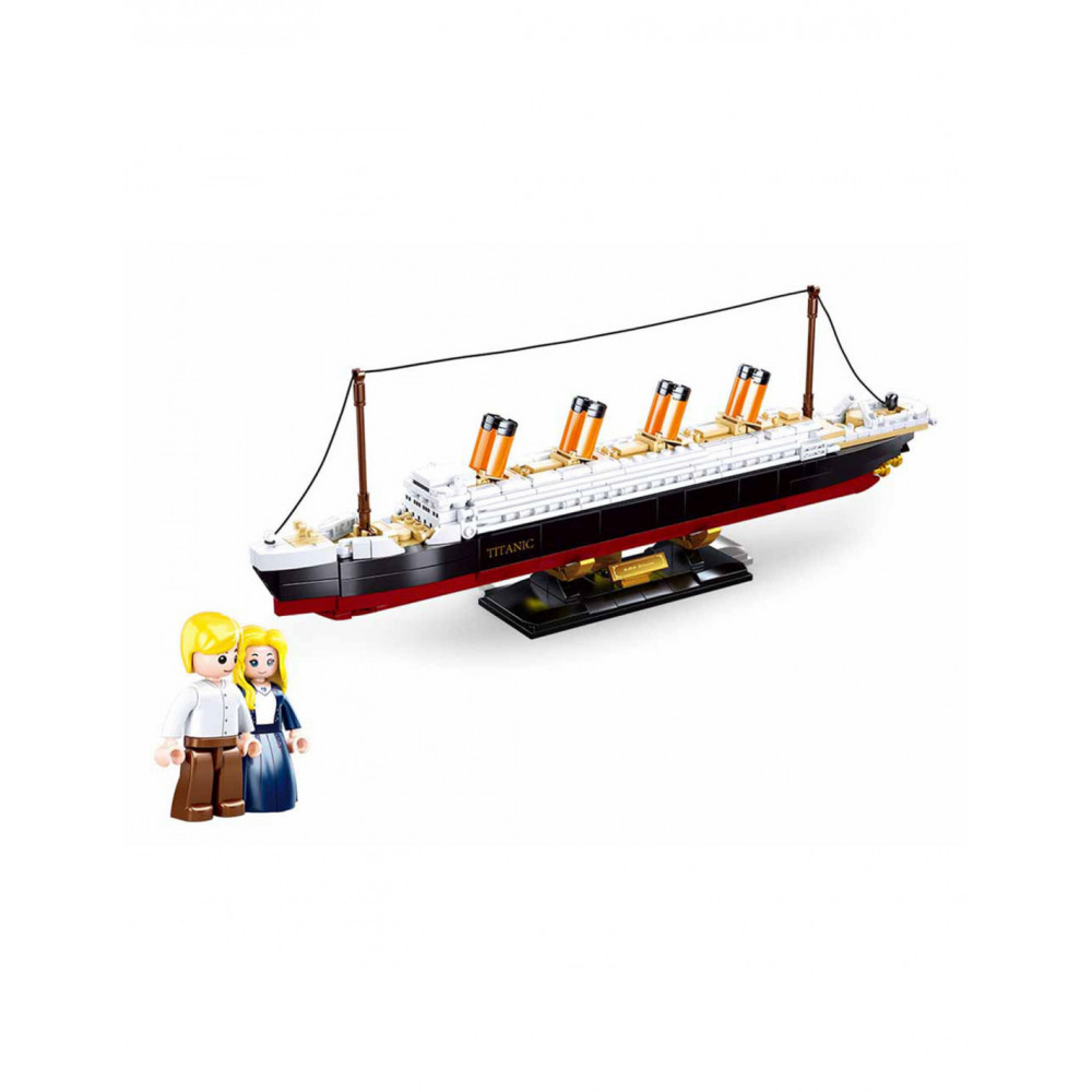 Sluban Titanic schip. Schaal 1:700, 481 stukjes. Ook 2 poppetjes (Jack en Rose) zitten bij de set.