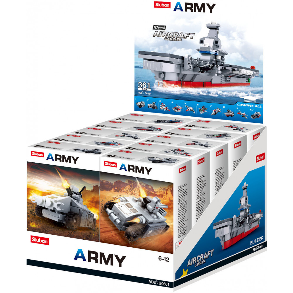 Sluban vliegdekschip Army. 10 verschillende sets. Verzamel ze alle 10 en maak een Aircraft carrier. Specificaties: Kleur: multicolor Geslacht: junior Materiaal: kunststof Afmetingen verpakking: 24 x 17,2 x 19,2 (lxbxh) Leeftijd: vanaf 6 jaar Inhoud: 361 Bouwblokjes