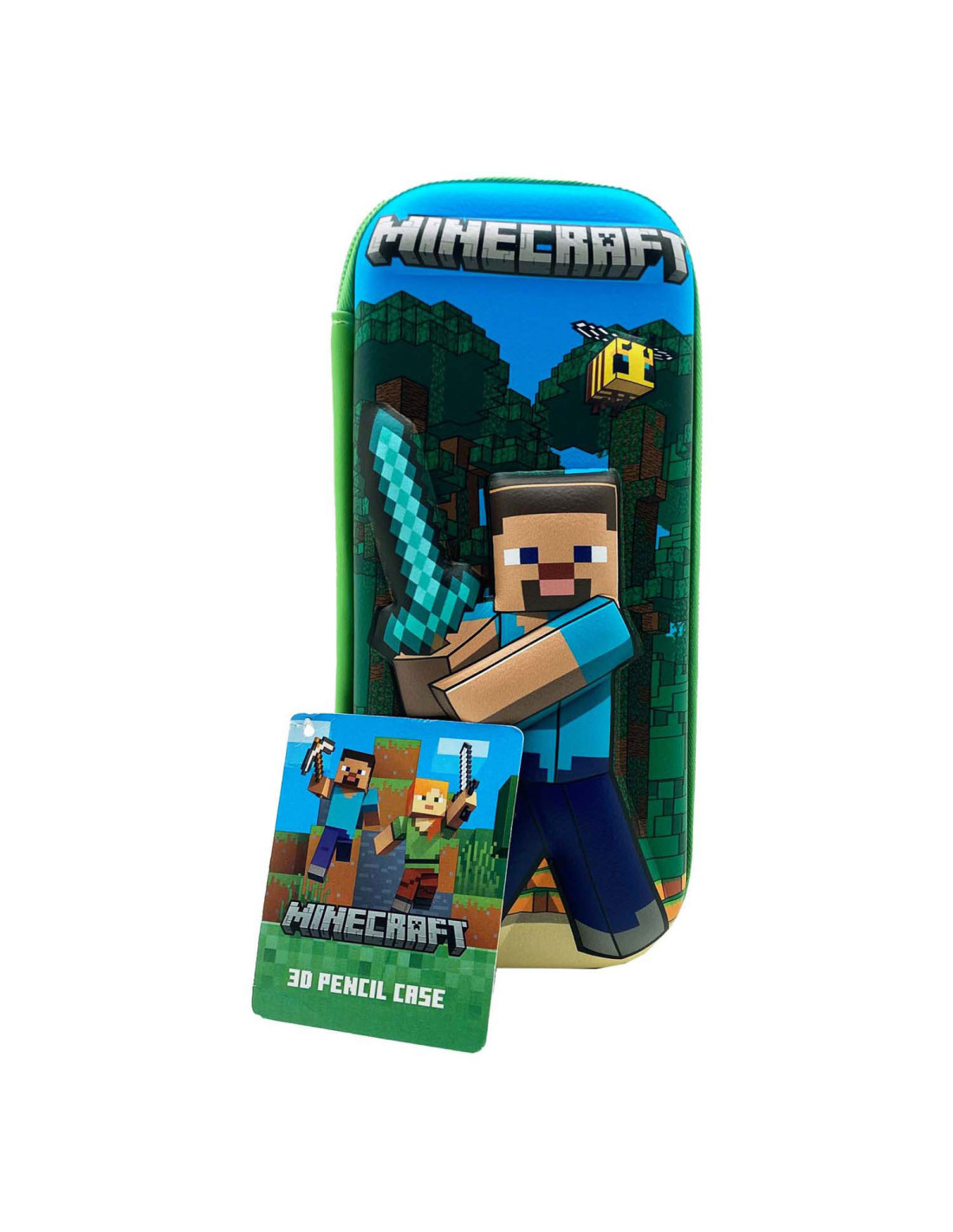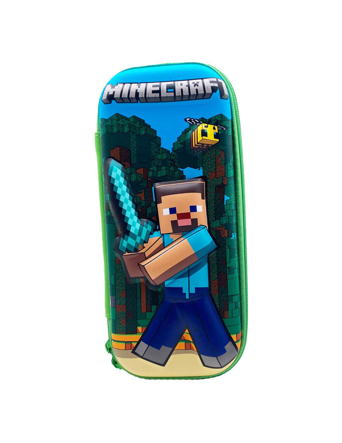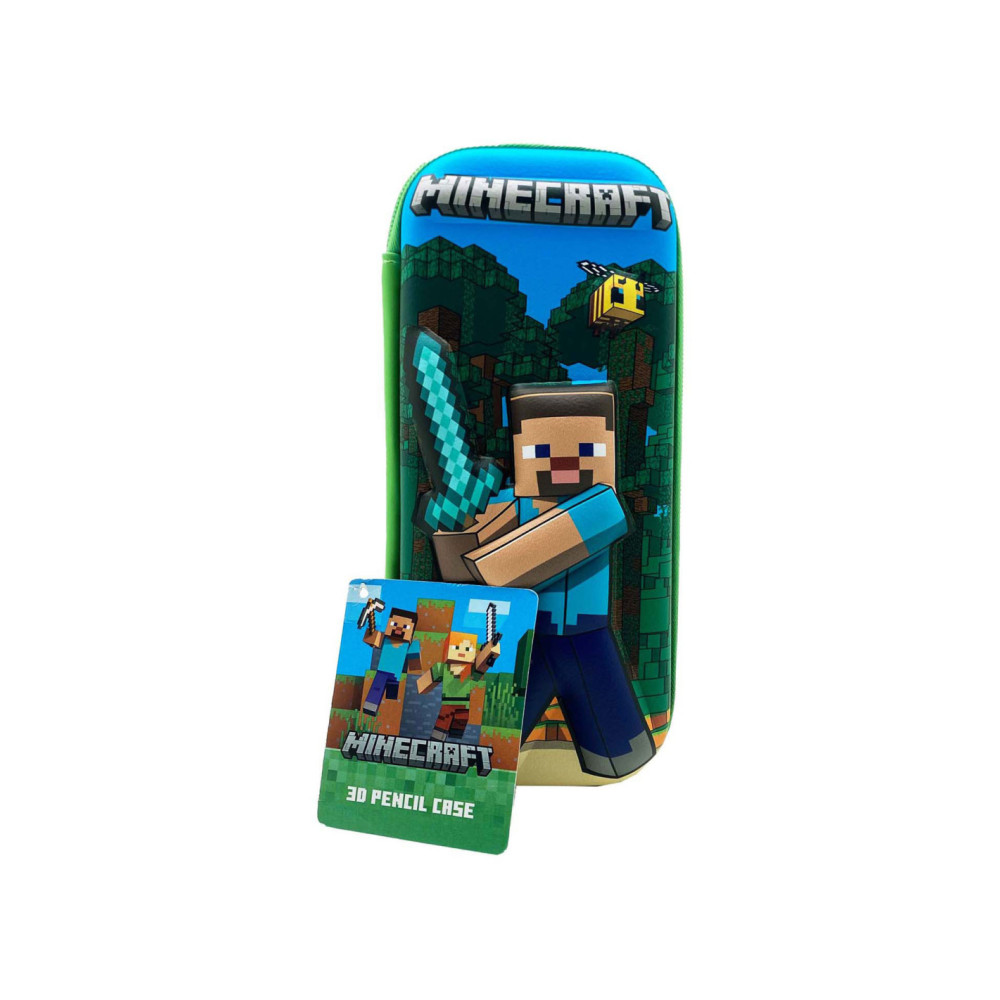 Minecraft 3D-etui met Steve-illustratie in reliëf, ritssluiting en stevig ontwerp. Afmetingen ca. 22 x 10 x 5 cm. Geschikt vanaf 3 jaar.