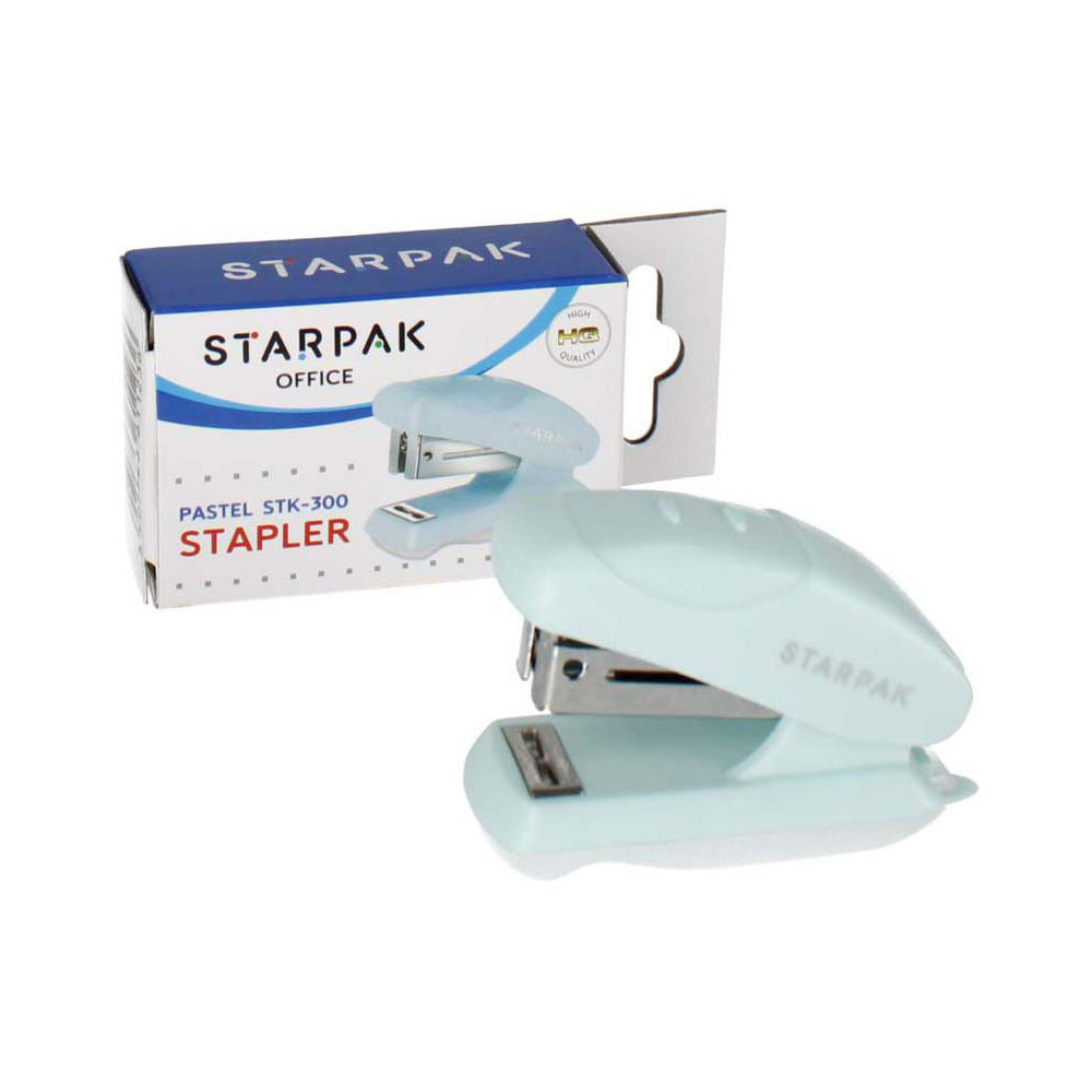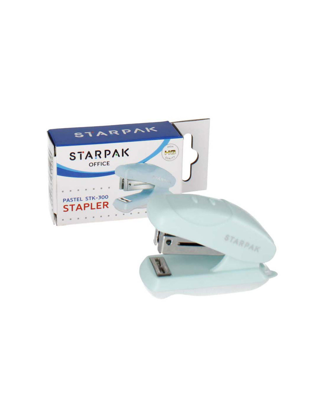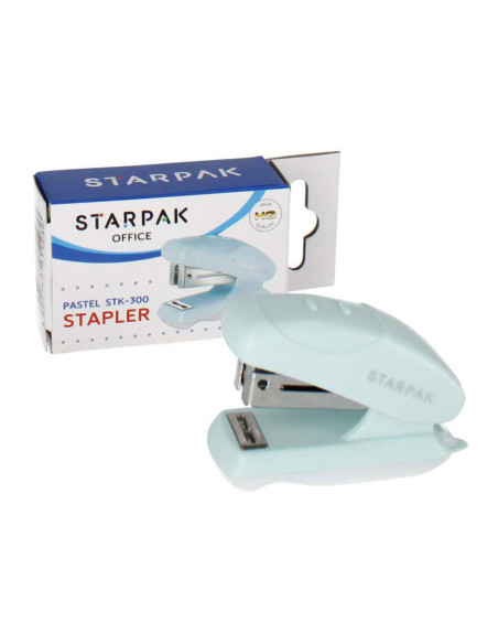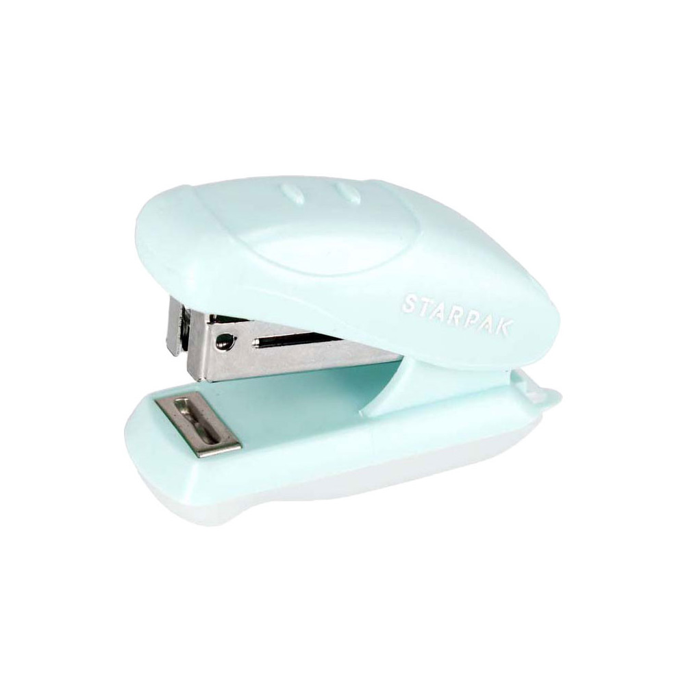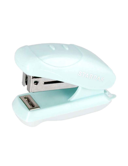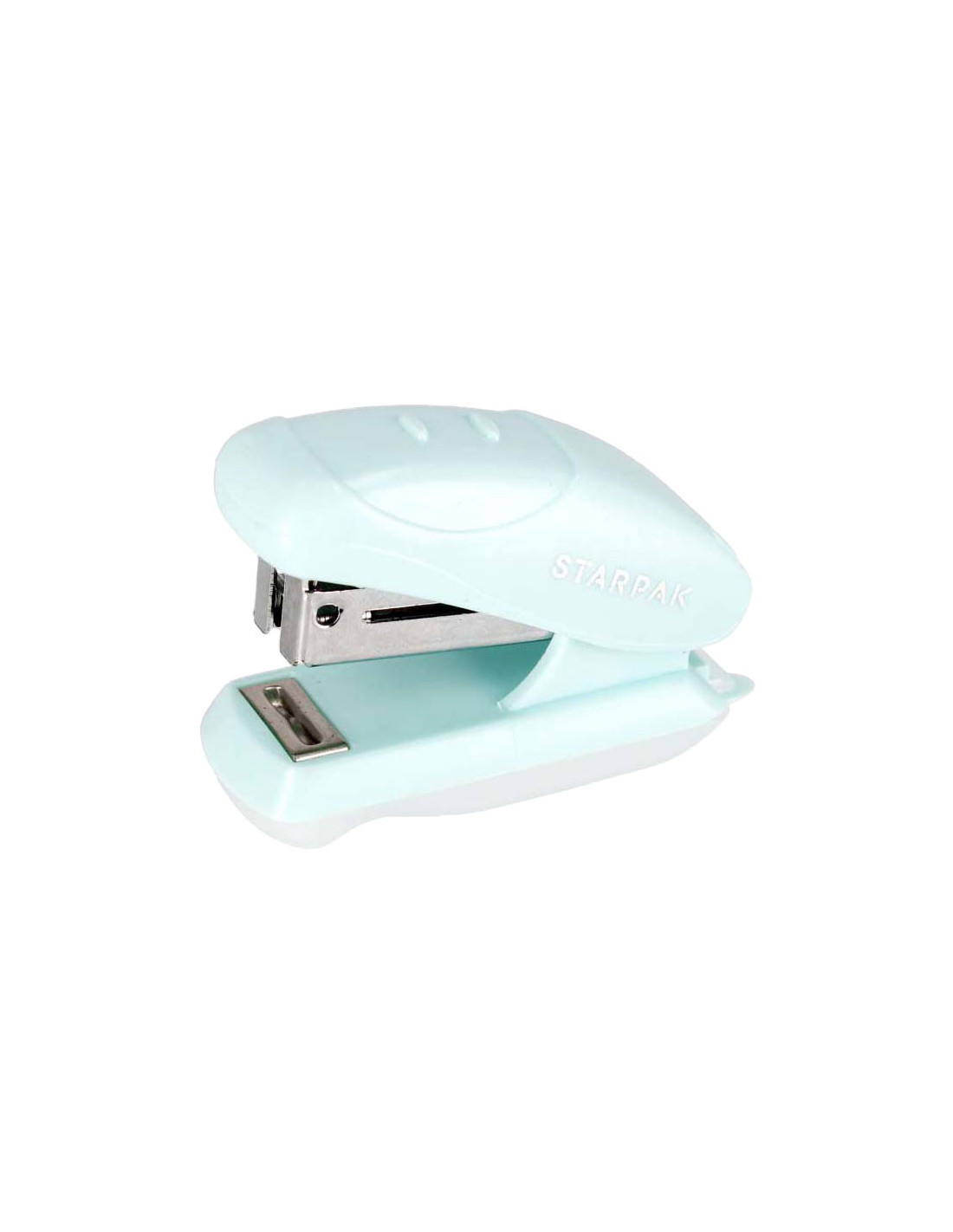 Plastic blauwe mini-nietmachine. De nietmachine niet tot 20 vellen van 80 gsm tegelijkertijd.