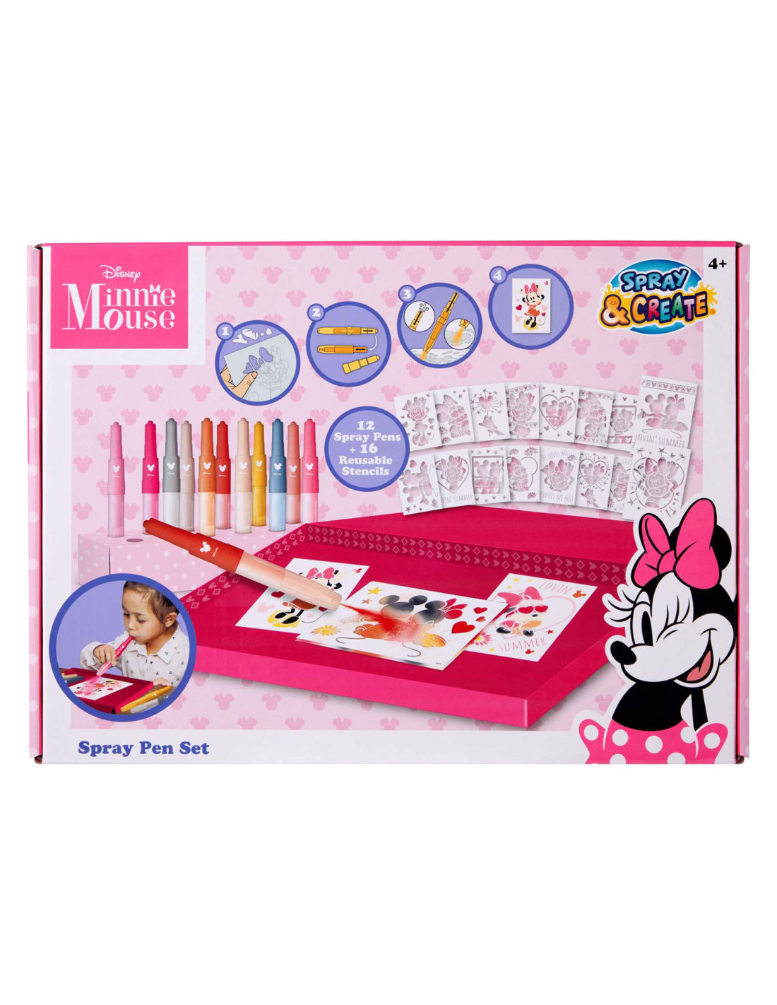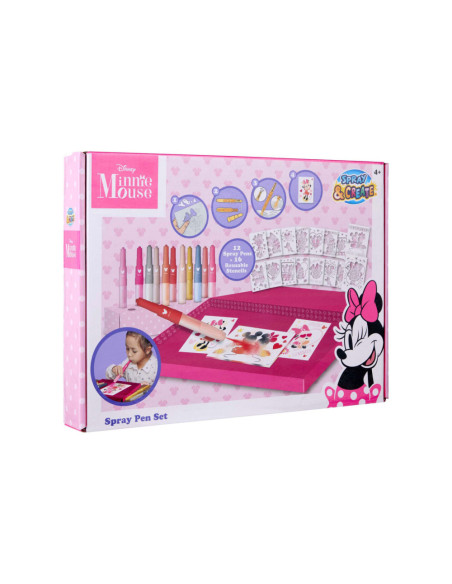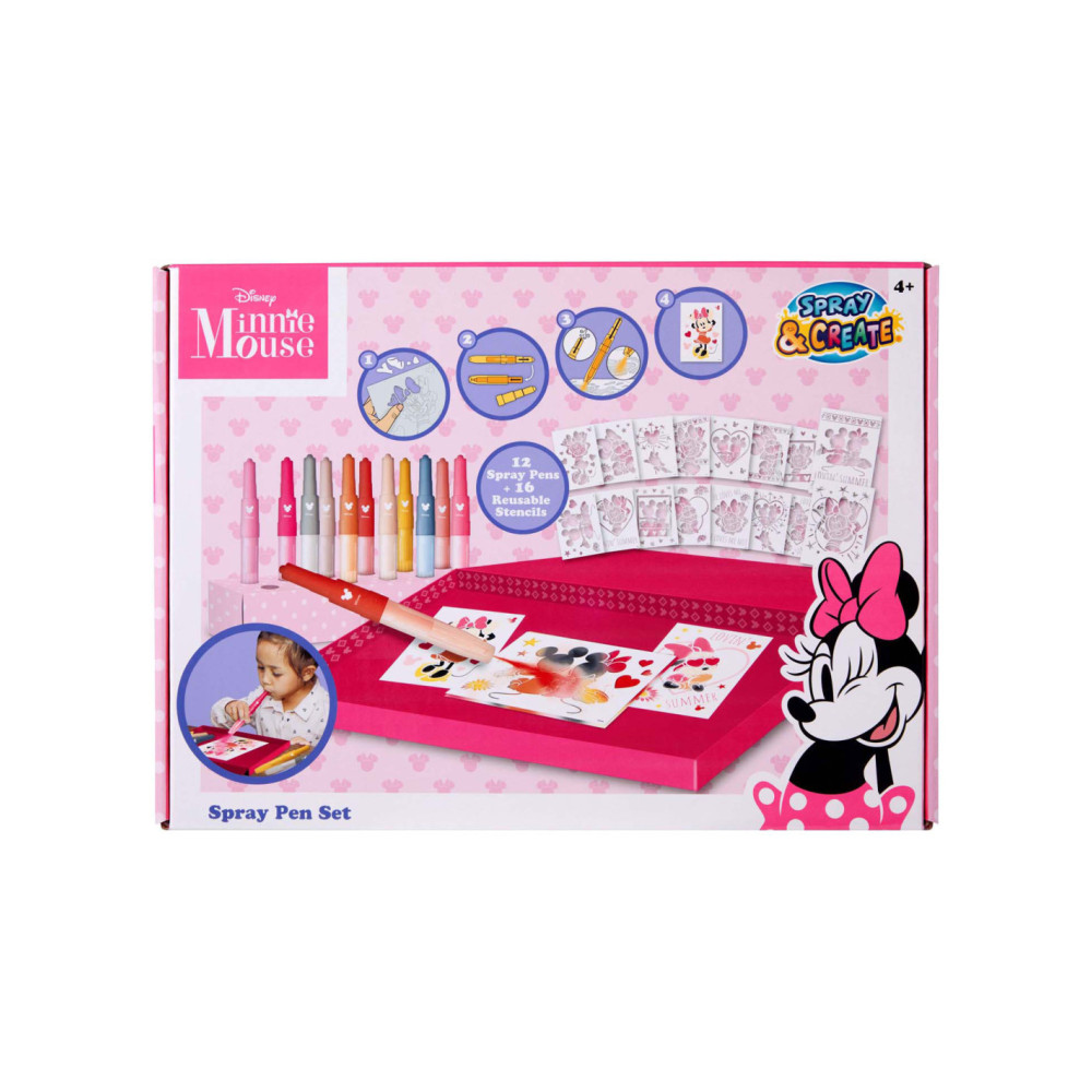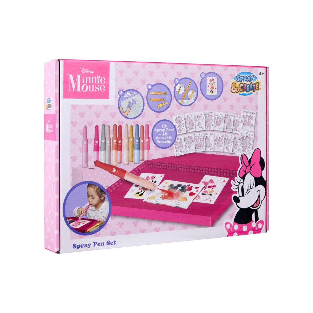 Minnie Mouse blaaspennen set. De set bevat 12 kleuren blaaspennen en 16 stencils. De set is geschikt voor kinderen vanaf 4 jaar.