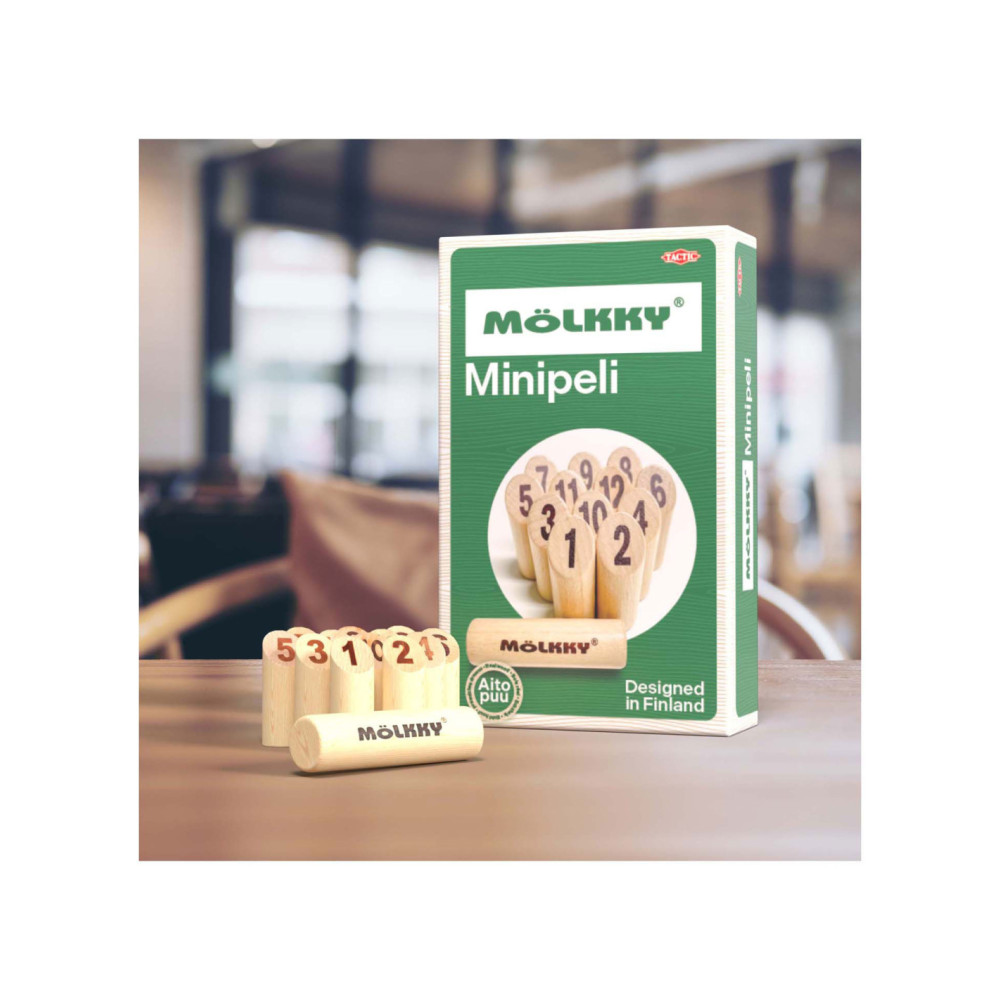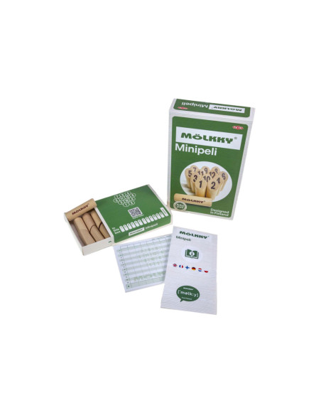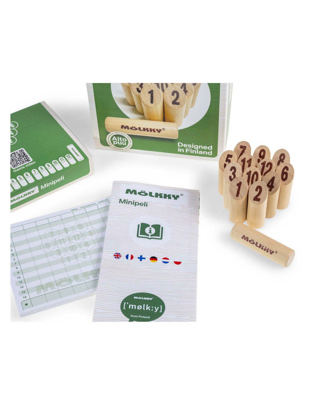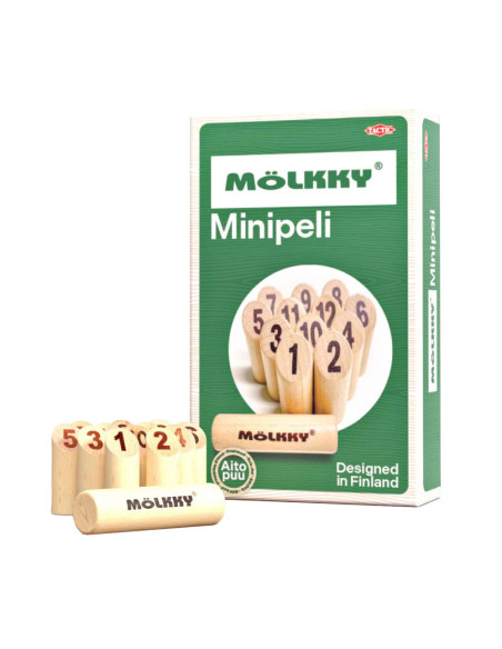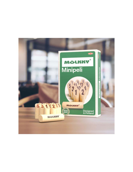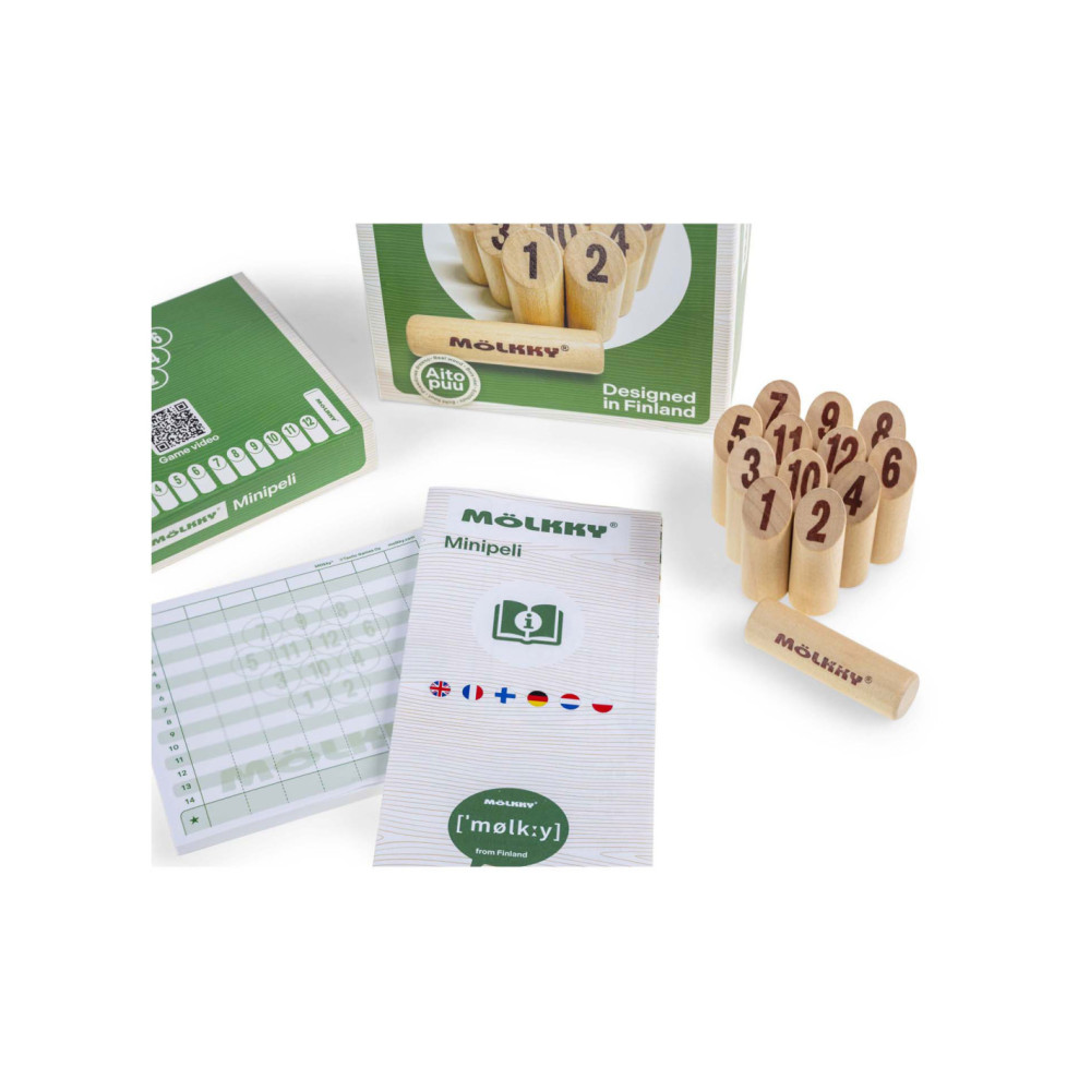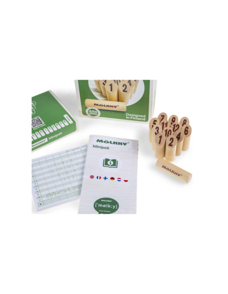 Heb je onvoldoende ruimte om Mölkky Original te spelen? Geen probleem, want met de Mölkky Minipeli speel je het spel op kleinschalige wijze, dus gewoon op de eettafel bijvoorbeeld. Het spel verloopt precies hetzelfde als Mölkky Original, je zet de minikegels in formatie en gooit de werpstok, vervolgens is degene die als eerste precies 50 punten heeft verzamelt de winnaar.