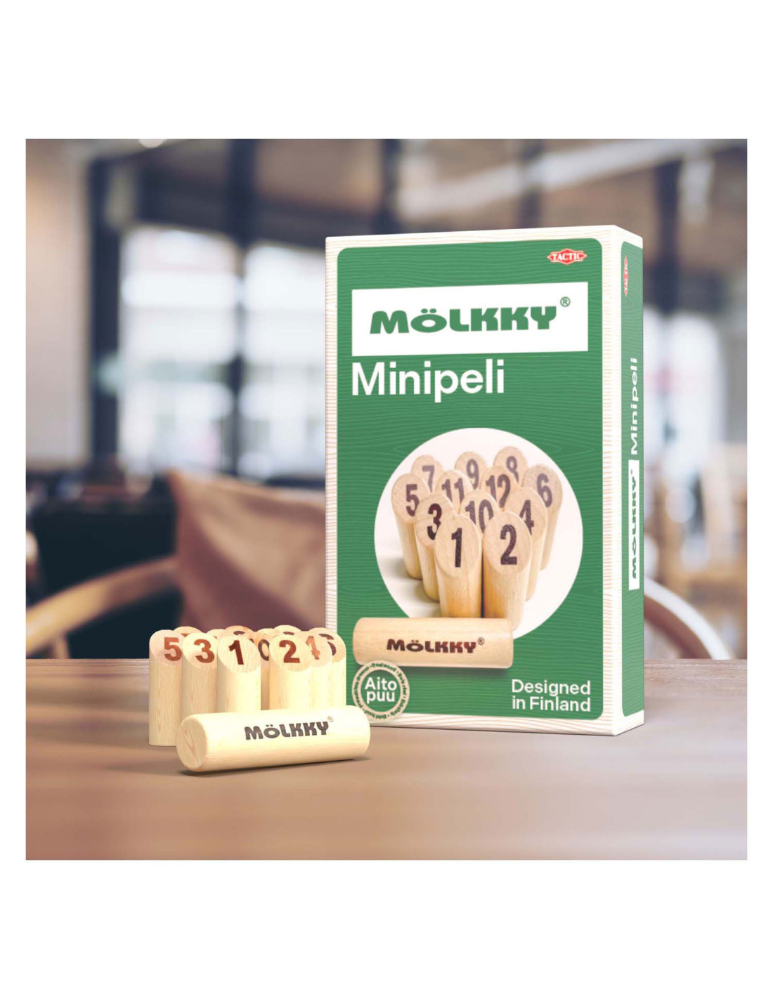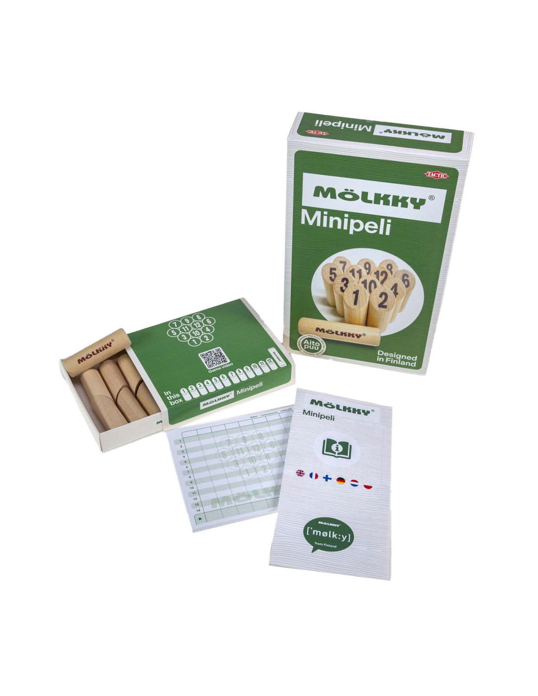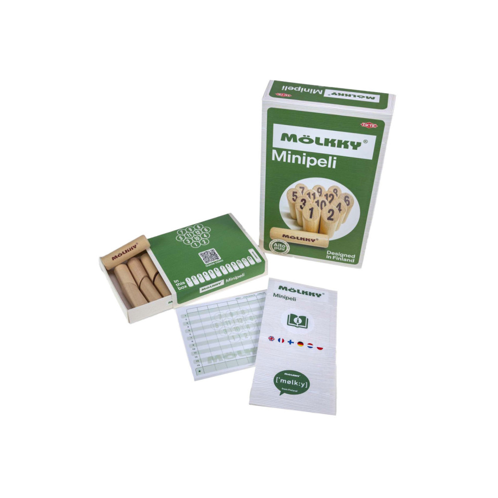 Heb je onvoldoende ruimte om Mölkky Original te spelen? Geen probleem, want met de Mölkky Minipeli speel je het spel op kleinschalige wijze, dus gewoon op de eettafel bijvoorbeeld. Het spel verloopt precies hetzelfde als Mölkky Original, je zet de minikegels in formatie en gooit de werpstok, vervolgens is degene die als eerste precies 50 punten heeft verzamelt de winnaar.