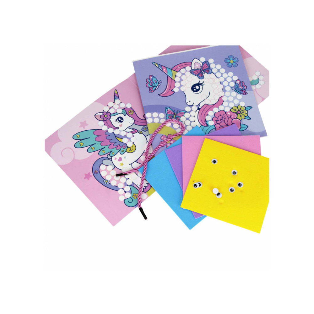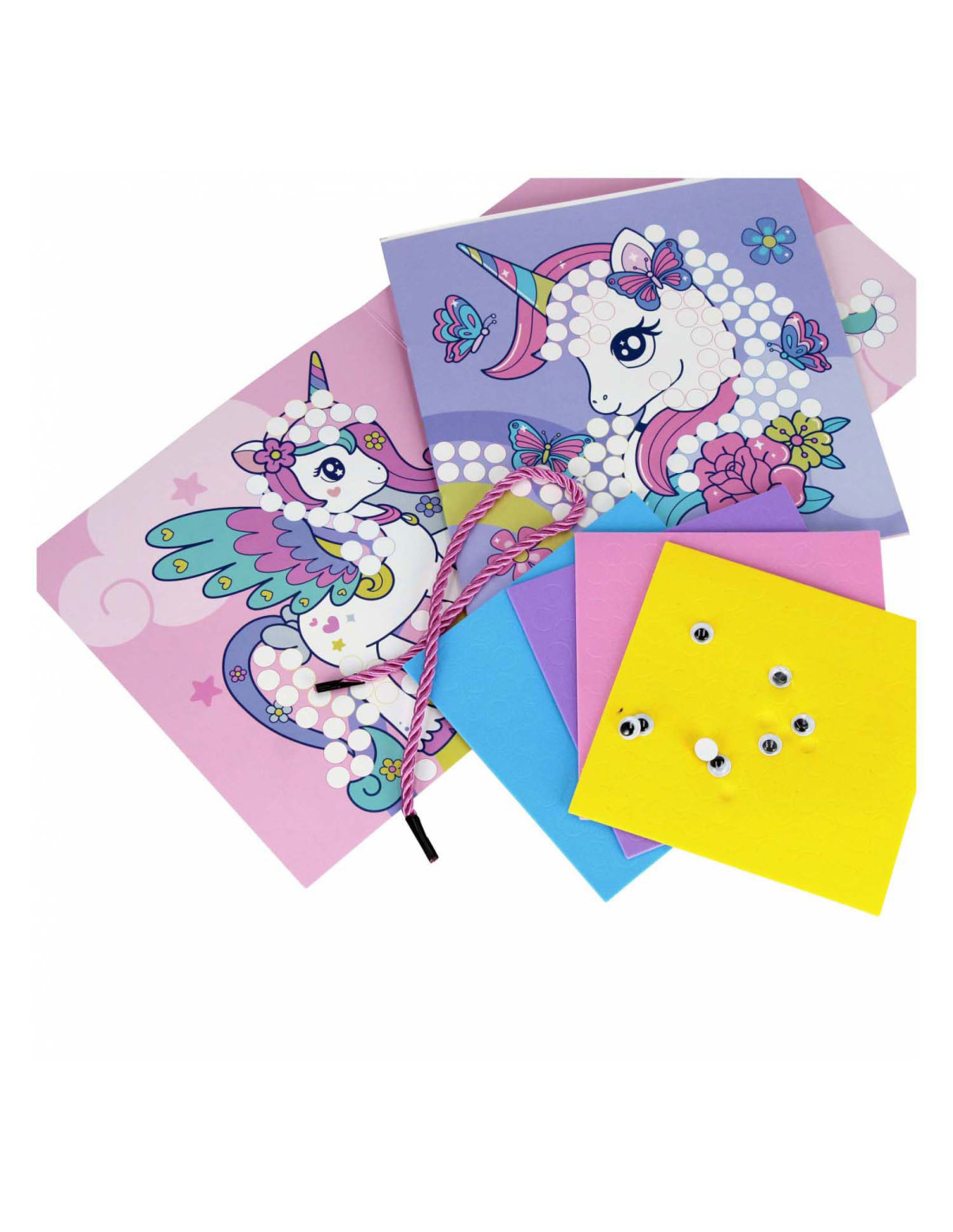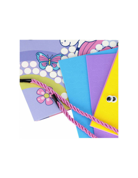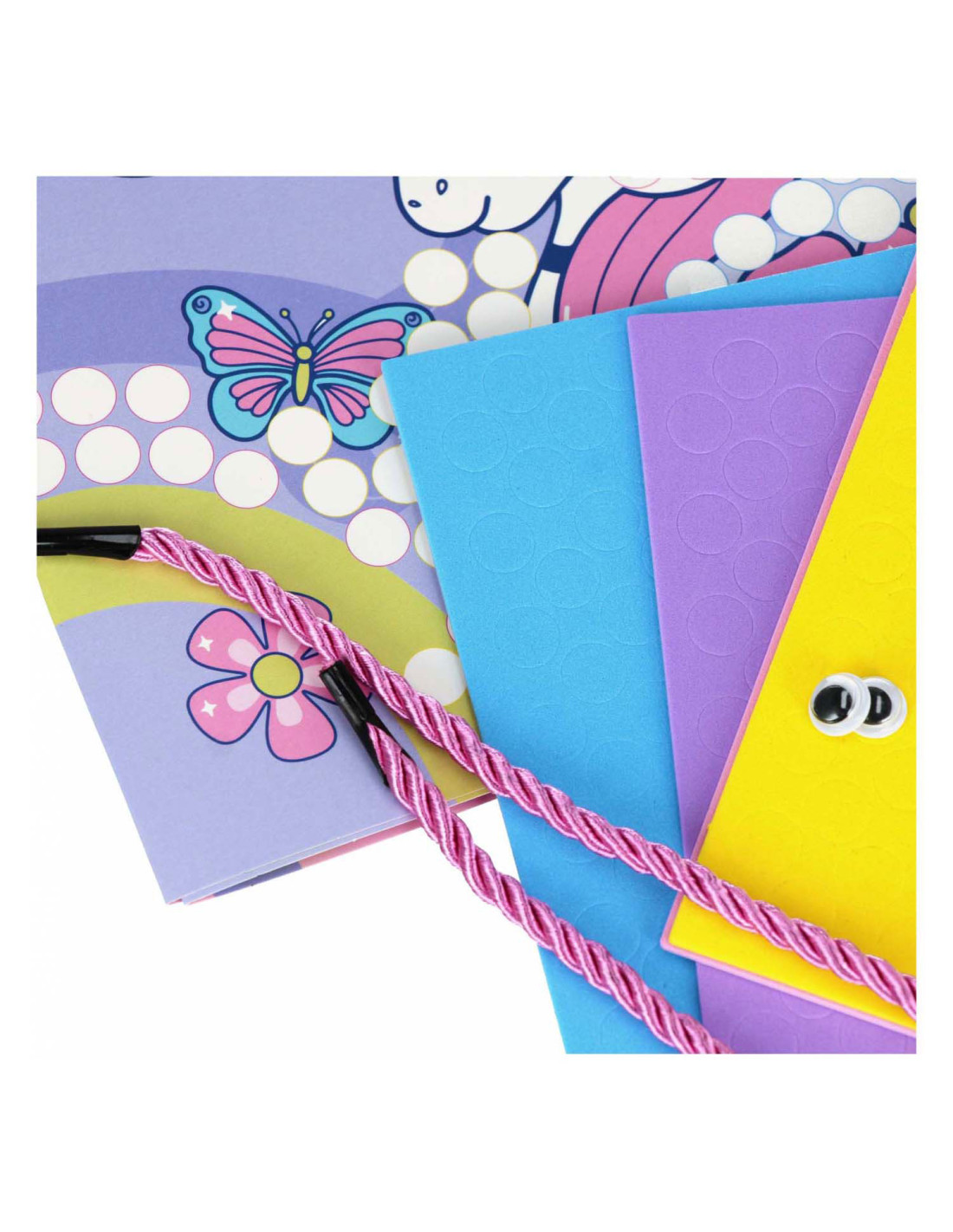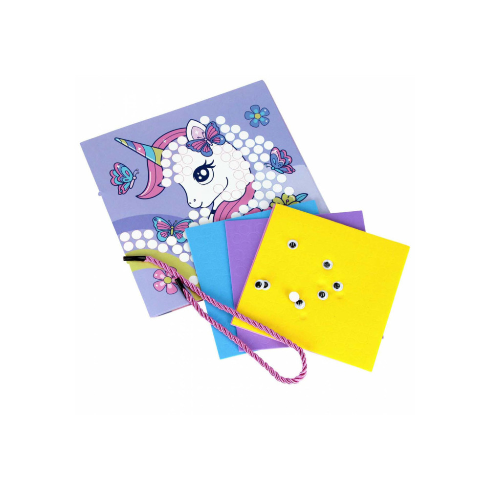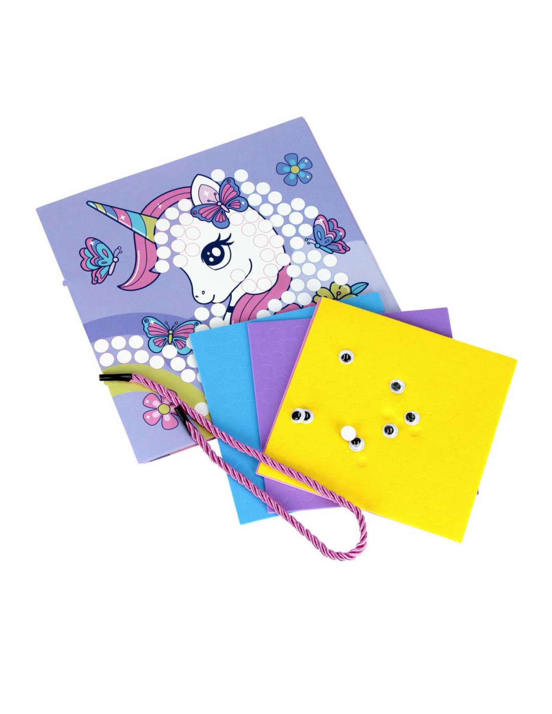 Plak plaatjes met magische eenhoorns! Het plakken van plaatjes met foamstickers leert geduld en ontwikkelt handvaardigheid. De gemaakte plaatjes zullen elk kind veel voldoening geven. De set bevat: 4 vellen met stickers, 2 vellen met plaatjes, touw en 8 zelfklevende wiebeloogjes.