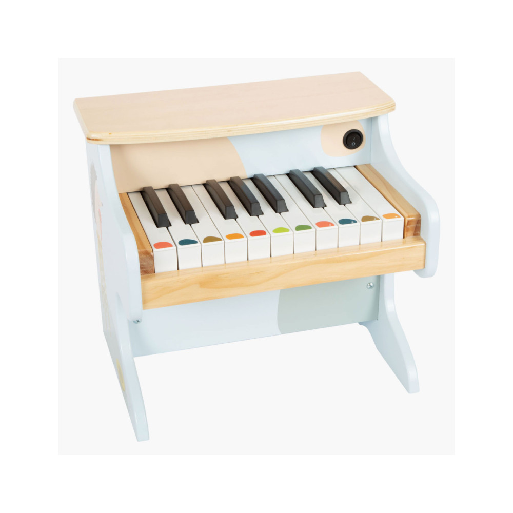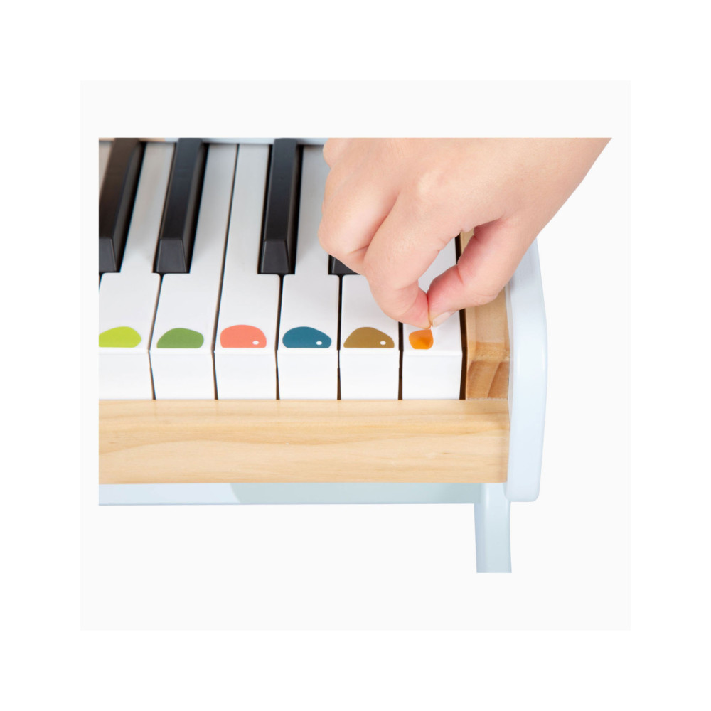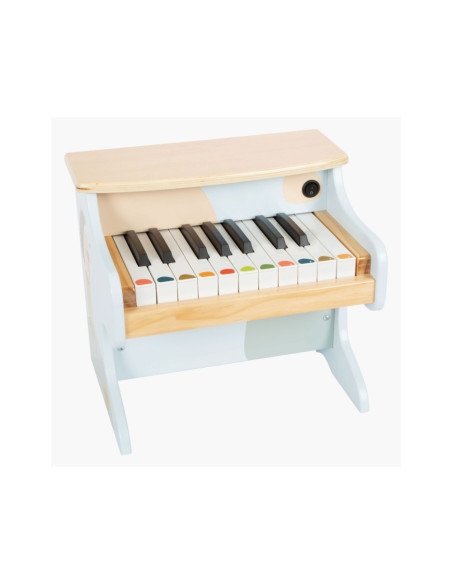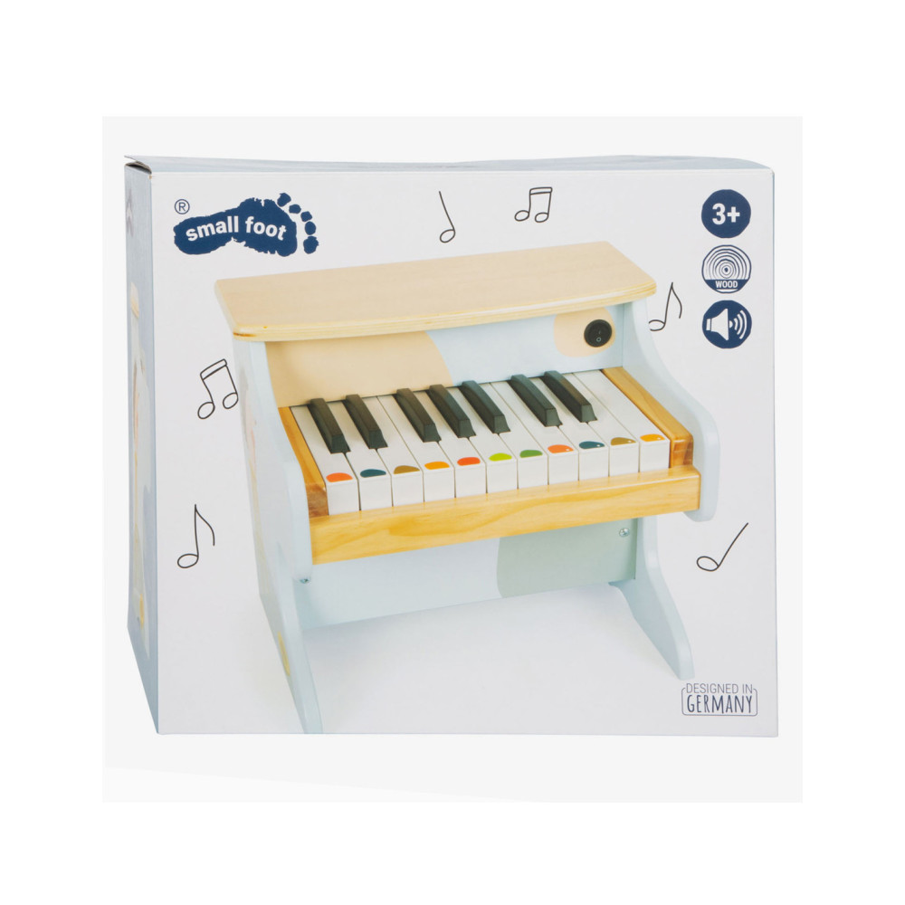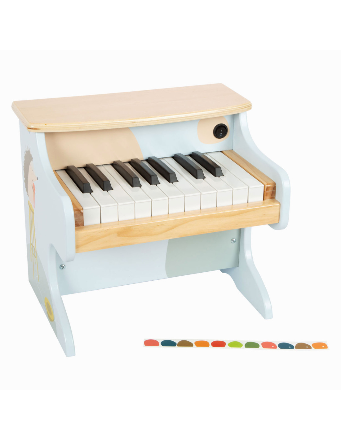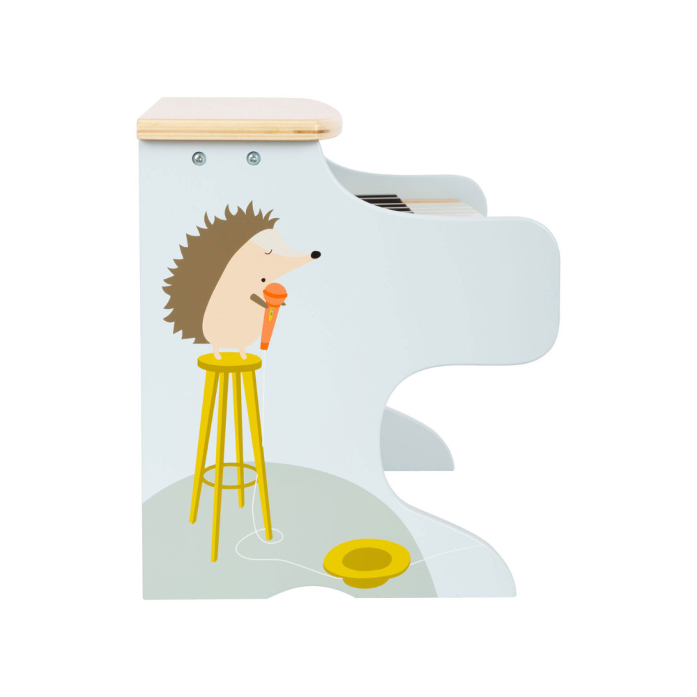 Wie begeleidt Ida de egel op de piano? Deze stevige, elektronische houten piano maakt indruk met zijn geweldige geluidskwaliteit en vrolijk design. Met een combinatie van veel natuurlijk hout, moderne blauwtinten en kindvriendelijke motieven is deze piano ook de absolute blikvanger van het orkest in de kinderkamer! De meegeleverde stickers die op de toetsen kunnen worden geplakt, ondersteunen de jonge muzikanten bij hun eerste liedjes. Wordt geleverd met bladmuziek. Batterijen niet inbegrepen.