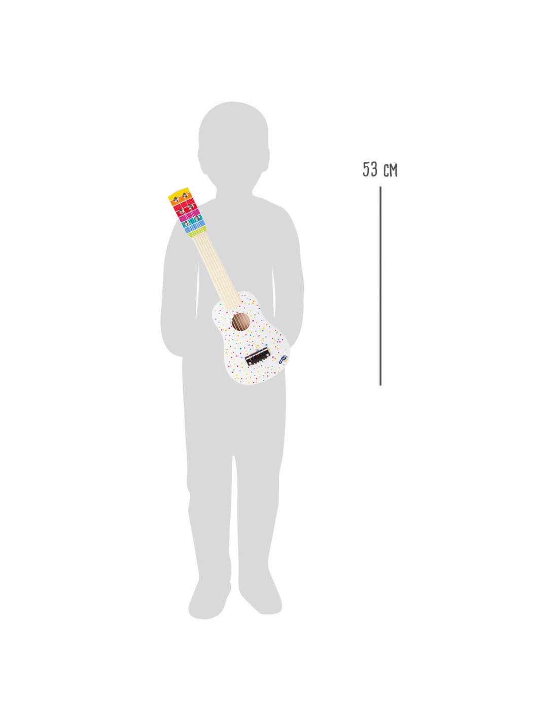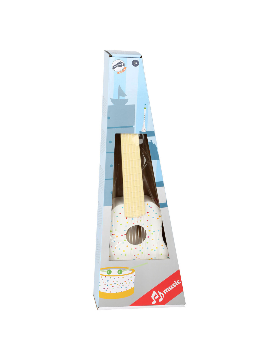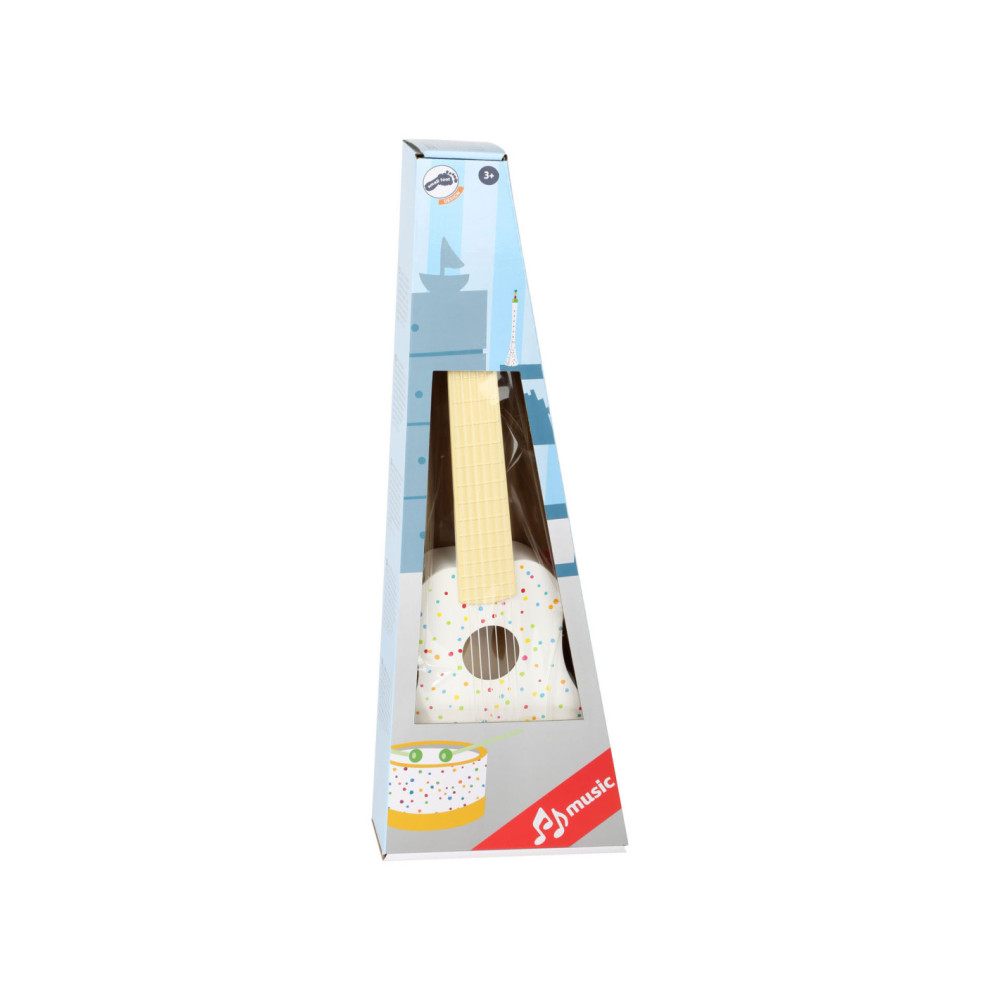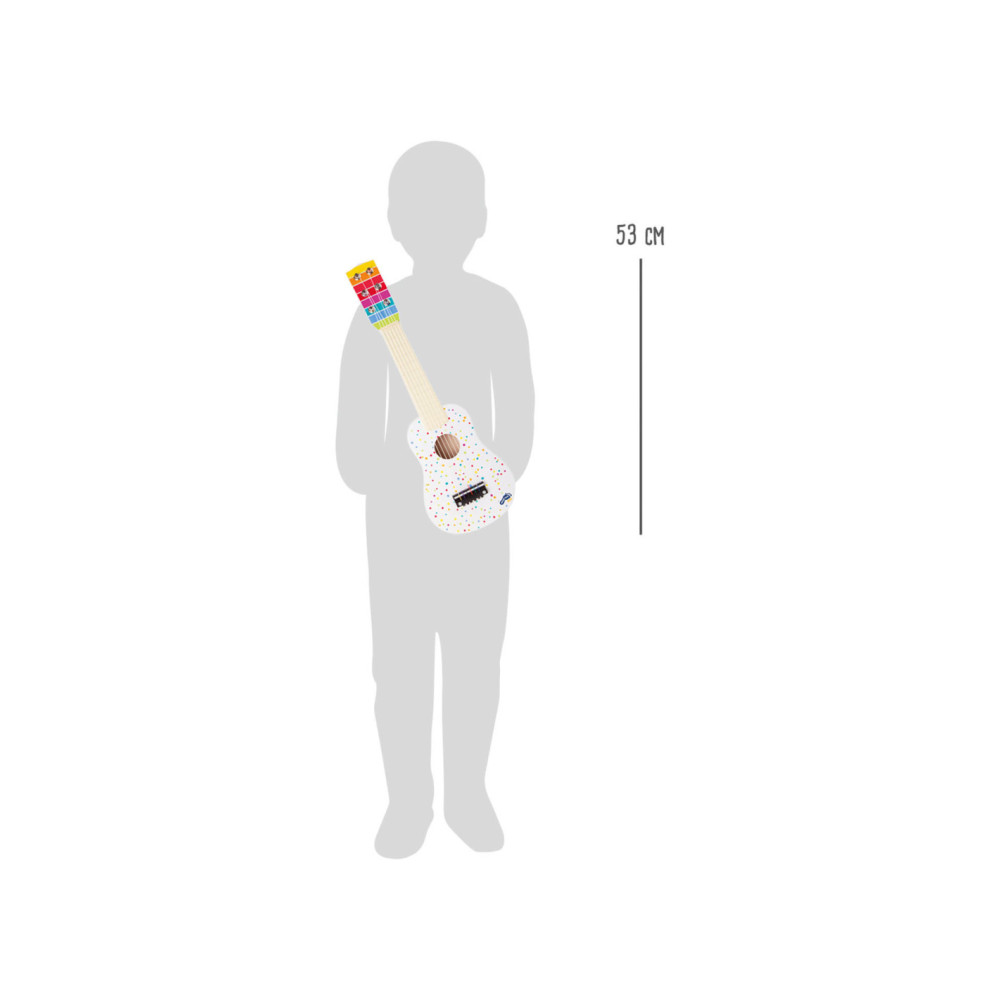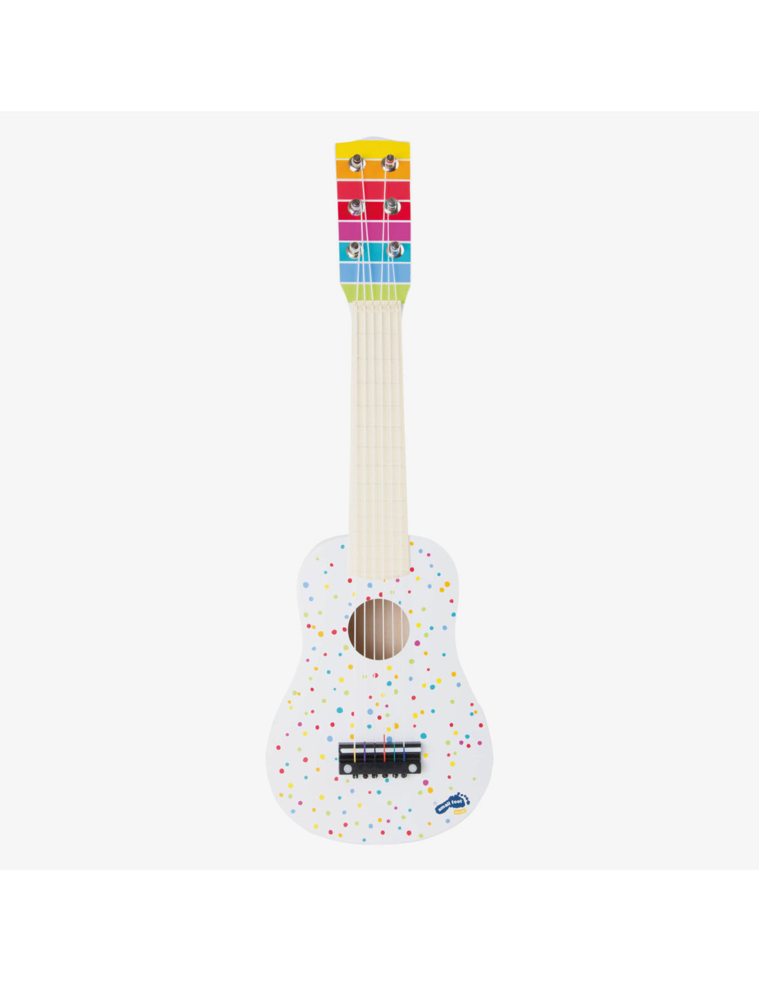 Deze gitaar is een essentieel instrument in elke muziekkamer! In het wit met kleine, kleurrijke accenten is dit juweel een must voor alle jonge muziekliefhebbers.