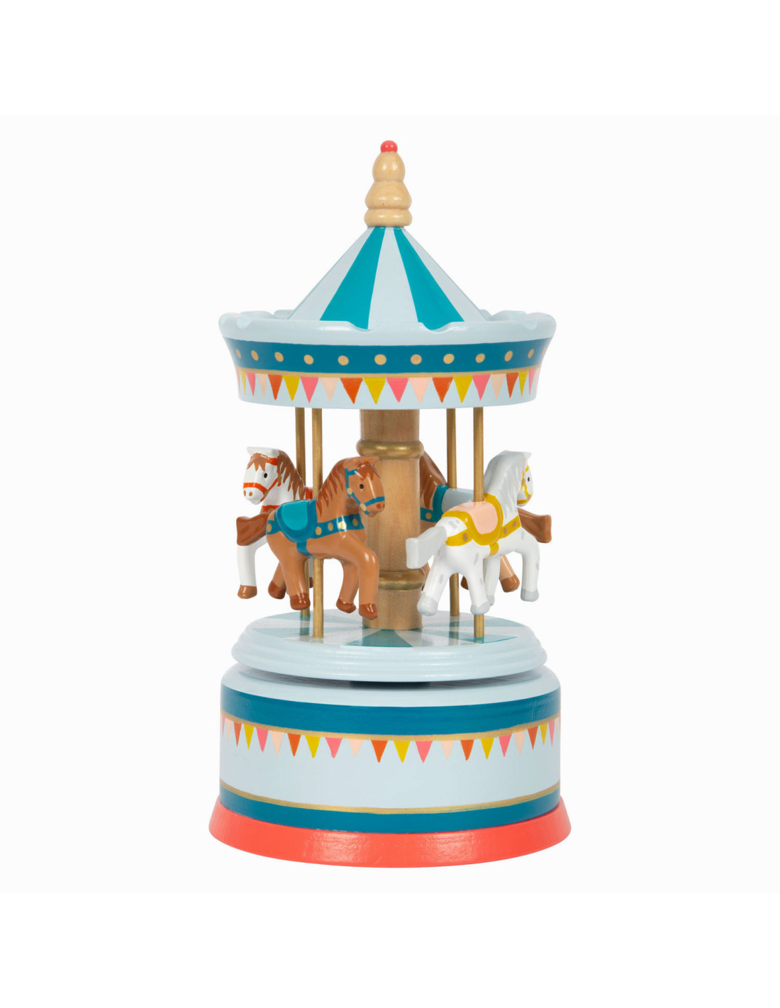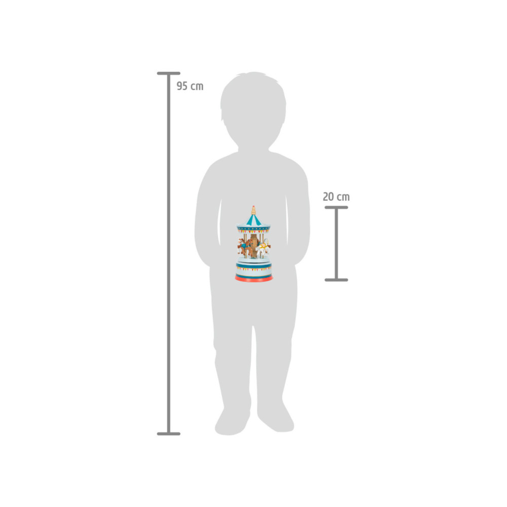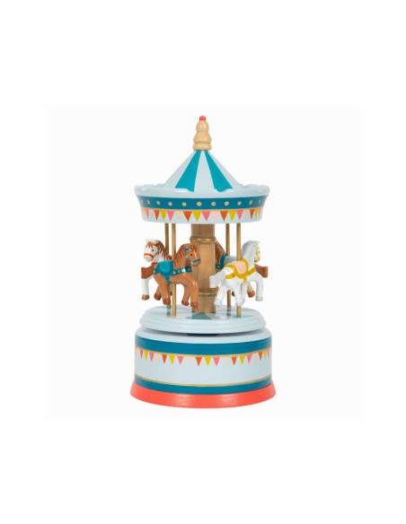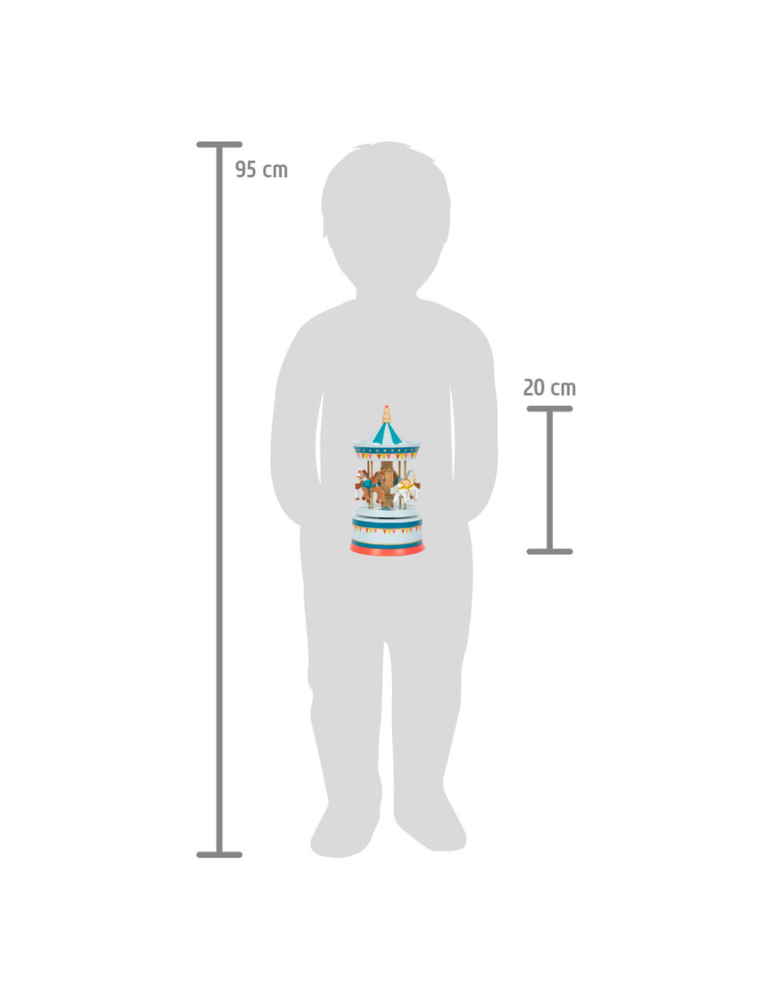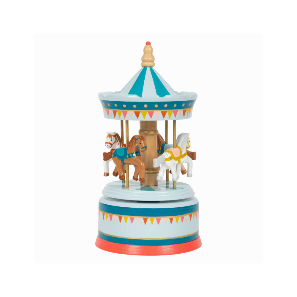 Een circus of een kermis? Deze muziekdoos brengt beide samen! Met zijn klassieke carrousel-uiterlijk begeleidt hij kinderen zachtjes in slaap met Beethovens betoverende melodie "Für Elise", terwijl de liefdevol ontworpen houten paarden zachtjes ronddraaien op de muziek. Dit muziekdoosje is door kinderen zelfstandig te bedienen en biedt dankzij de rijk gedetailleerde, driedimensionale vormen genoeg om aan te raken en te ontdekken. De gouden accenten in combinatie met zichtbare houtdetails, contrastrijke kleuren en moderne designelementen maken van deze klassieke muziekdoos een bijzondere blikvanger in de kinderkamer.