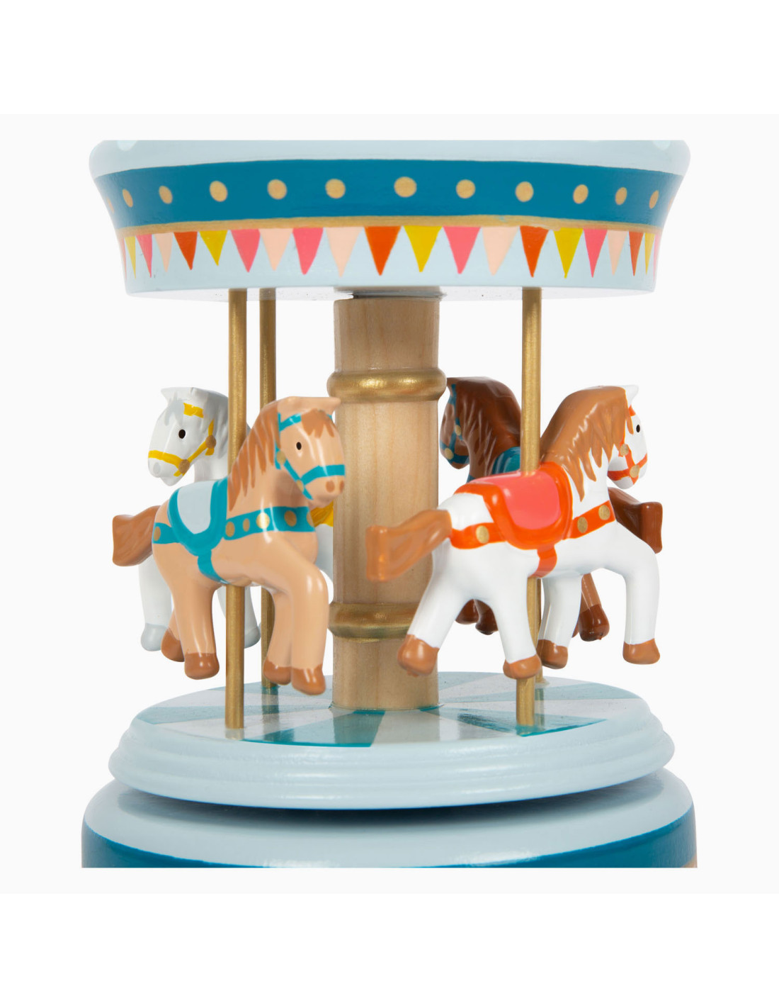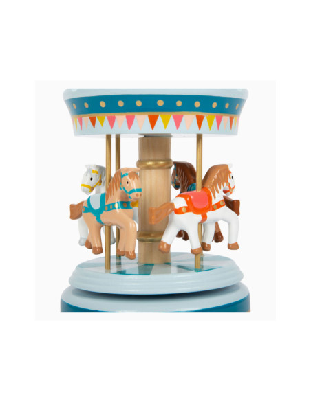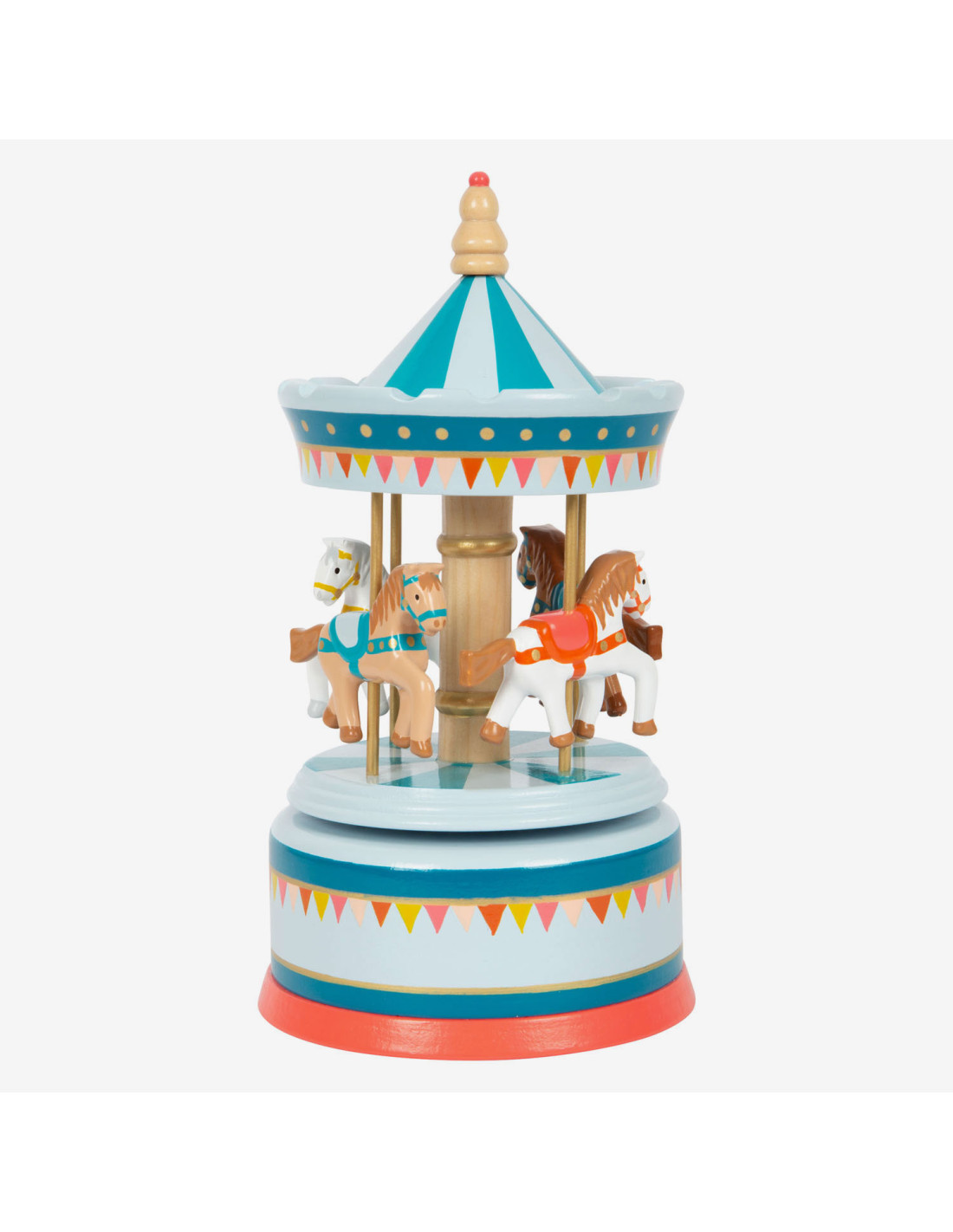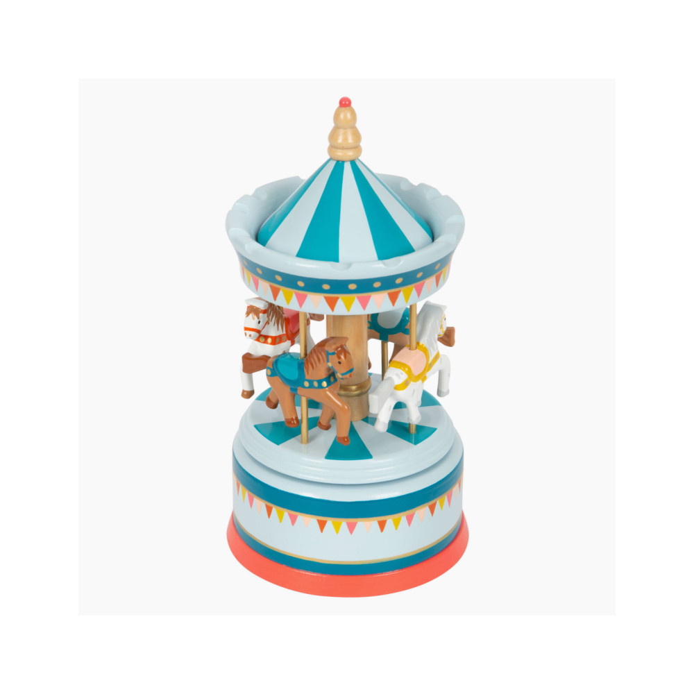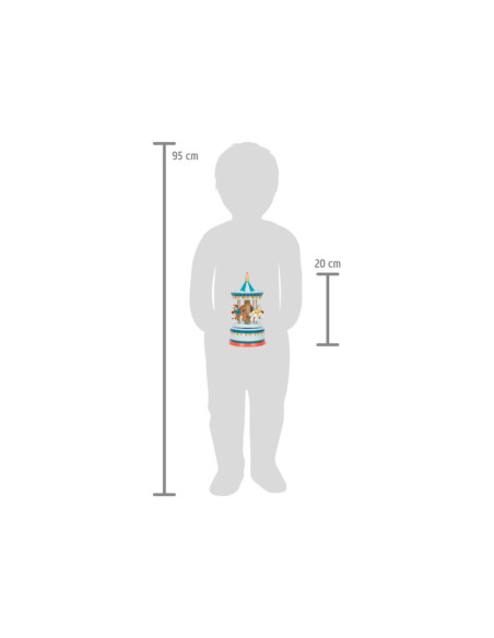 Een circus of een kermis? Deze muziekdoos brengt beide samen! Met zijn klassieke carrousel-uiterlijk begeleidt hij kinderen zachtjes in slaap met Beethovens betoverende melodie "Für Elise", terwijl de liefdevol ontworpen houten paarden zachtjes ronddraaien op de muziek. Dit muziekdoosje is door kinderen zelfstandig te bedienen en biedt dankzij de rijk gedetailleerde, driedimensionale vormen genoeg om aan te raken en te ontdekken. De gouden accenten in combinatie met zichtbare houtdetails, contrastrijke kleuren en moderne designelementen maken van deze klassieke muziekdoos een bijzondere blikvanger in de kinderkamer.