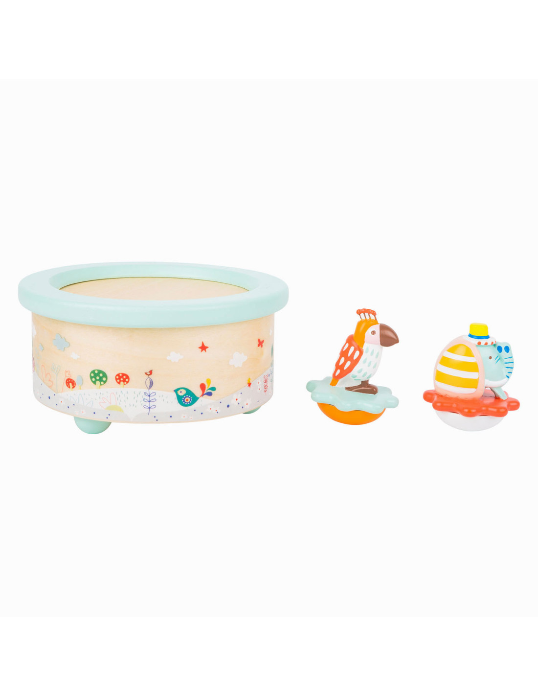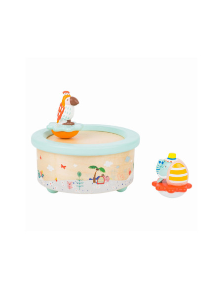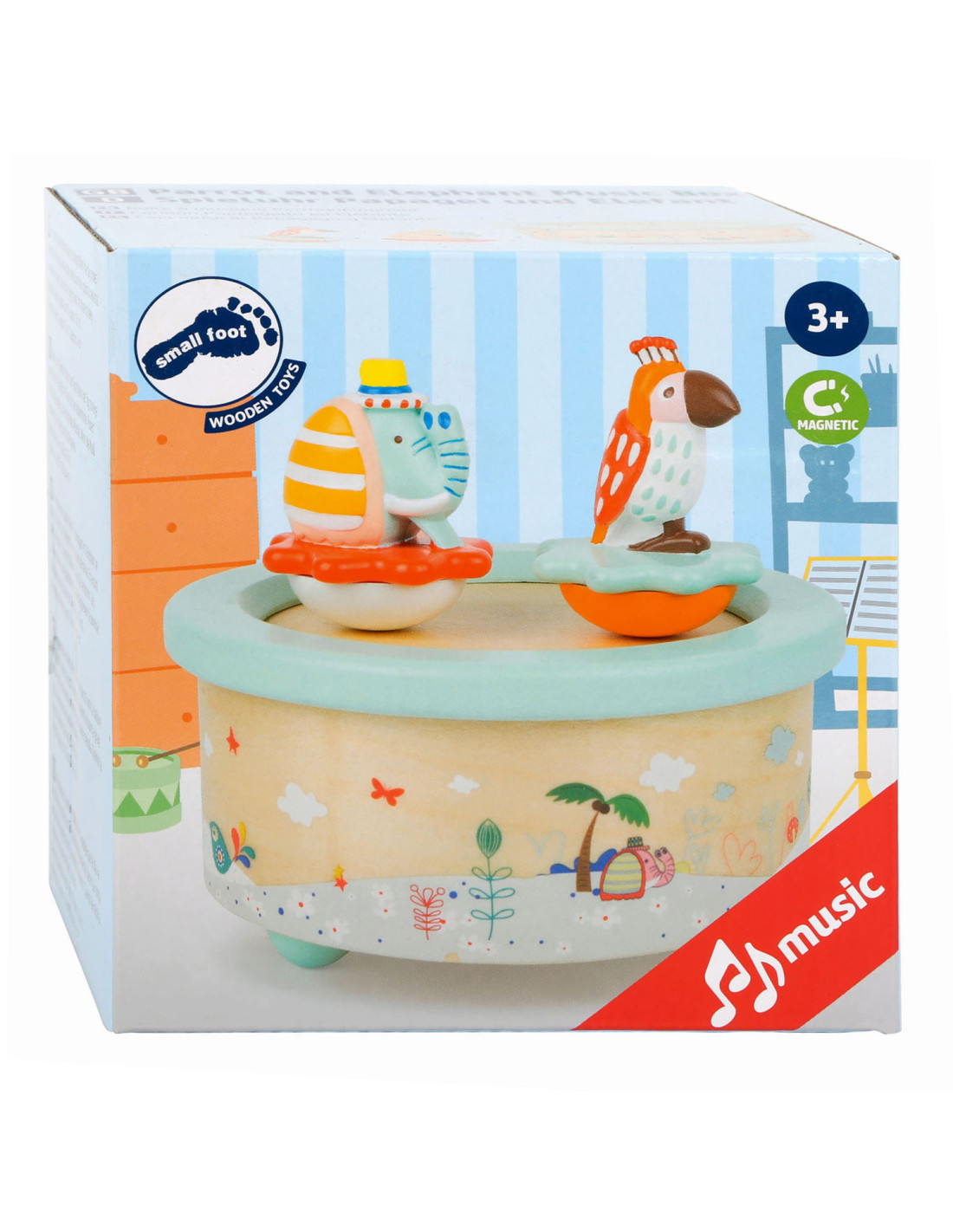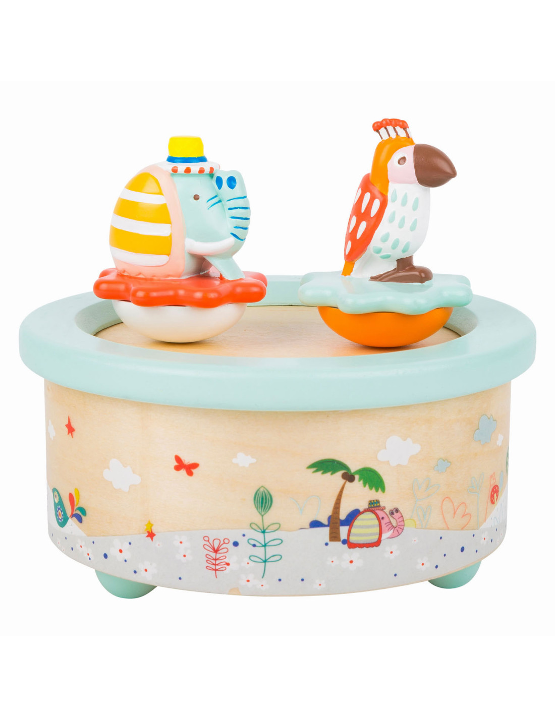 Deze papegaai en olifant willen dansen! Als de dag ten einde loopt, draaien deze schattige dieren vrolijk rond op hun kleurrijke voetstuk op de rustgevende melodie "Wonderful World". Als het lied voorbij is, is het tijd om te slapen. Een prachtig slaaphulpmiddel voor op het nachtkastje. Geschikt vanaf 3 jaar.