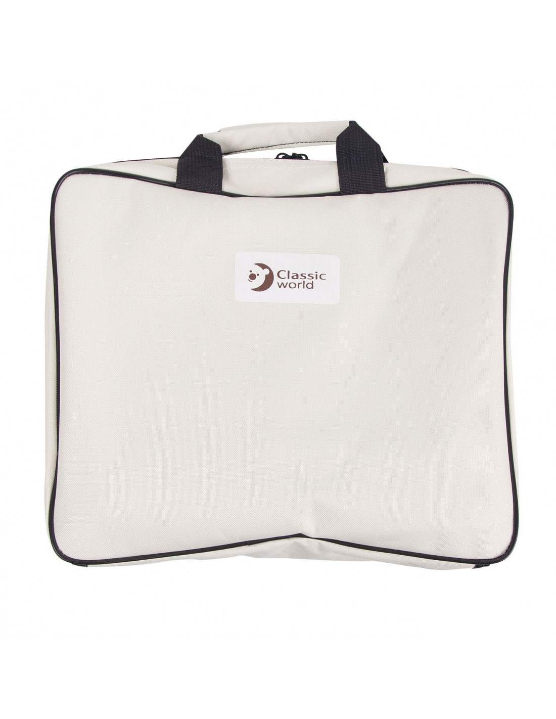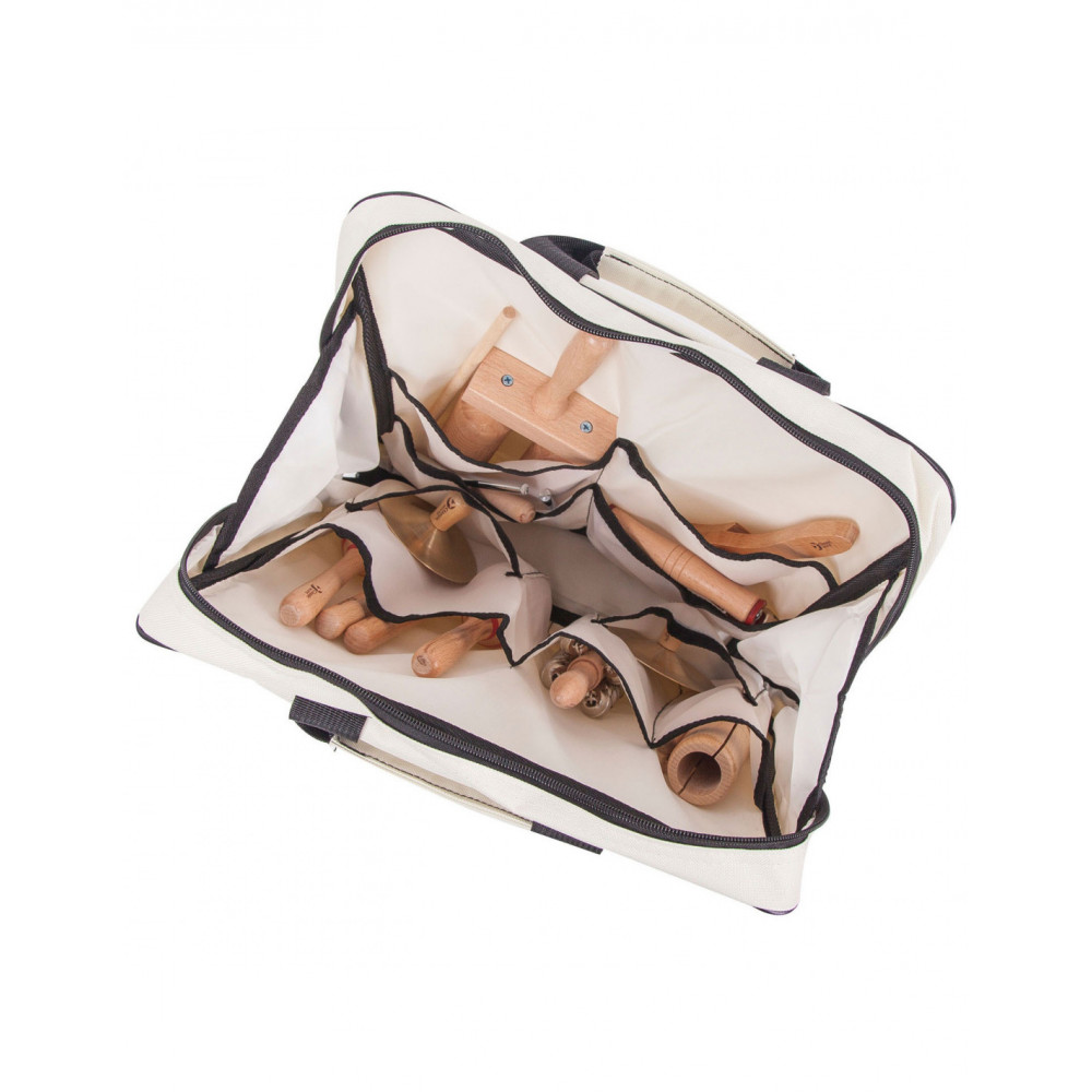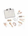 Muziekinstrumentenset van Classic World. Inhoud: maracas, een belletjestamboerijn, claves, een toonblok met stok, een triangel, een handtamboerijn, een cymbal, een castagnet en een dubbele guiro met stok.