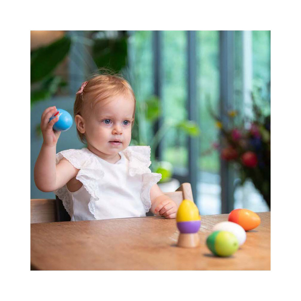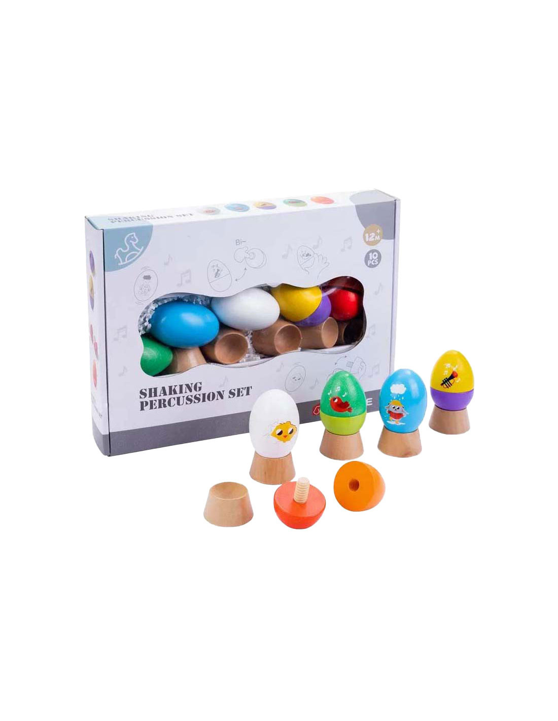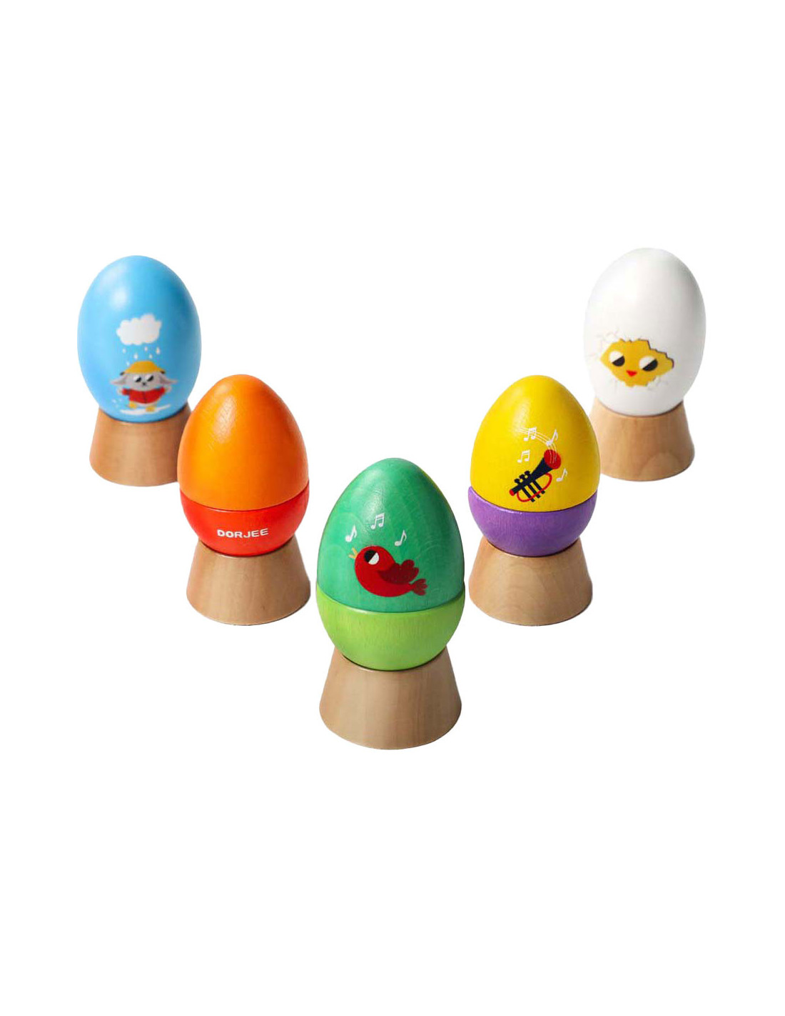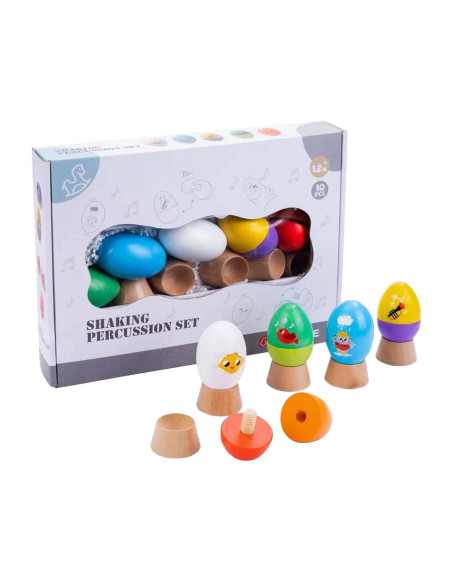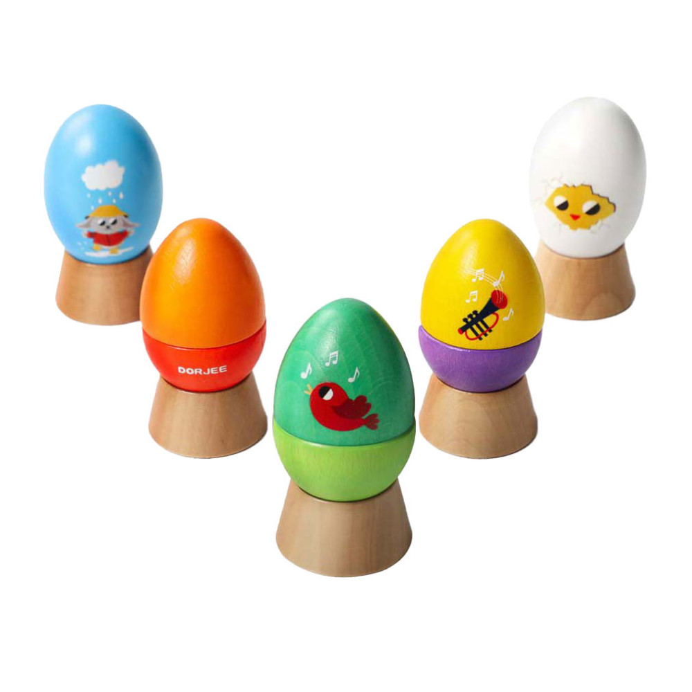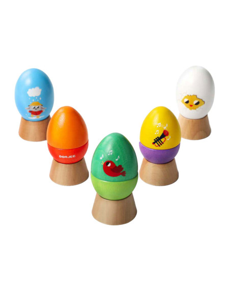 Gekleurde houten percussie eieren, 5 stuks inclusief 5 houders. Geschikt voor kinderen vanaf 12 maanden.