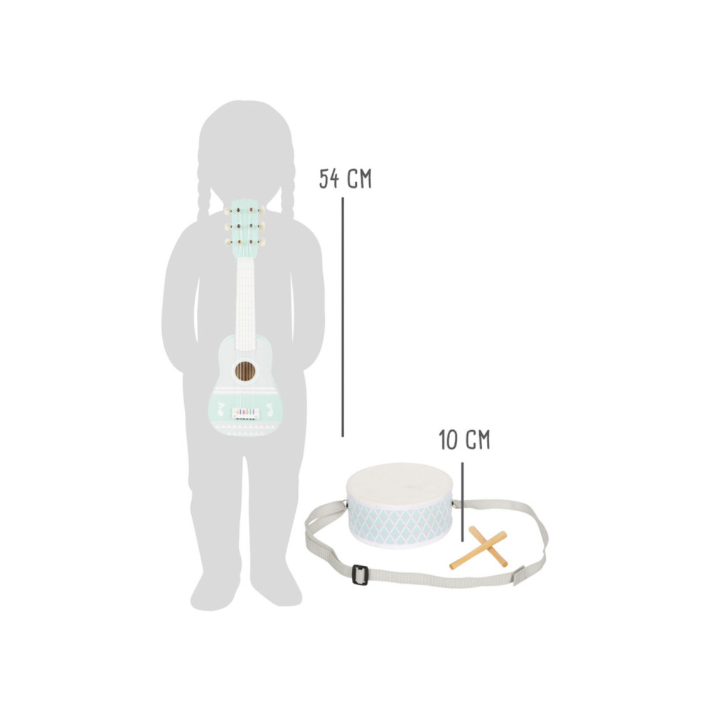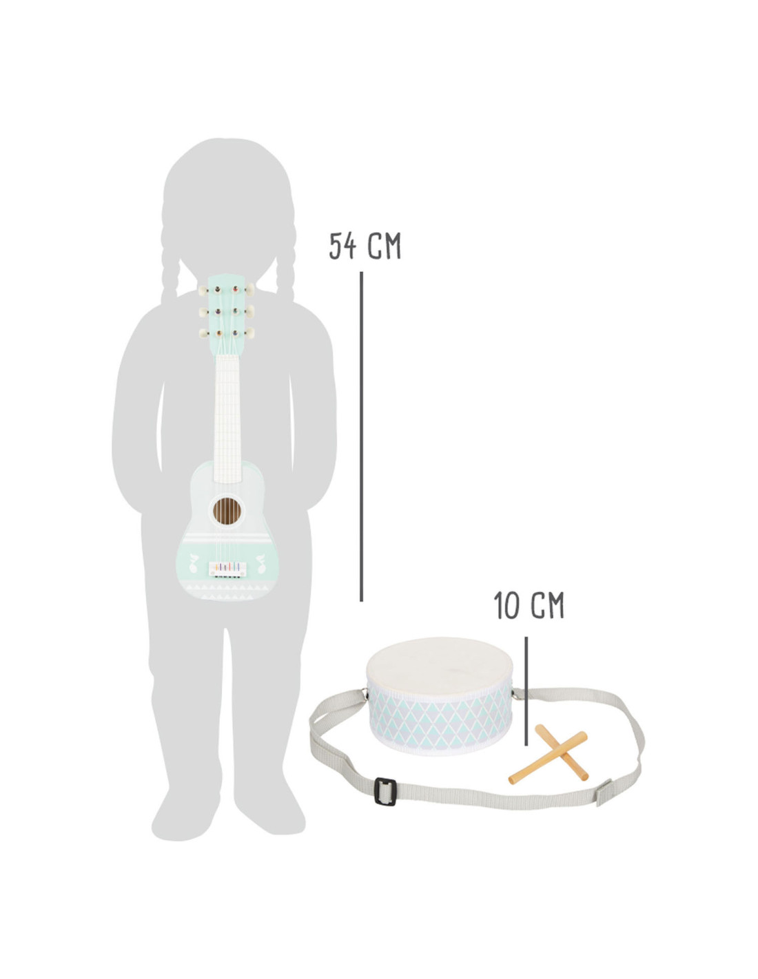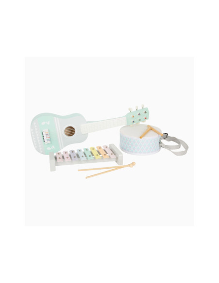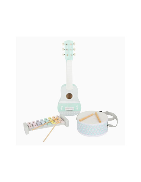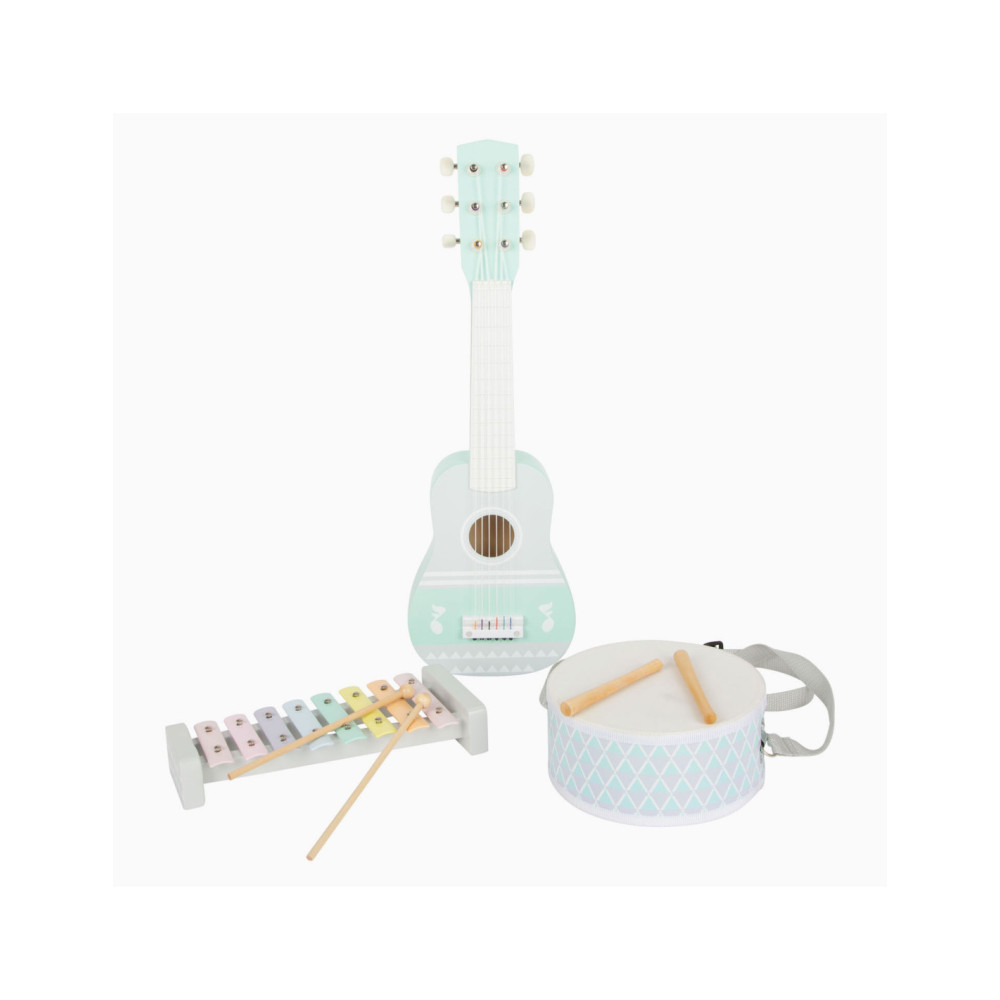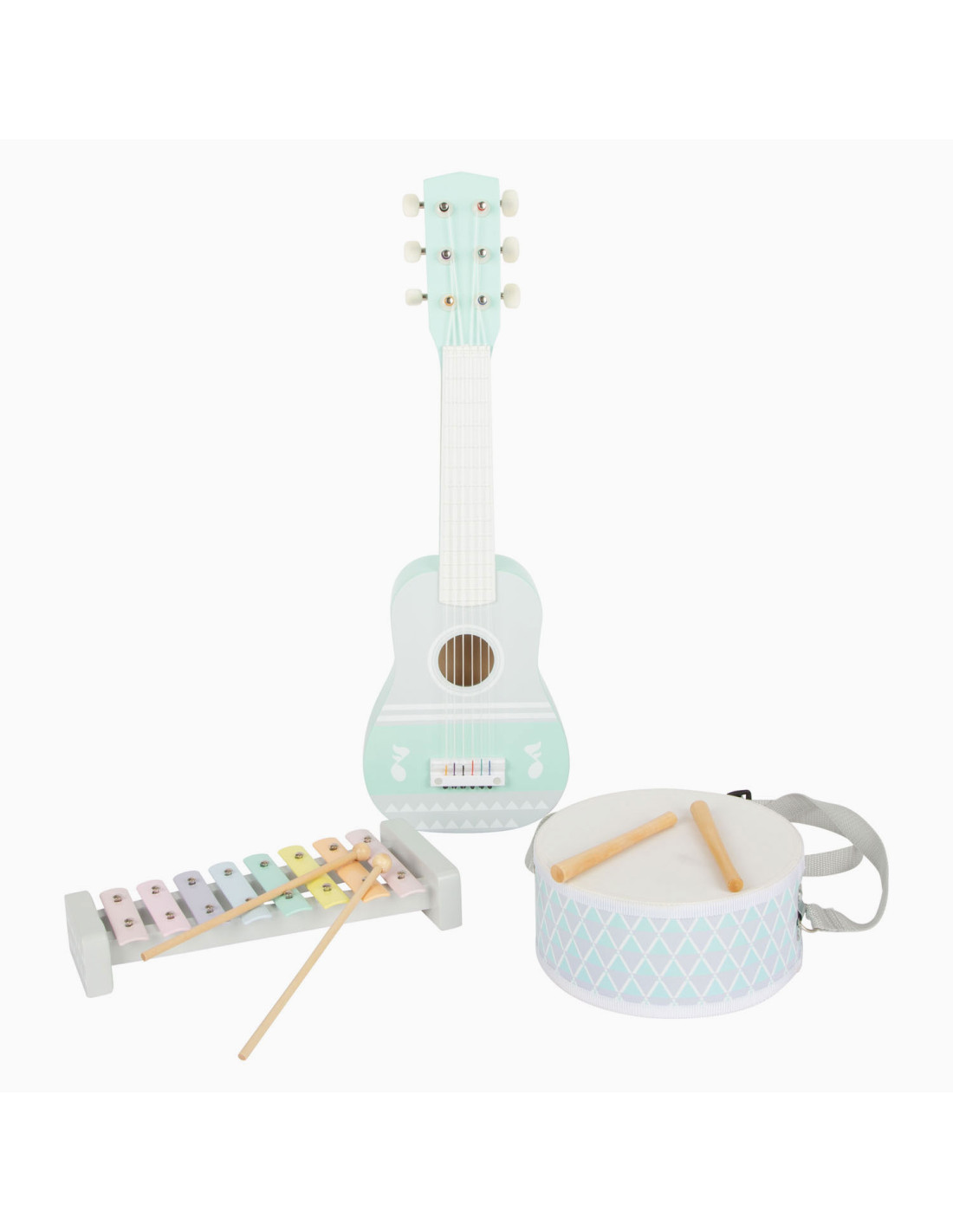 Deze muziekinstrumentenset bestaande uit een gitaar, een xylofoon en een trommel in delicate pastelkleuren zorgt voor allerlei soorten muzikaal plezier. De drie fraai vormgegeven instrumenten toveren de kinderkamer niet alleen om tot concertzaal, maar zijn ook nog eens echte eyecatchers! Met bladmuziek voor gitaar en xylofoon!