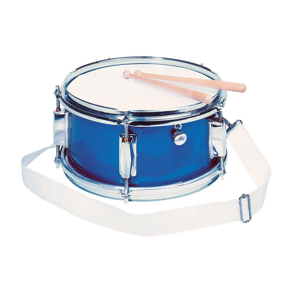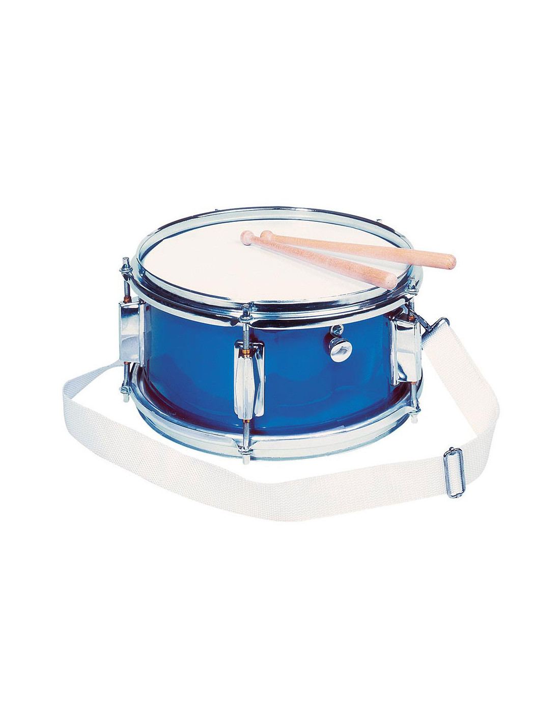 Goki metalen trommel met verstelbare draagband en houten stokken. De trommel heeft een doorsnede van 28 centimeter.