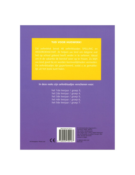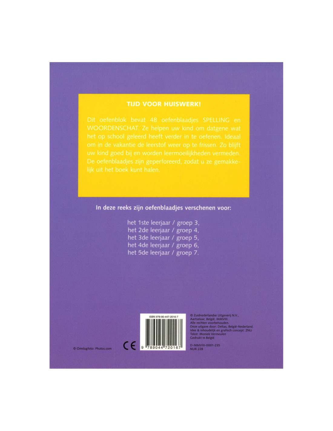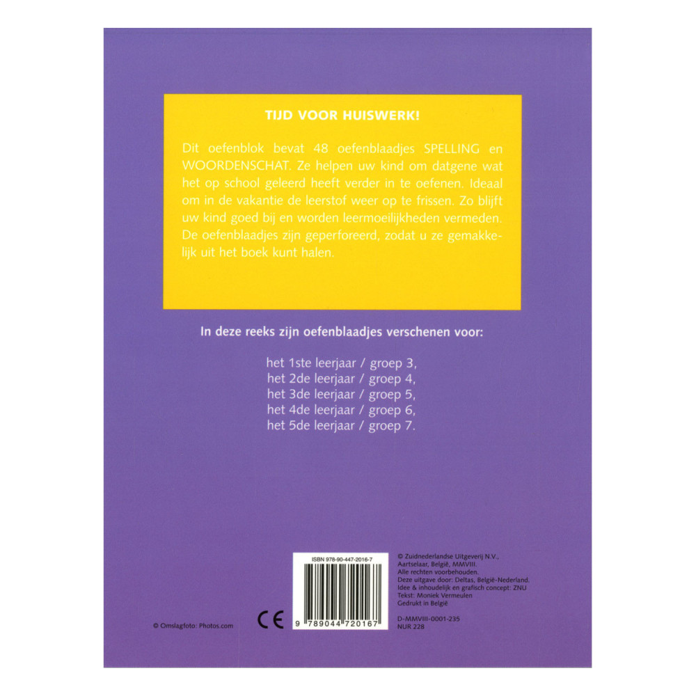Dit oefenblok bevat 48 oefenblaadjes spelling en woordenschat. Ze helpen uw kind om datgene wat het op school geleerd heeft verder in te oefenen. Ideaal om in de vakantie de leerstof weer op te frissen. Zo blijft uw kind goed bij en worden leermoeilijkheden vermeden. De oefenblaadjes zijn geperforeerd, zodat u ze gemakkelijk uit het boek kunt halen.Inhoud: 96 pagina's. Paperback uitvoering.