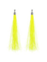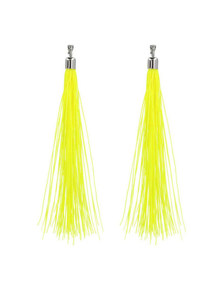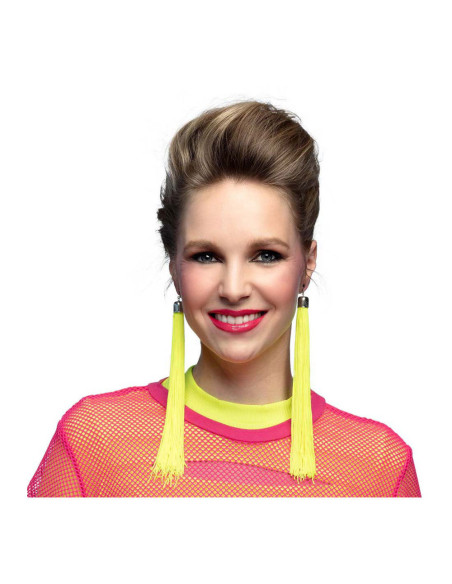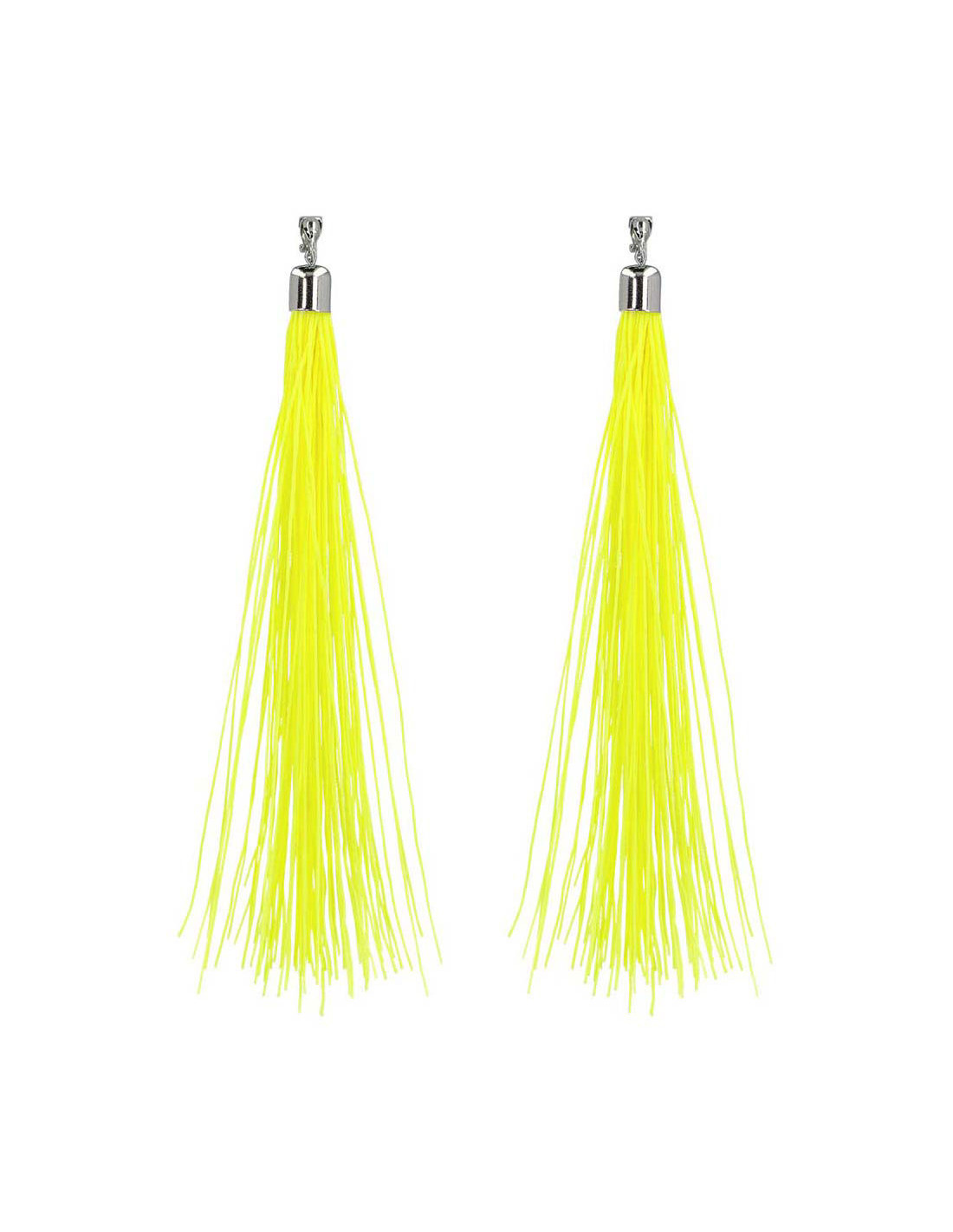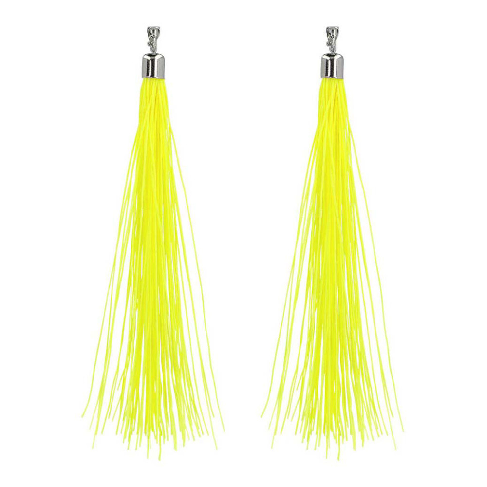 Neongele oorbellen met franjes van 20 cm, gemaakt van kunststof en voorzien van een clipsluiting. Geschikt voor iedereen vanaf 14 jaar.
