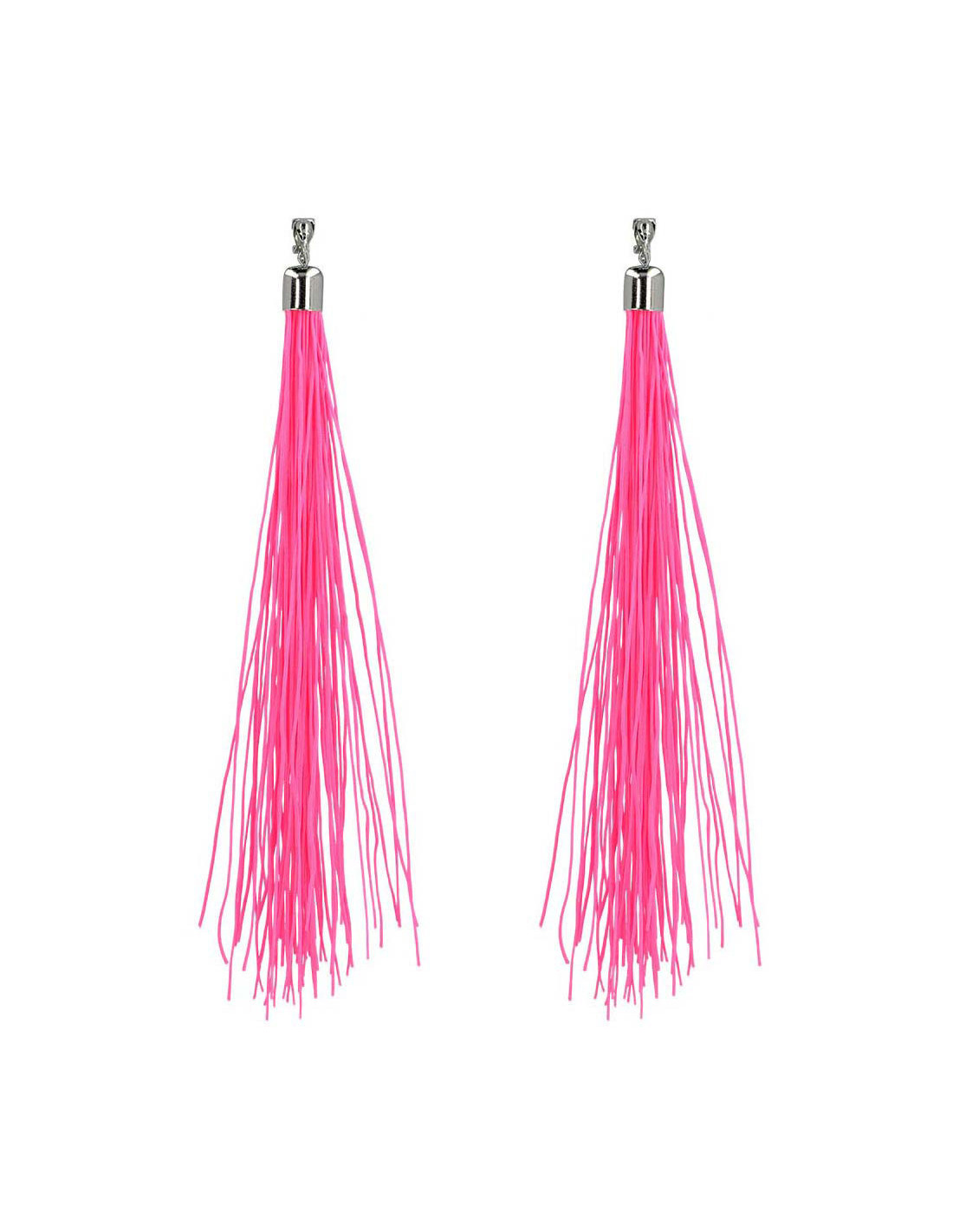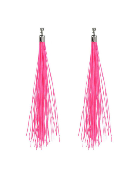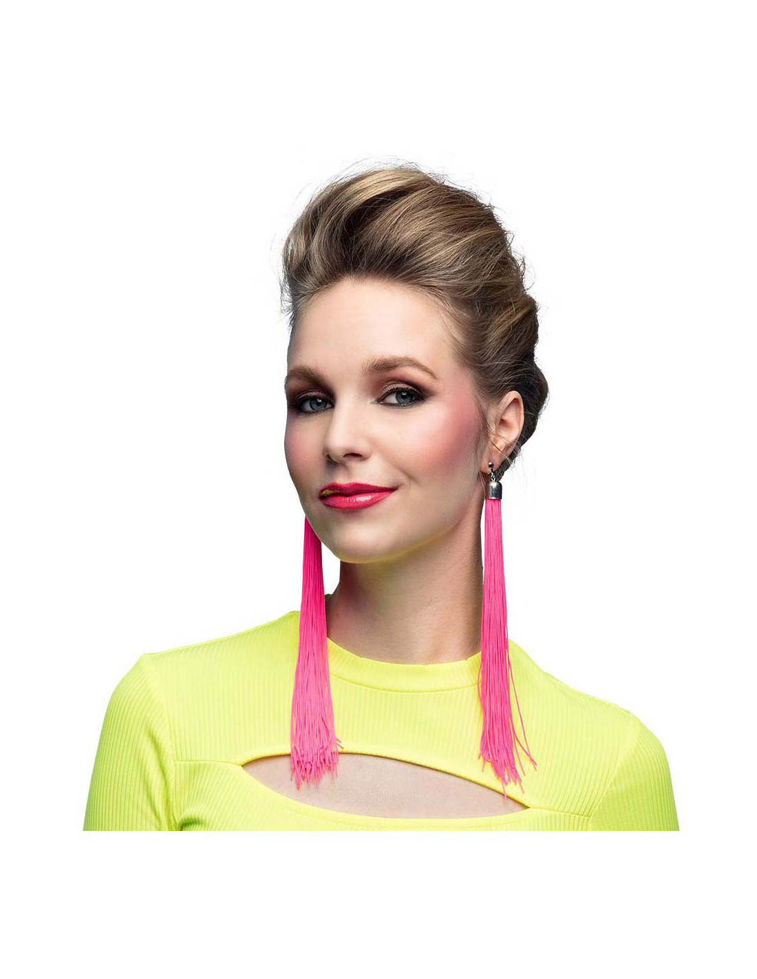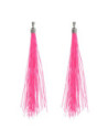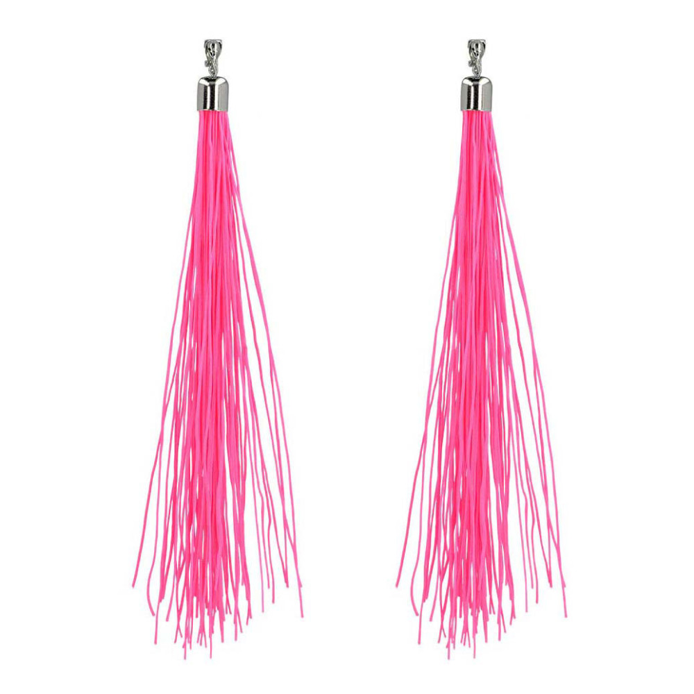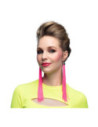 Neonroze oorbellen met franjes van 20 cm, gemaakt van kunststof en voorzien van een clipsluiting. Let op: niet geschikt voor kinderen onder de 14 jaar.