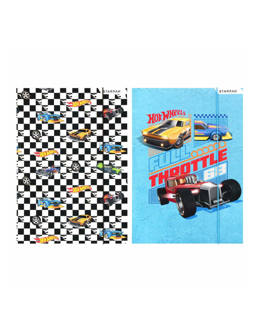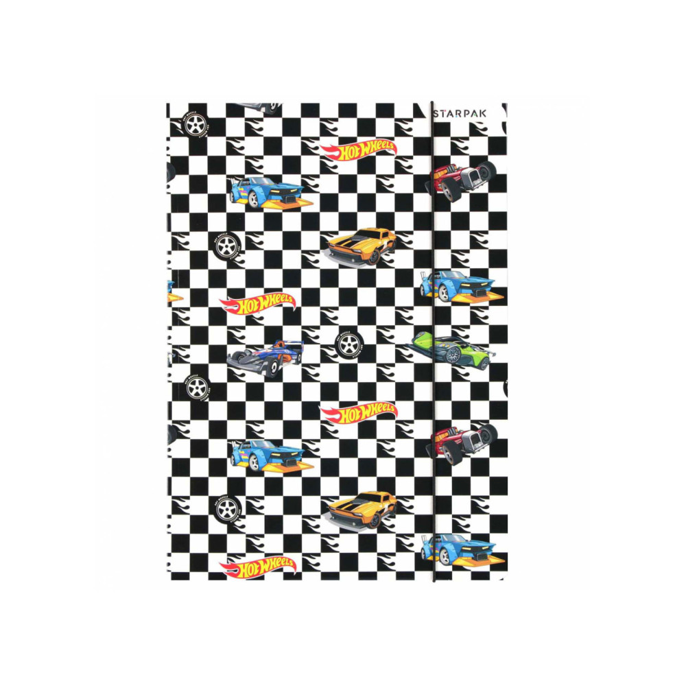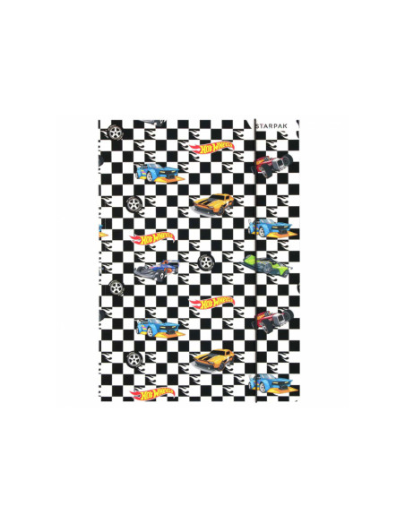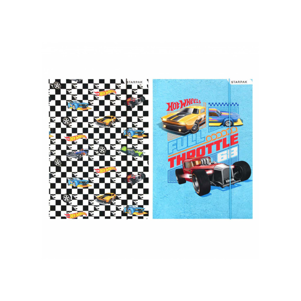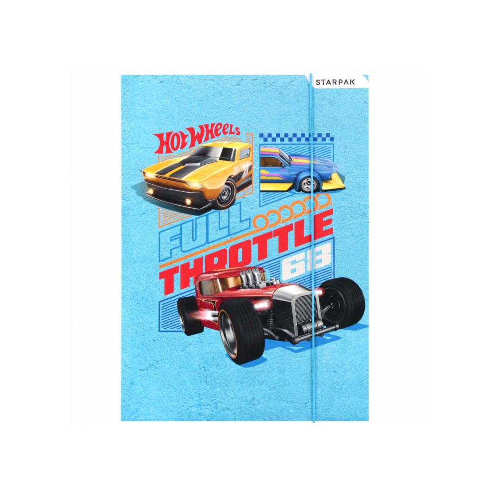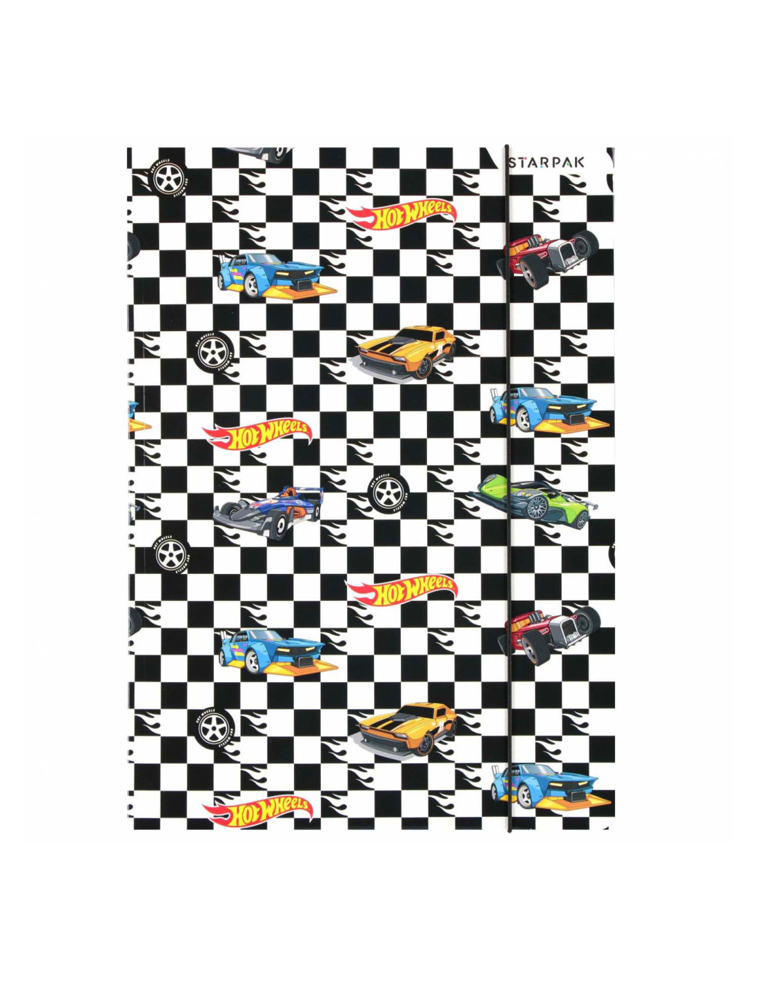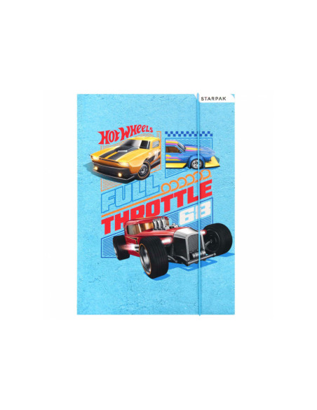 Een map voor het bewaren van documenten, diploma's en kunstwerken. Elastische band van esthetische stof. De map is versierd met kleurrijke Hot Wheels-afbeeldingen en gelakt.