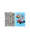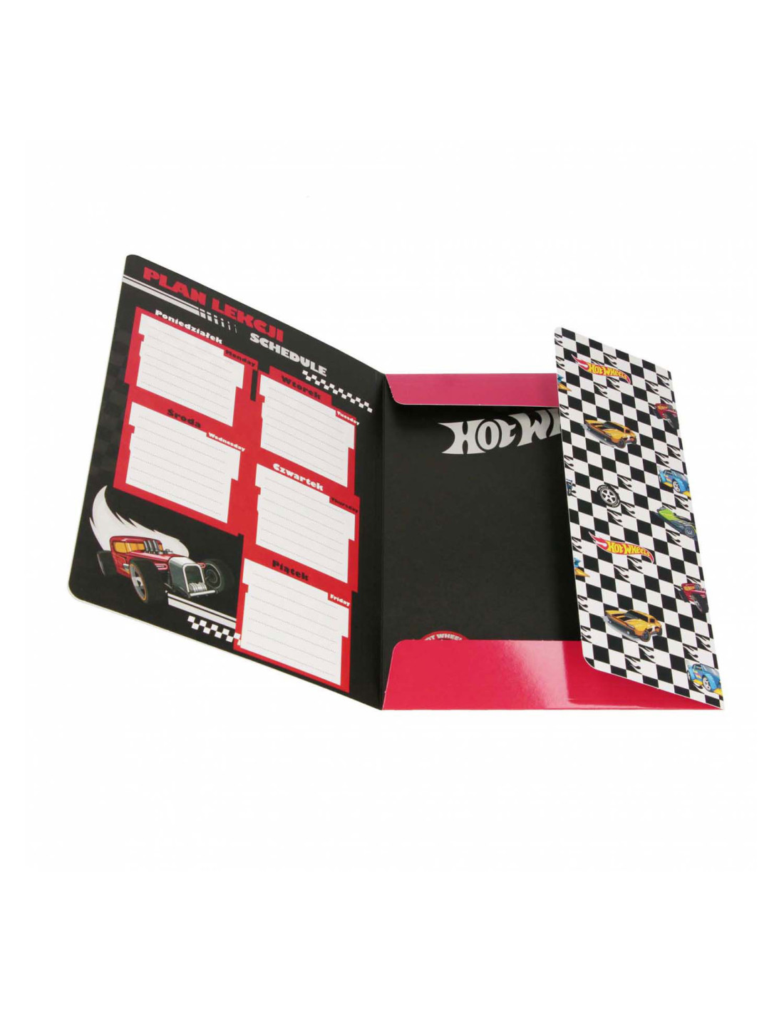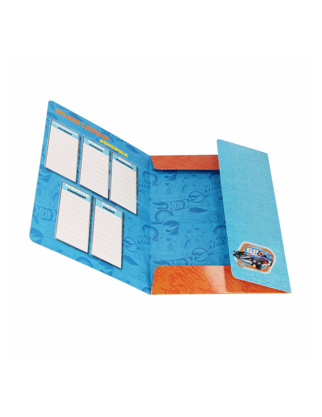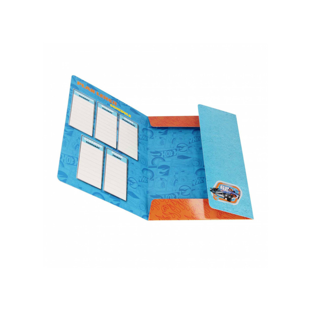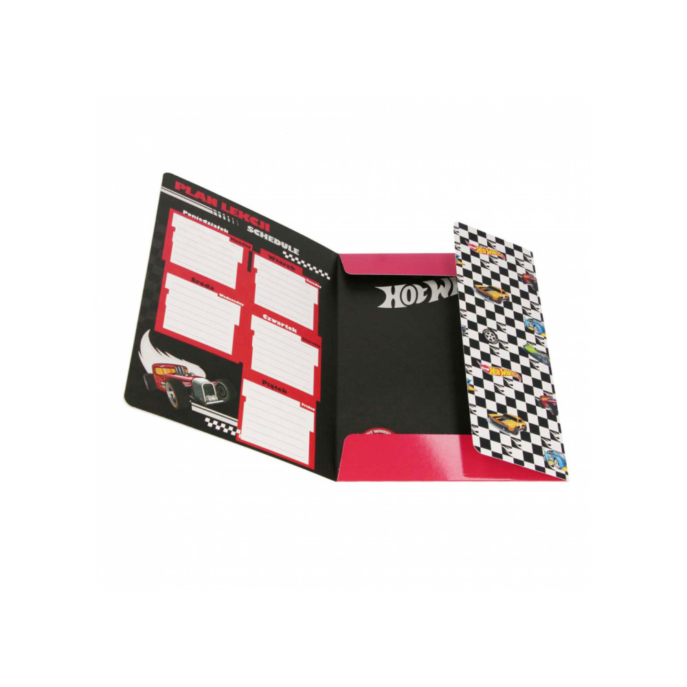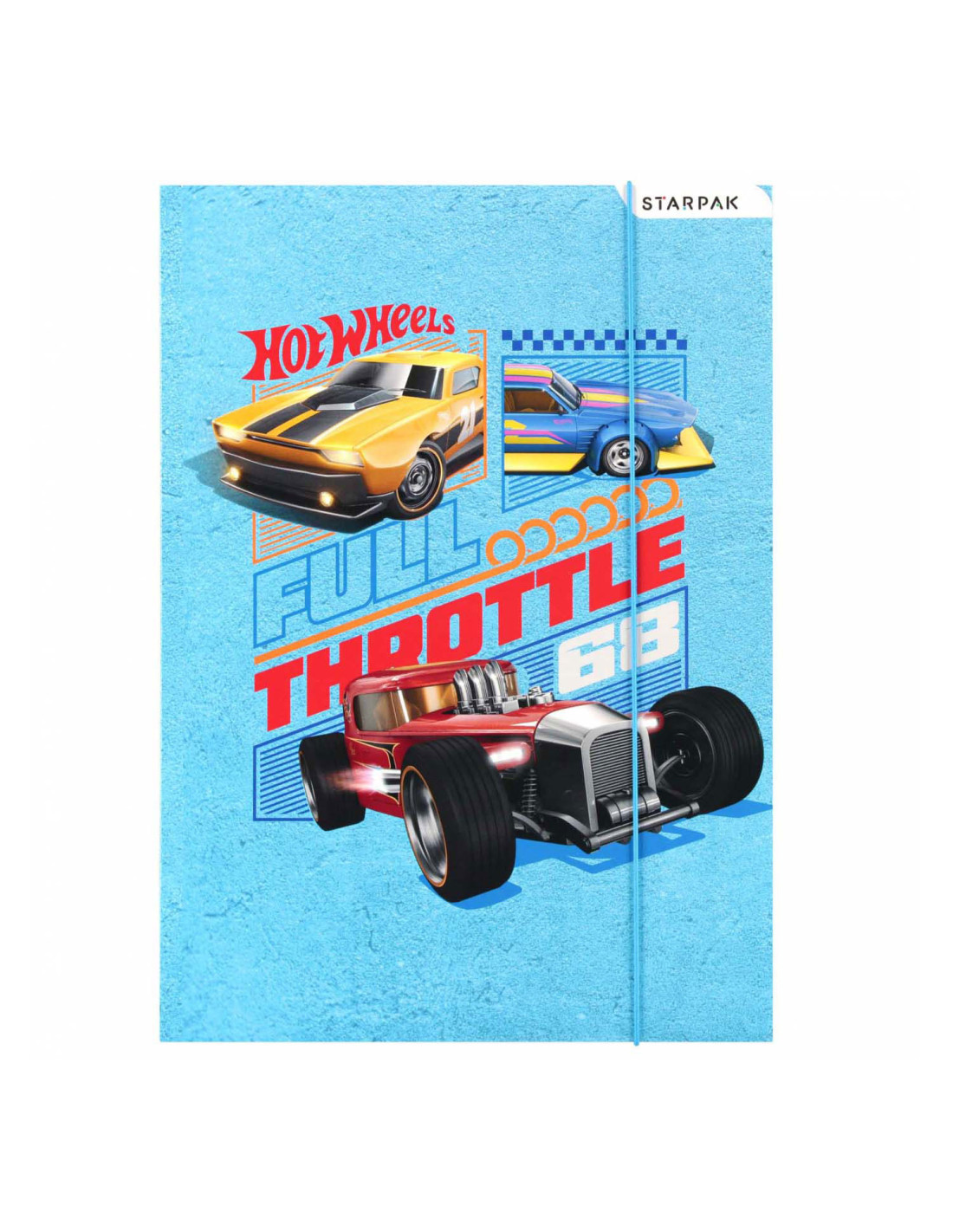 Een map voor het bewaren van documenten, diploma's en kunstwerken. Elastische band van esthetische stof. De map is versierd met kleurrijke Hot Wheels-afbeeldingen en gelakt.