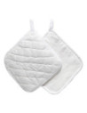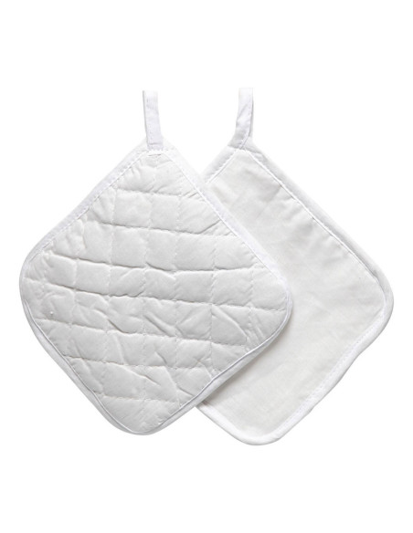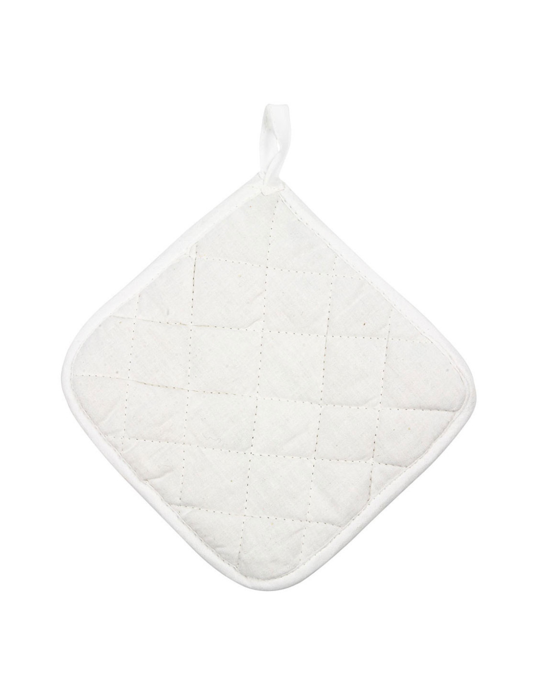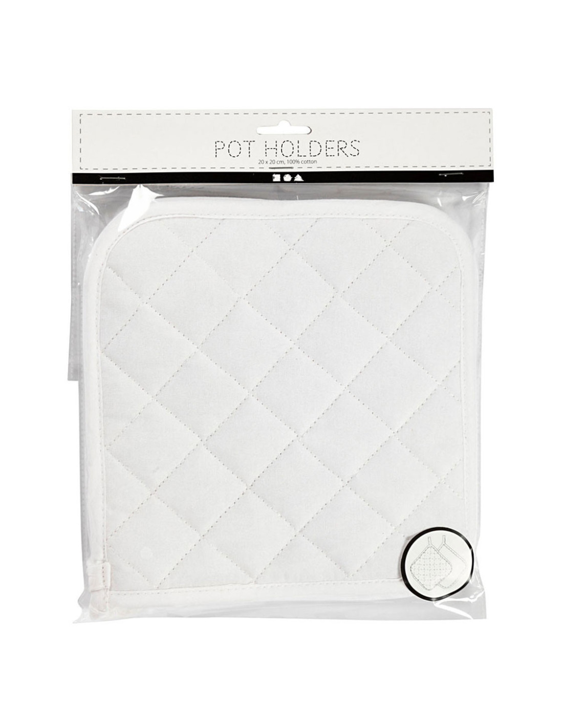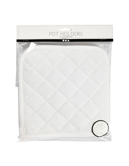 Vierkante, gewatteerde pannenlappen van 100% katoen met ophanglus. Aan één zijde doogestikt.