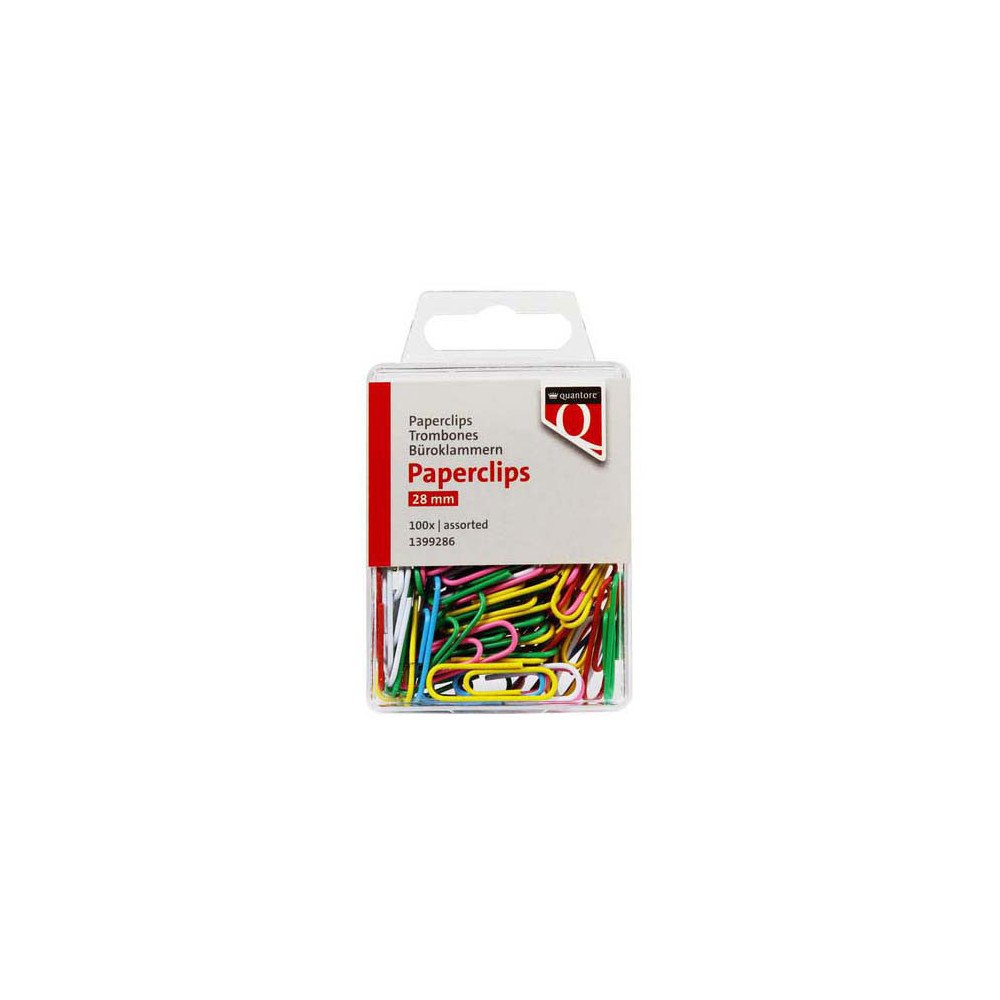 De ronde paperclips van Quantore in vrolijke assorti kleuren zijn perfect voor het organiseren van documenten op een kleurrijke en overzichtelijke manier. Met een lengte van 28mm bieden deze metalen paperclips stevige grip en zijn ze ideaal voor dagelijks gebruik op kantoor, op school of thuis. Dankzij de verschillende kleuren kun je eenvoudig sorteren en categoriseren. Verpakt in een handige blister met 100 stuks, zodat je altijd voldoende bij de hand hebt.