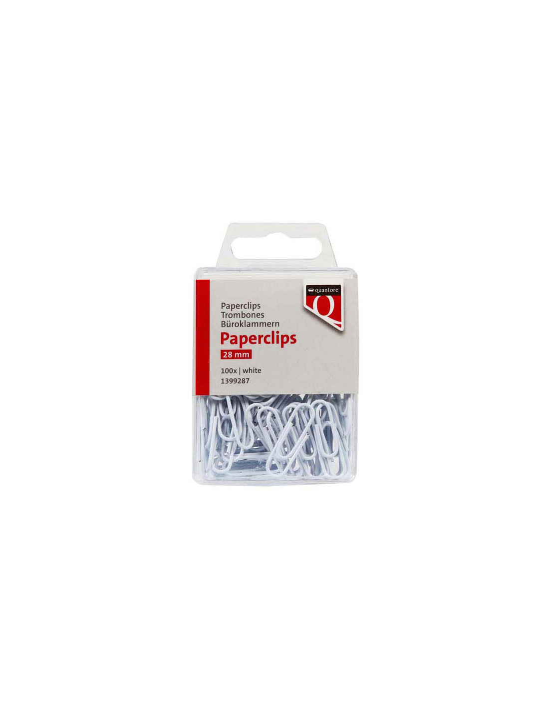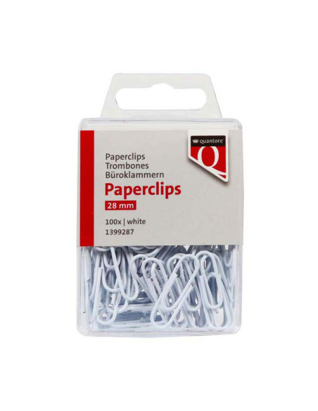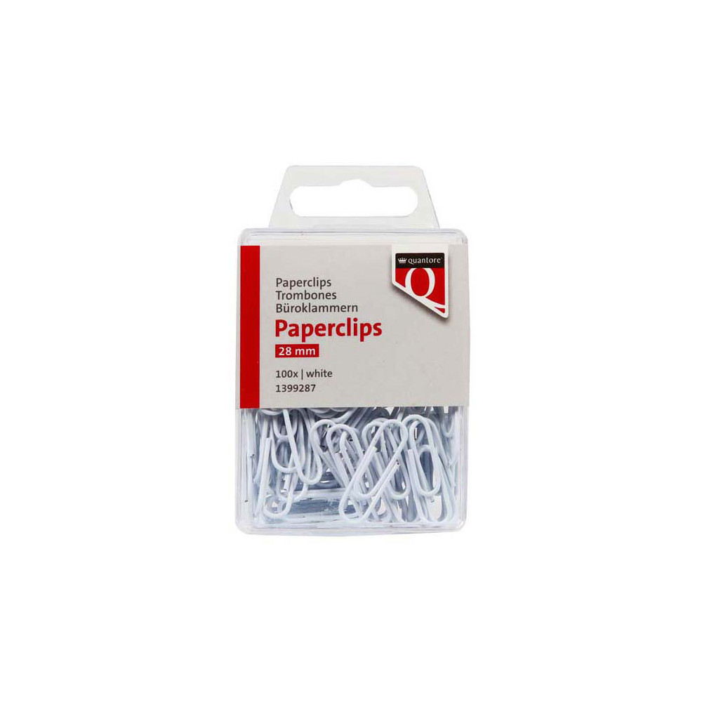 De ronde paperclips van Quantore in wit zijn perfect voor het overzichtelijk en netjes samenvoegen van documenten. Met een lengte van 28mm bieden deze metalen clips een stevige grip zonder je papieren te beschadigen. De neutrale witte kleur geeft een nette en professionele uitstraling, ideaal voor gebruik op kantoor, school of thuis. Verpakt in een handige blister met 100 stuks, zodat je altijd een ruime voorraad hebt.