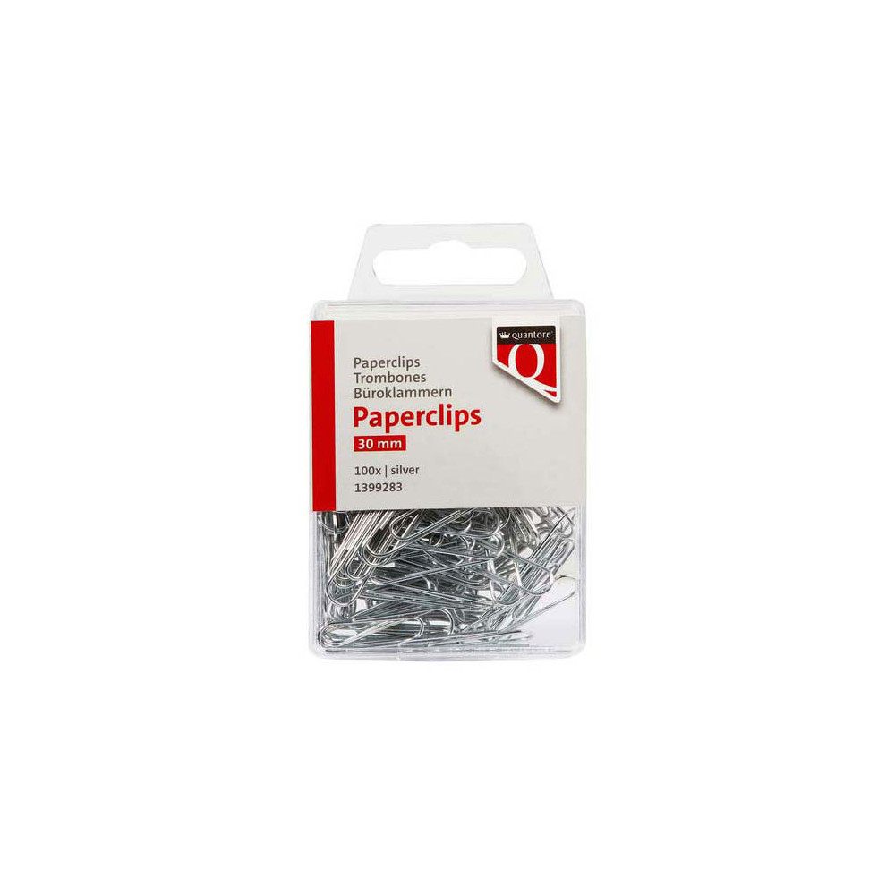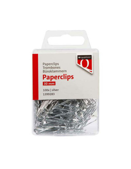 De ronde paperclips van Quantore zijn perfect voor het snel en eenvoudig bundelen van documenten zonder ze te beschadigen. Met een lengte van 30mm zijn deze zilverkleurige paperclips geschikt voor dagelijks gebruik op kantoor, op school of thuis. Ze zijn stevig, duurzaam en houden meerdere vellen papier moeiteloos bij elkaar. Verpakt in een handige blister met 100 stuks, zodat je altijd voldoende bij de hand hebt.