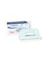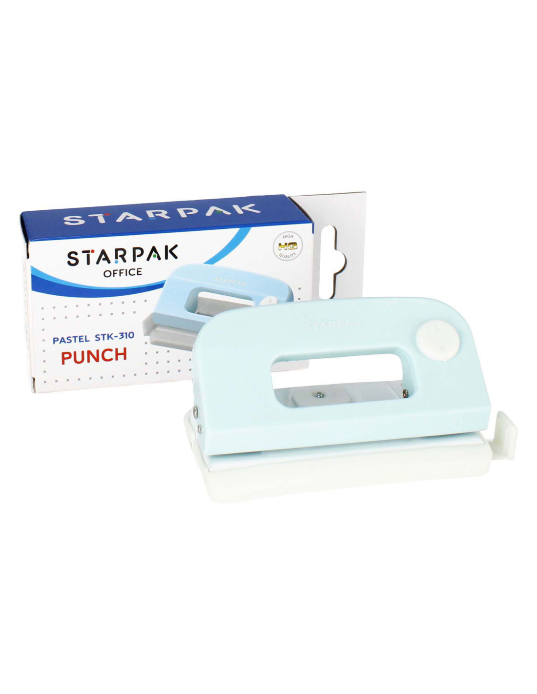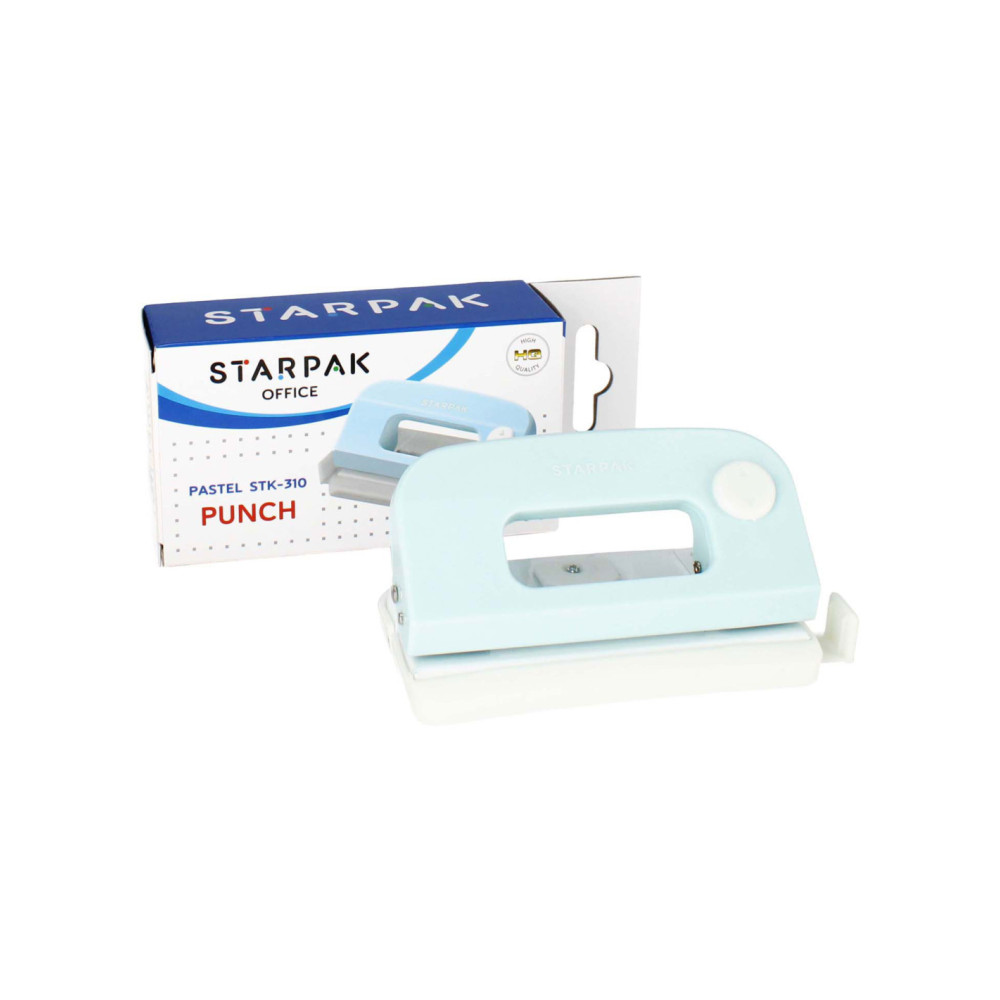 Lichtblauwe perforator. De perforator heeft een perforatieafstand van 80 mm en een perforatiediameter van 5,5 mm. Hij kan 10 vellen per keer perforeren met een papiergewicht van 80g/m²