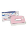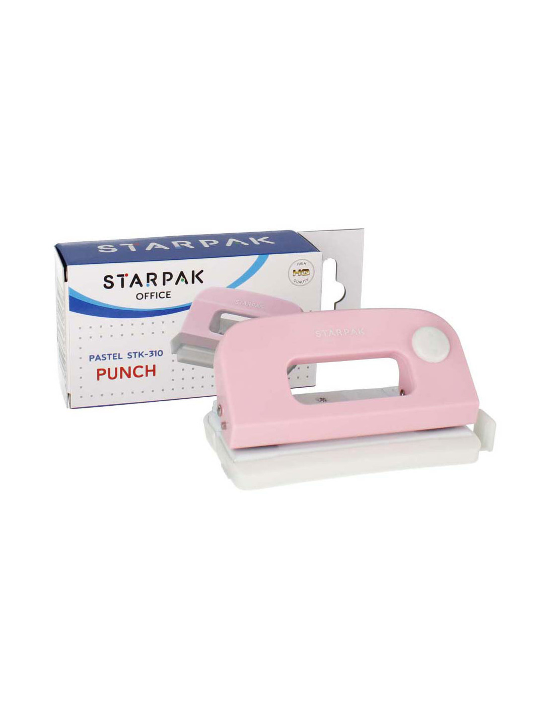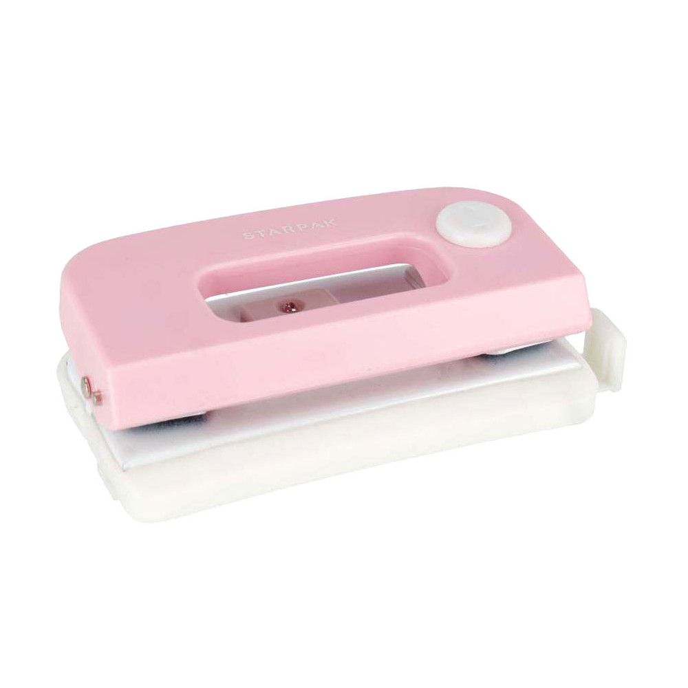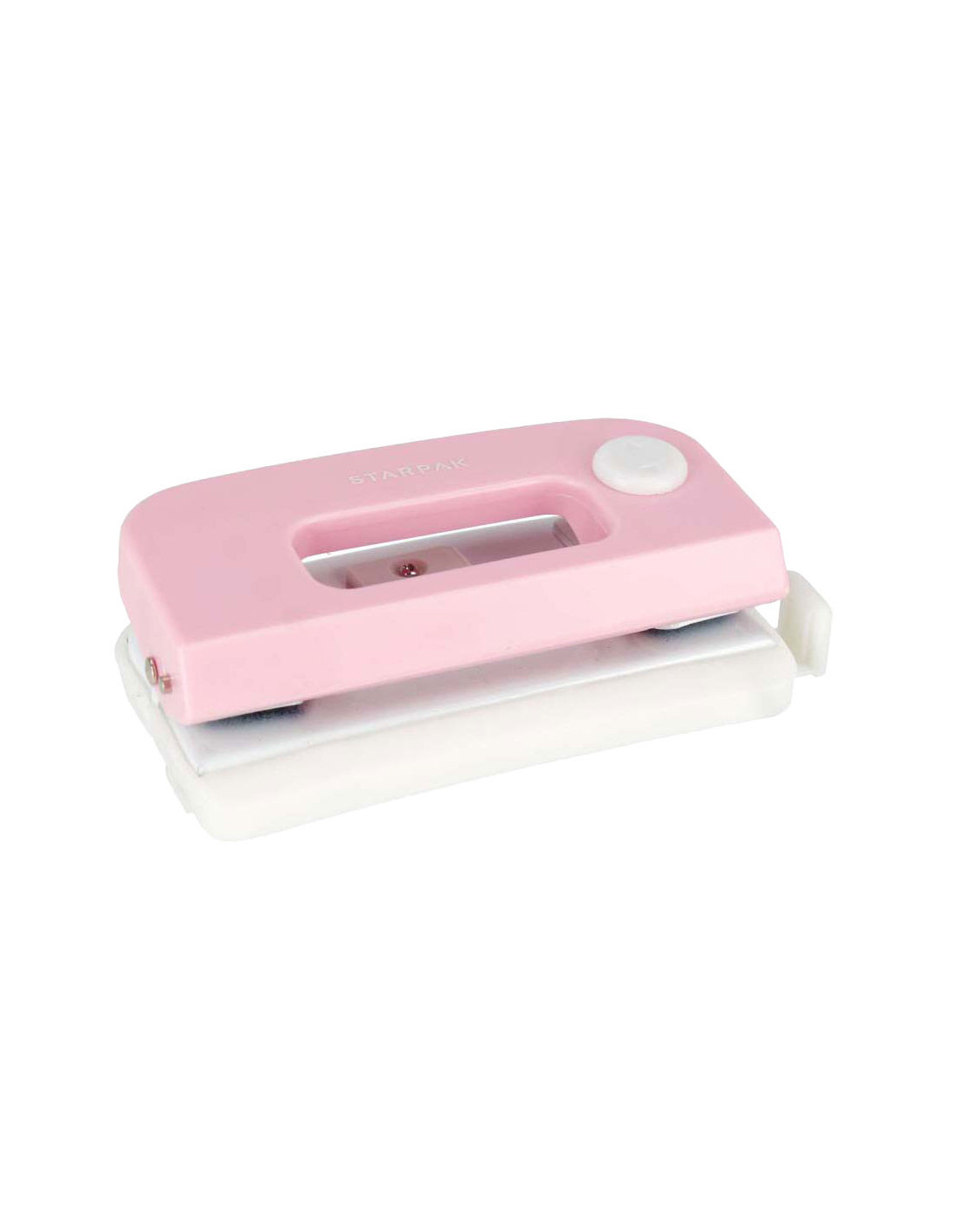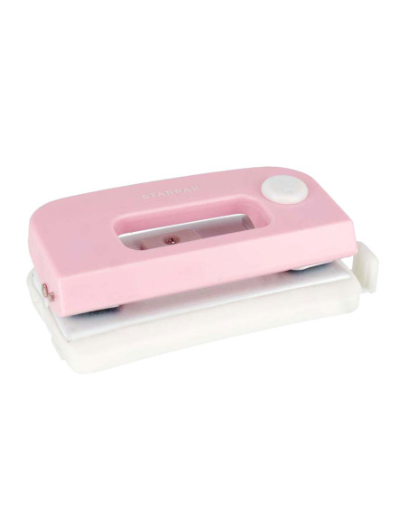 Roze perforator met antislip-voet. De perforator heeft een afstand tussen de gaten van 80 mm en een perforatiediameter van 5,5 mm. Hij kan 10 vellen tegelijk perforeren met een papiergewicht van 80g/m2.