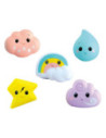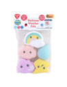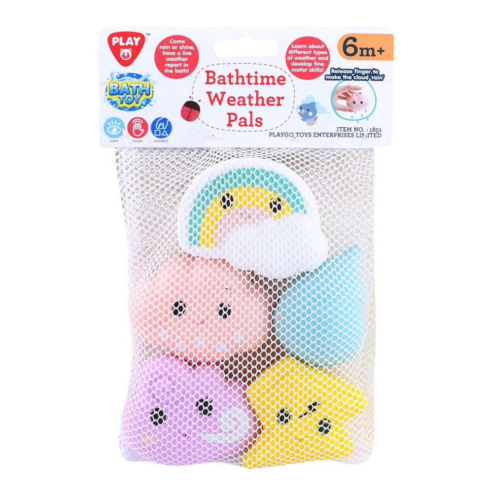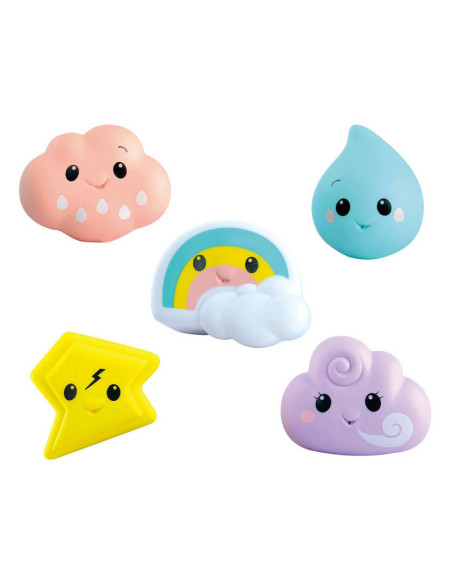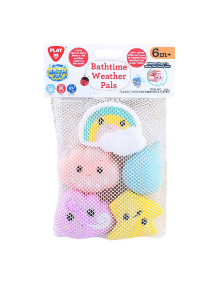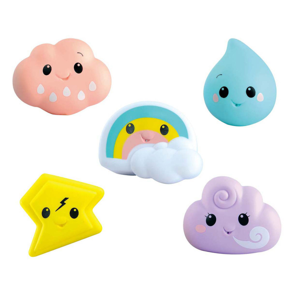 Vrolijk badmomenten op met het Play badspeelgoed weersinvloeden! Deze set van vijf zachte figuren - waaronder een regenwolk, regendruppel, regenboog, bliksemschicht en windwolk - is perfect voor kleine handjes en stimuleert de fantasie. Geschikt vanaf 6 maanden en eenvoudig schoon te maken voor eindeloos spetterplezier.