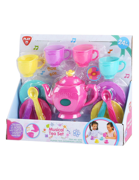 Theeset die geluid maakt als je begint te schenken en een muziekje afspeelt als je op de knop drukt van de theepot. De set bestaat uit een pot, 4 kopjes, 4 schoteltjes en 4 lepeltjes. Geschikt voor kinderen vanaf 24 maanden. Batterijen zijn inbegrepen.