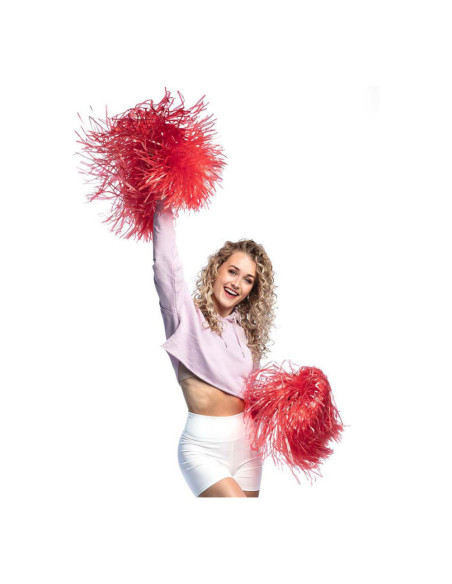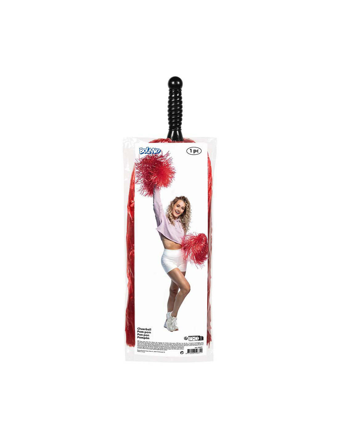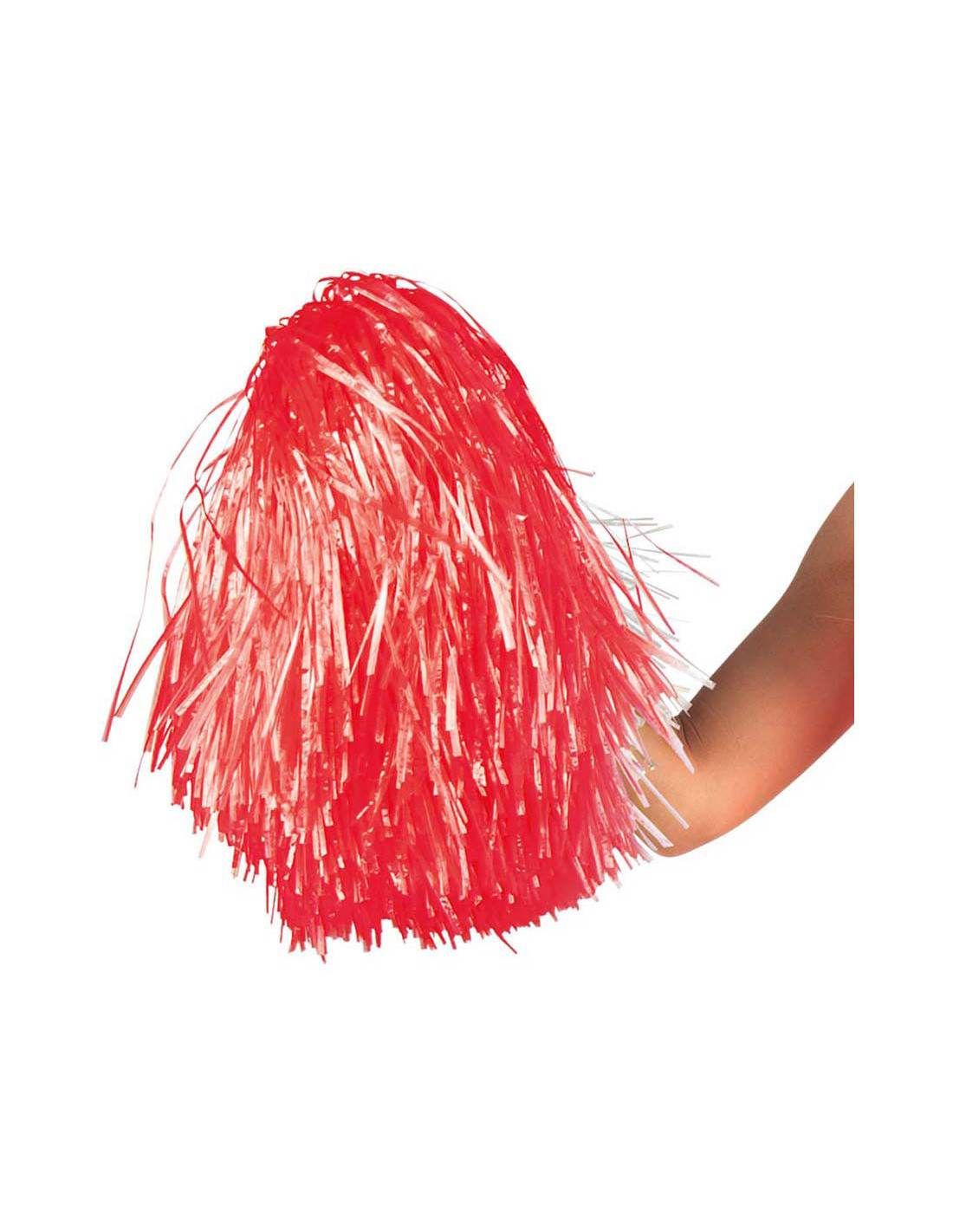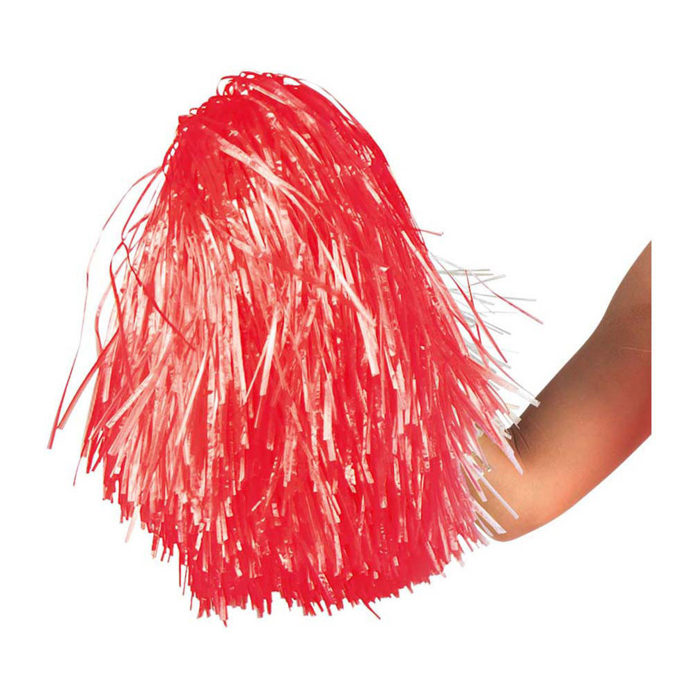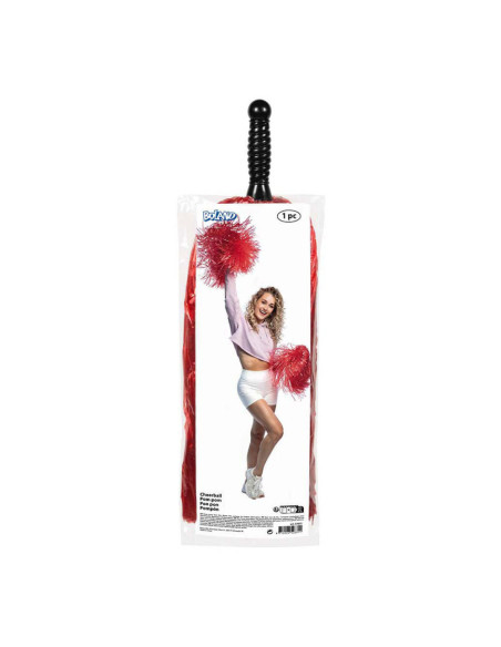 Deze rode pompon heeft een lengte van 28 cm, is gemaakt van kunststof/folie en heeft een dubbele ringhandgreep. Geschikt voor zowel kinderen als volwassenen.