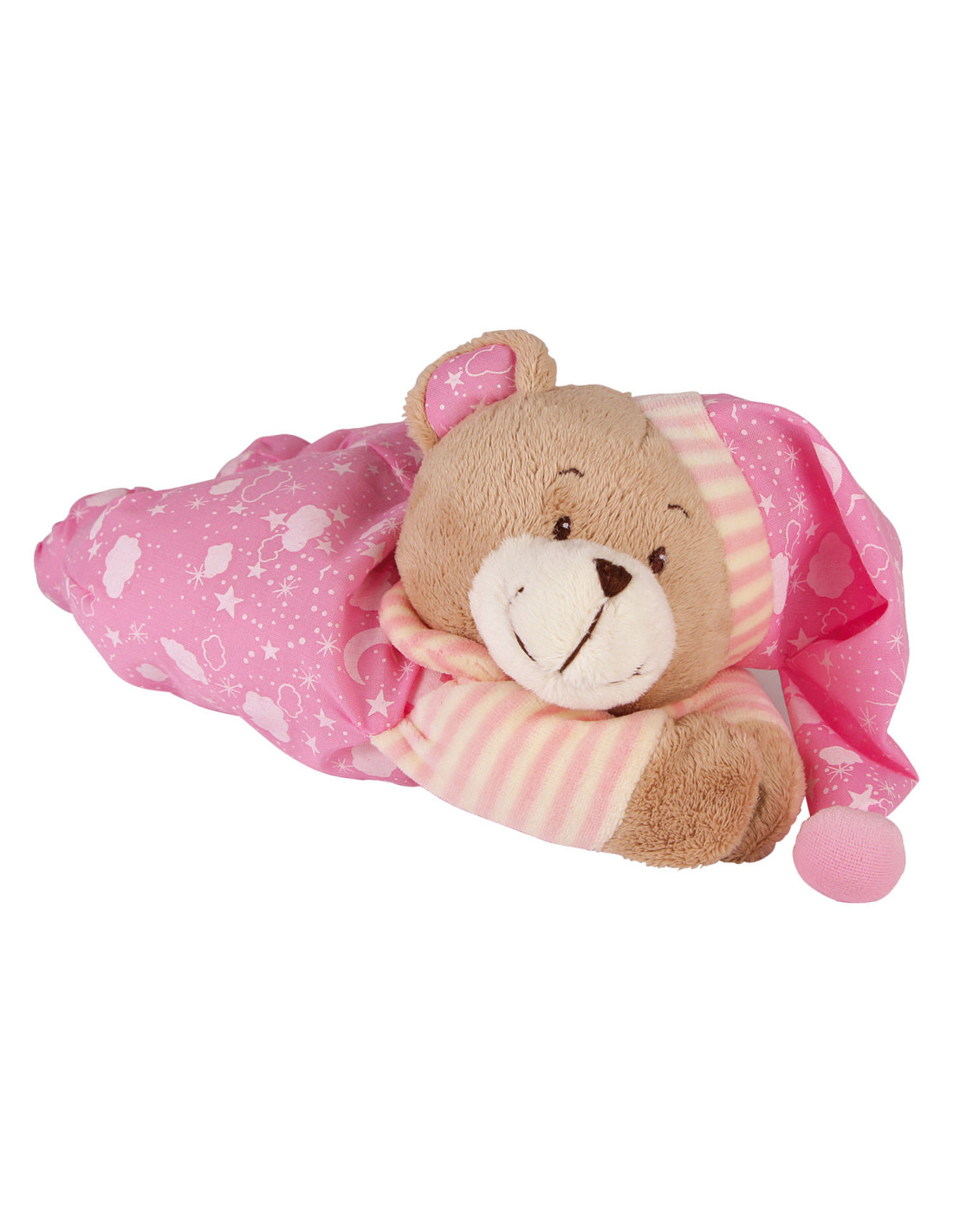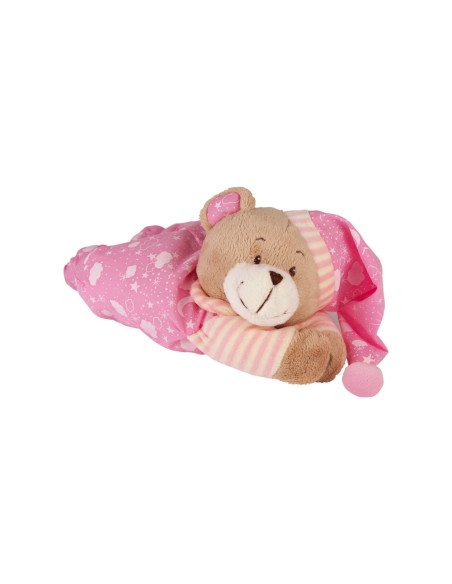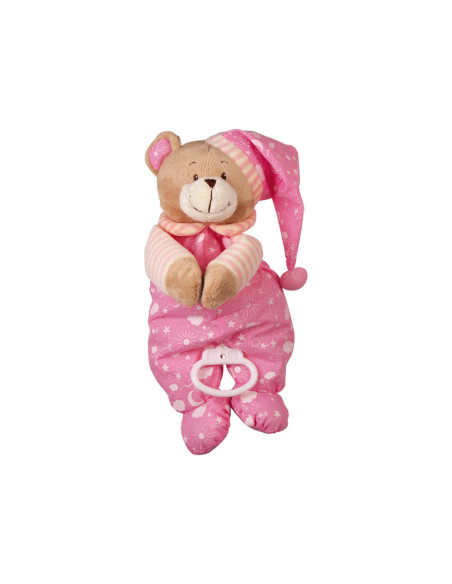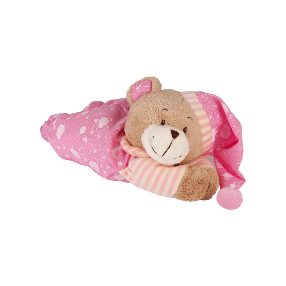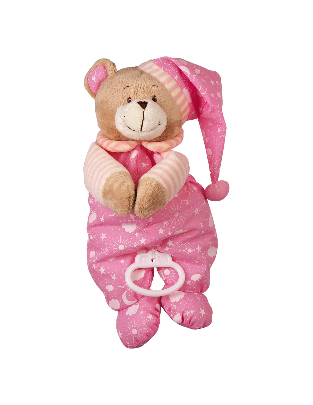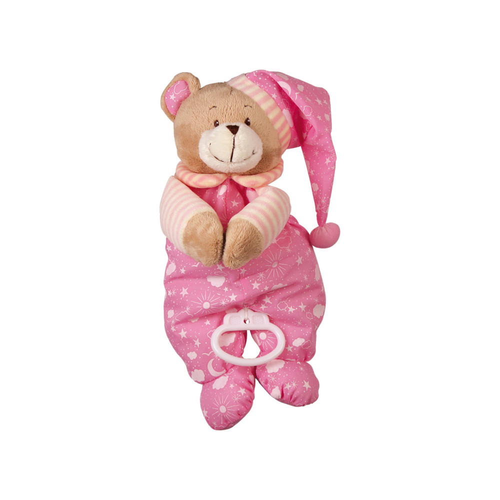 De zachte beer in zijn roze pyjama zorgt voor zoete dromen! Het speelt het bekende slaapliedje "Goedenavond, welterusten"! om op te hangen zijn 2 zachte linten genaaid.