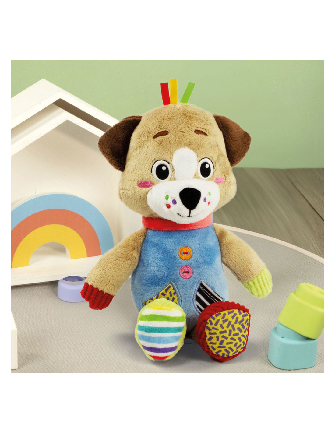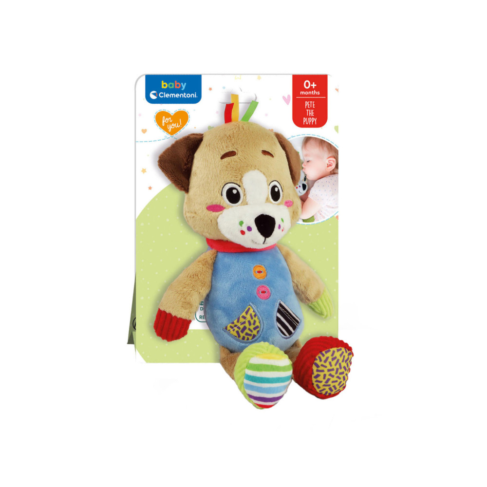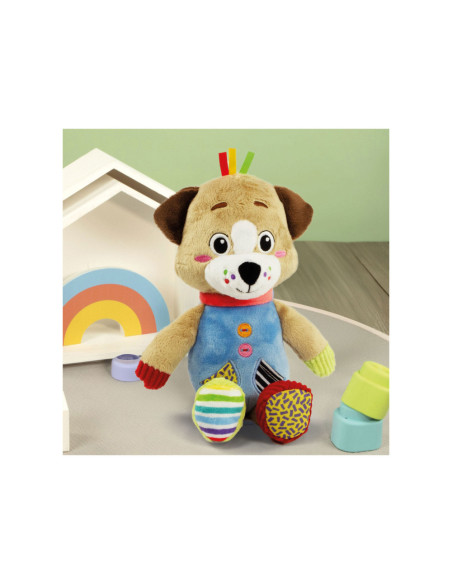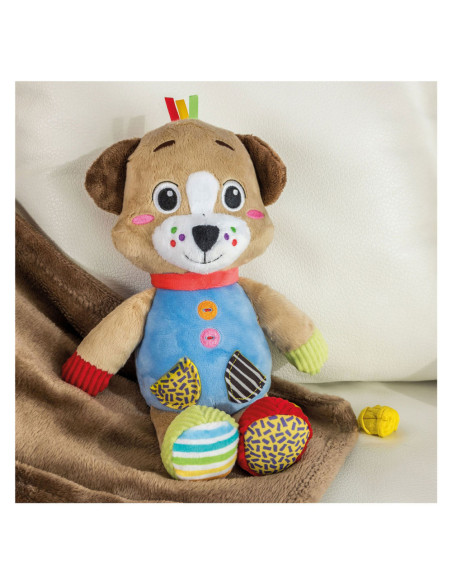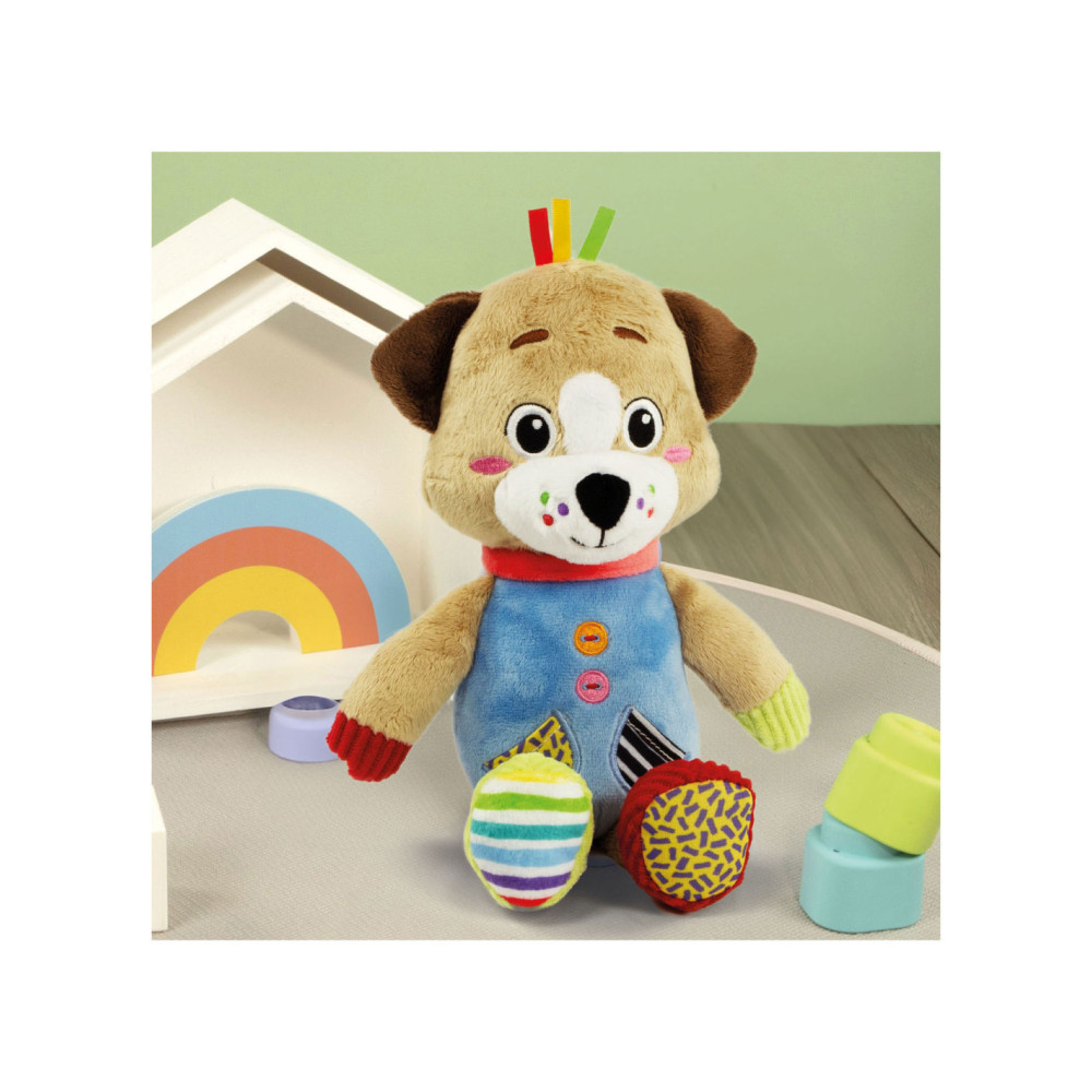 Een heel zacht knuffelhondje, ontworpen voor de allerkleinsten, om ze te laten spelen in een wereld vol zachtheid! De knuffel is gemaakt van verschillende materialen voor de multisensoriële stimulering van het kind en de ontwikkeling van zijn tastzin tijdens de eerste levensfasen. Het perfecte vriendje voor de ontwikkeling van het kind. De zachte knuffel beschikt over een accessoire om op te bijten, ontworpen voor baby's die tandjes krijgen. Machinewasbaar.