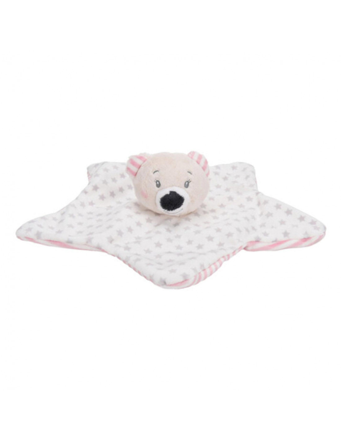 Knuffeldoekje in de vorm van een ster met een berenhoofdje. Gemaakt van polyester uit gerecyclede plastic flessen. Geschikt vanaf 0 maanden oud. Kleur: roze.