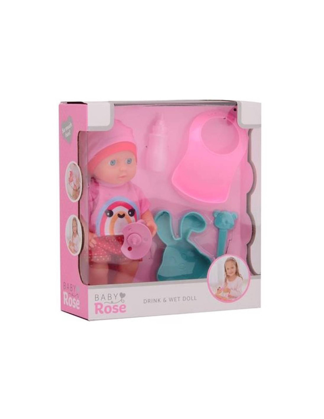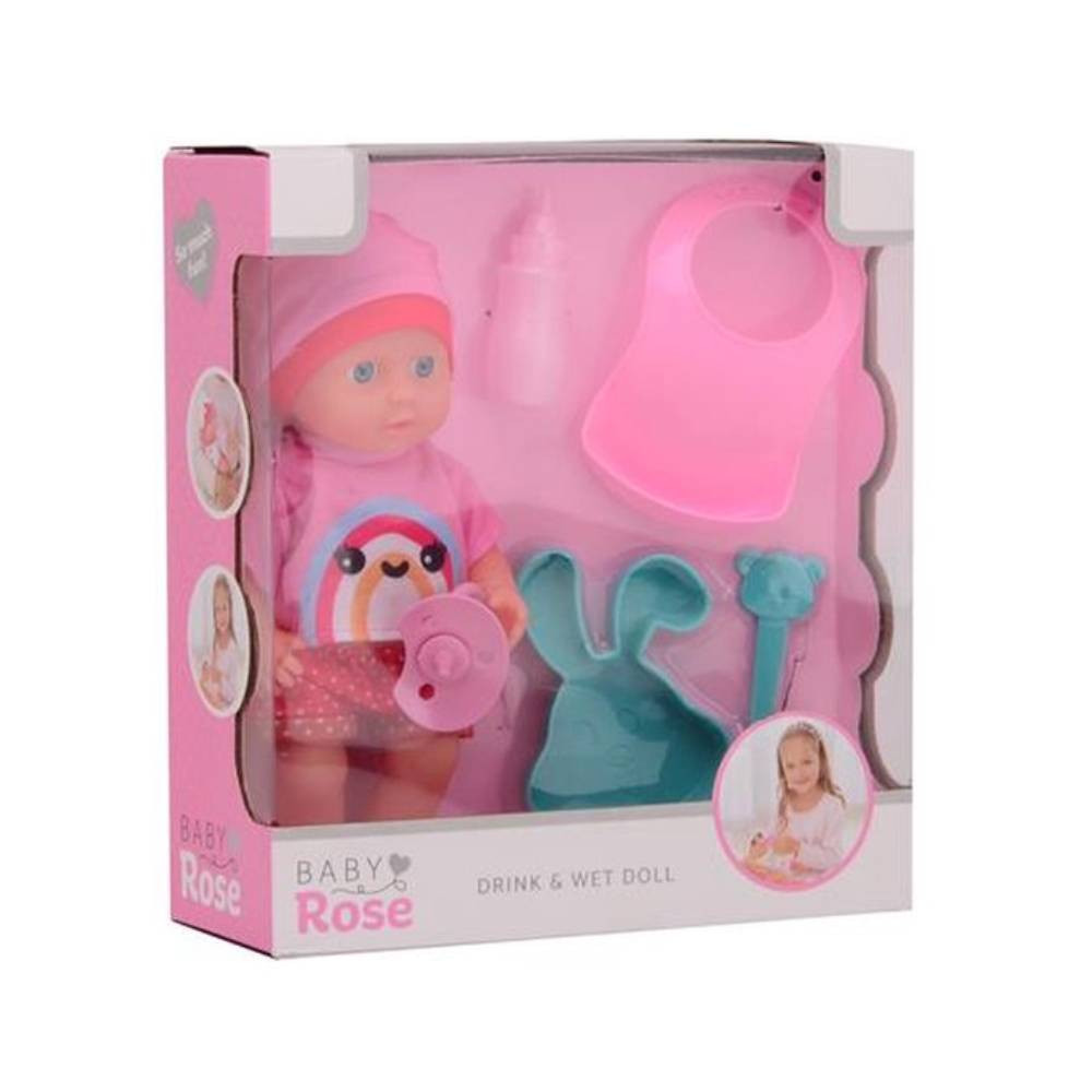 Babypop Rose met drink- en plasfunctie. De pop is 20 cm groot en wordt geleverd met verschillende accessoires. Geschikt voor kinderen vanaf 3 jaar.