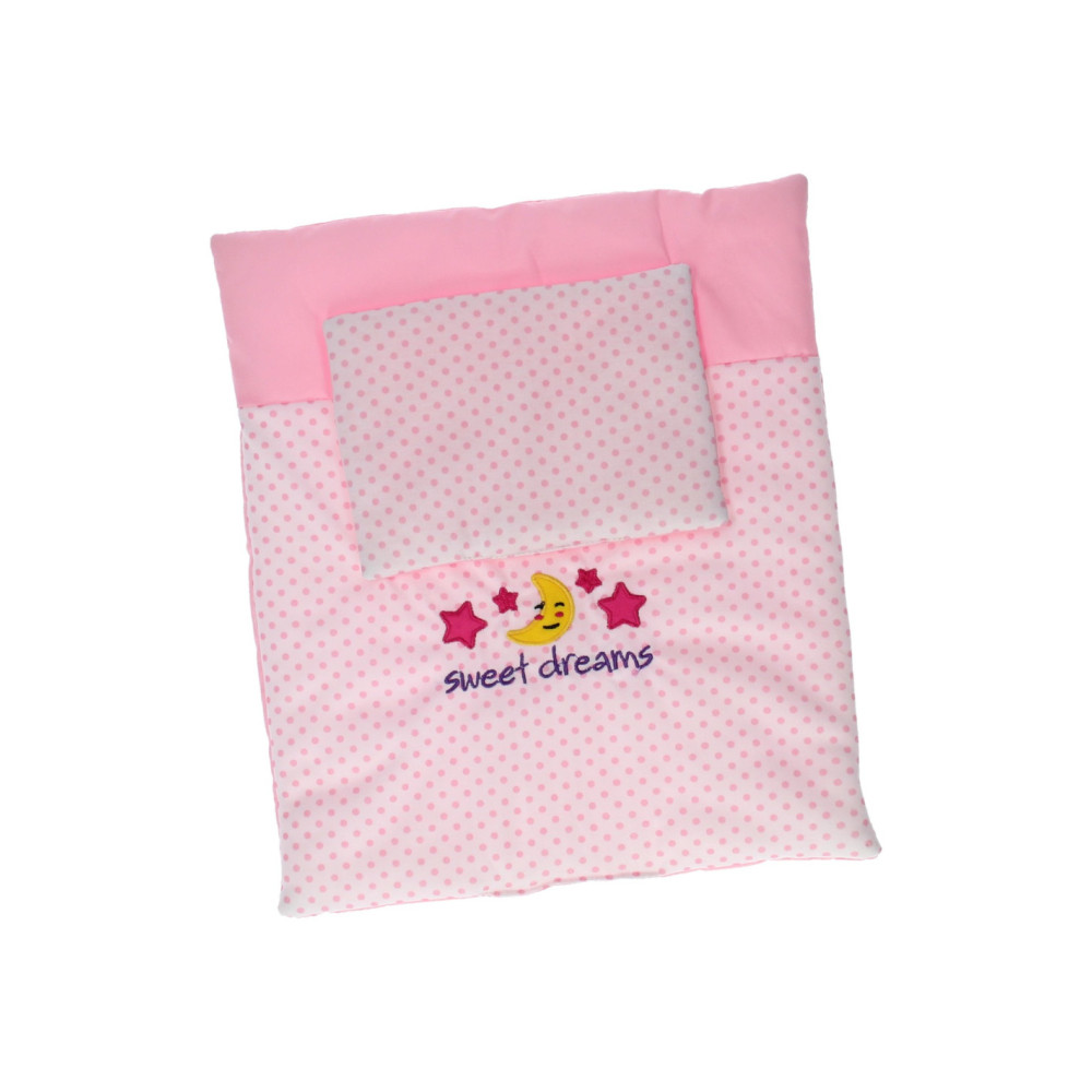 Poppendeken en bijpassende kussen, geschikt voor in een poppenwieg of ledikantje.