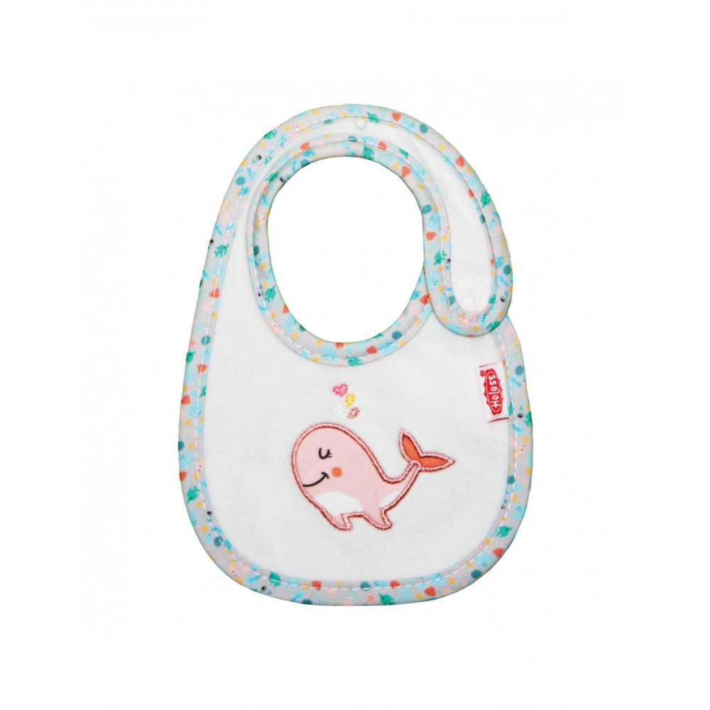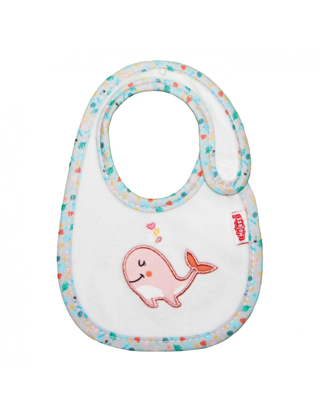 Witte/gestipte poppenslab van Heless met koraalrode walvisprint. Gemaakt van zacht velours met klittenbandsluiting. Geschikt voor kinderen vanaf 18 maanden.