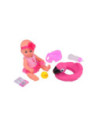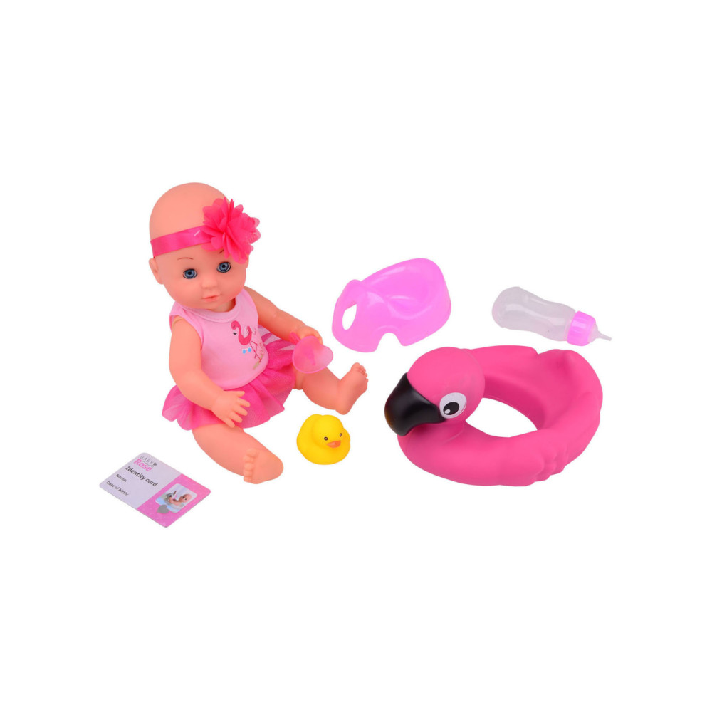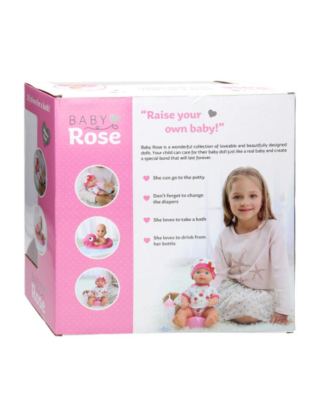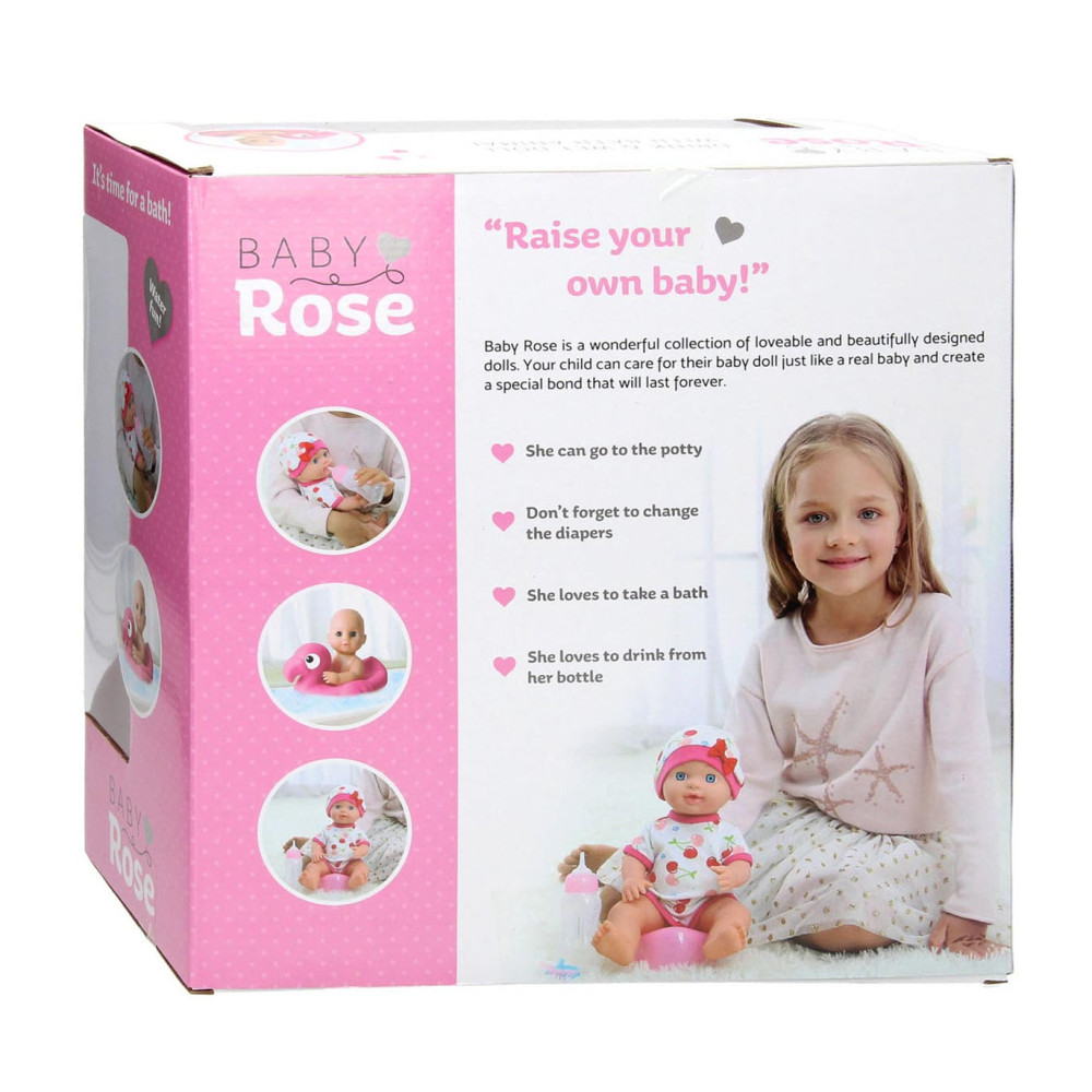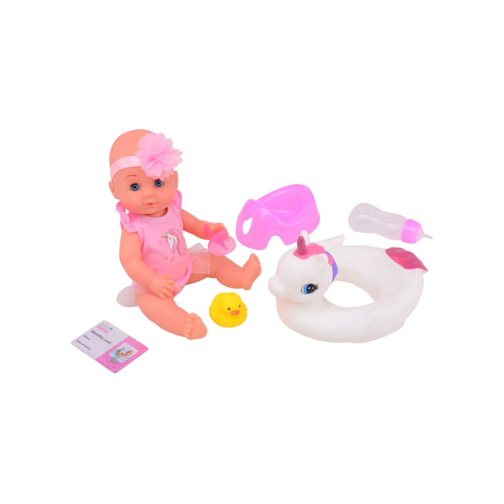 Baby Rose pop van 30 cm groot, inclusief accessoires: potje, flesje, badeend, zwemband, speentje, haarband, badpak en ID-kaart. Geschikt voor kinderen vanaf 3 jaar oud.
