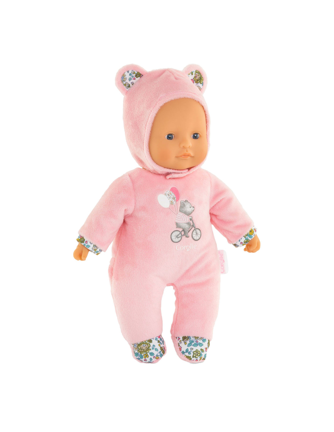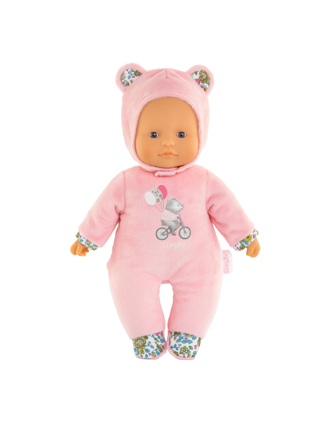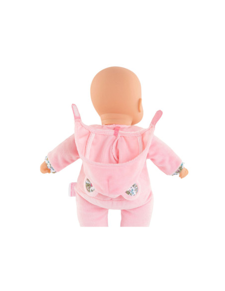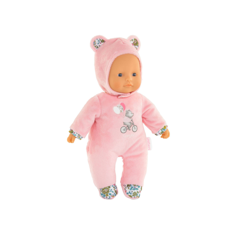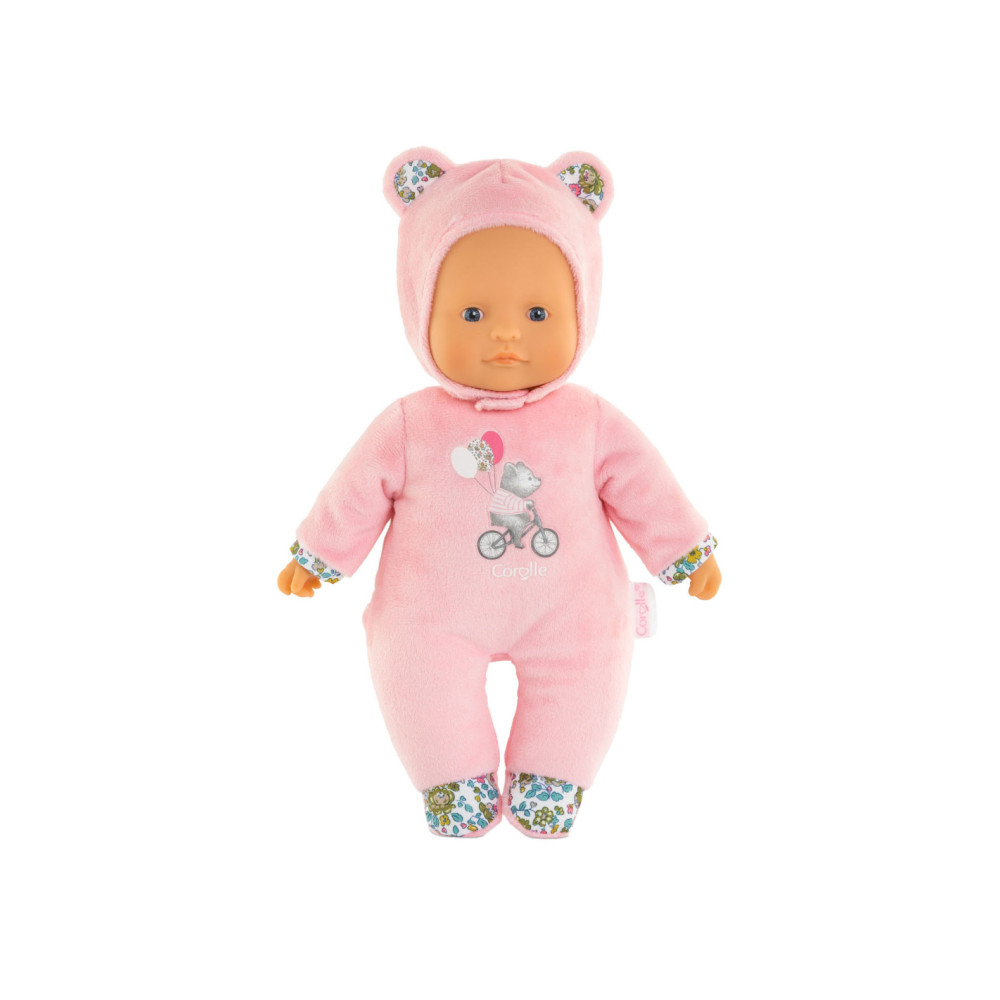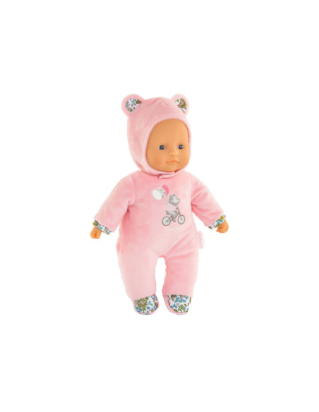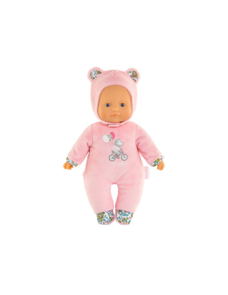 Knuffelpop van Corolle met een zachte, roze outfit met berenoortjes en een gezicht en handjes van vinyl. De pop heeft de kenmerkende Corolle vanillegeur en een label voor een naam/telefoonnummer. Geschikt voor kinderen vanaf 9 maanden oud.